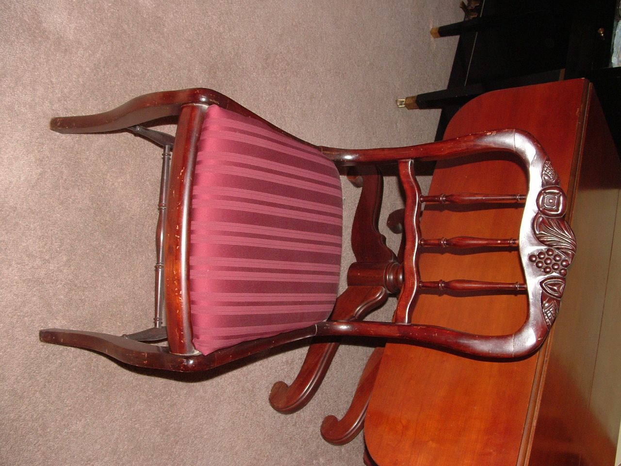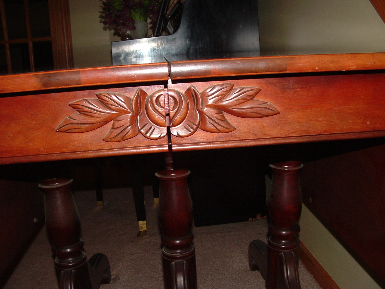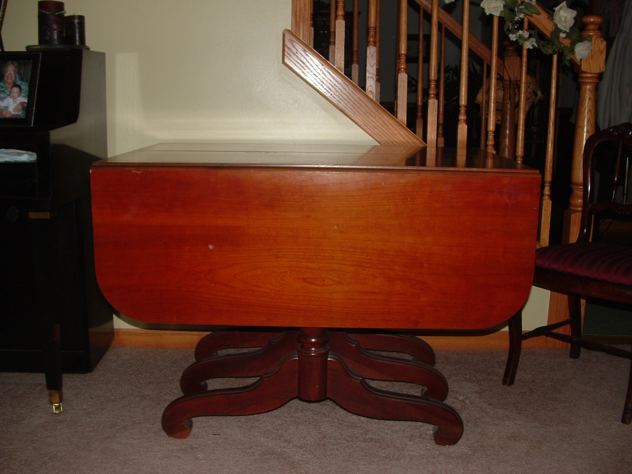 A whole suite of furniture that matches with carved handles and drawer handles, drop leaf table with 2 leafs that extends to seat 10. Matching buffet with 4 drawers all dove- tailed and 2 cabinets, also matching end tables with 3 drawers dove tailed each and matching carved handles.