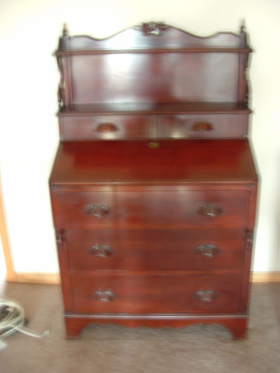 A Queen Anne style drop leaf writing desk with 5 drawers and upper shelves and matching carved handles and ornate scrolls all dove-tailed.