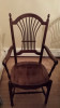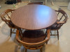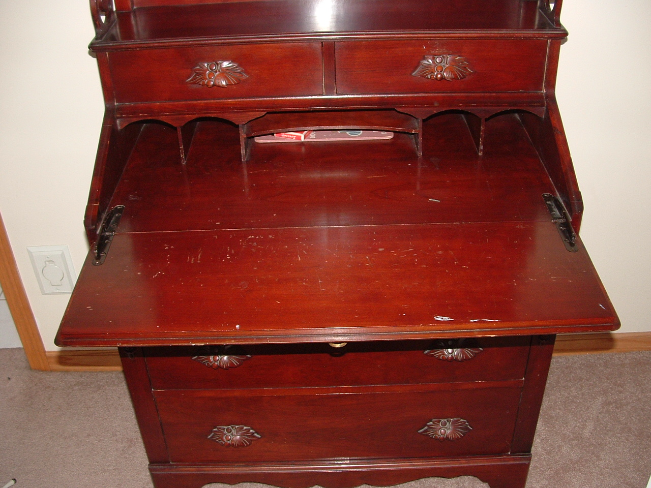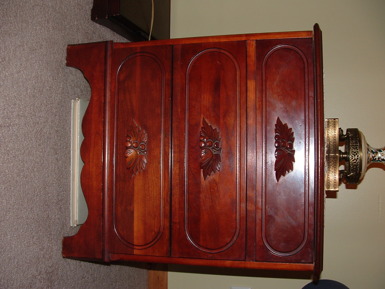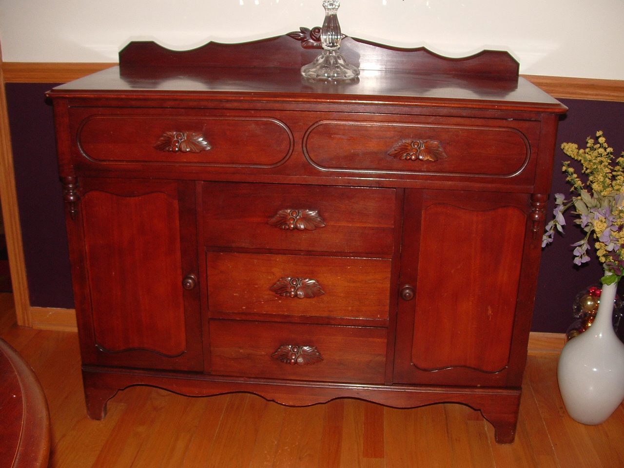 A full suite of matching carved furniture. Carved Drop leaf table with 2 leaf inserts, marked Walter of Wabash #4, 4- carved matching chairs (fruit) with horse hair stuffing, Carved Buffet with dovetailes, 2 cabinets and 4 drawers with carved handles and carved backsplash. 2- carved handles end tables with 3 drawers each with dovetails. 1- Carved Drop-leaf Secretary writing desk/hutch with 5 drawers and matching carved handles.