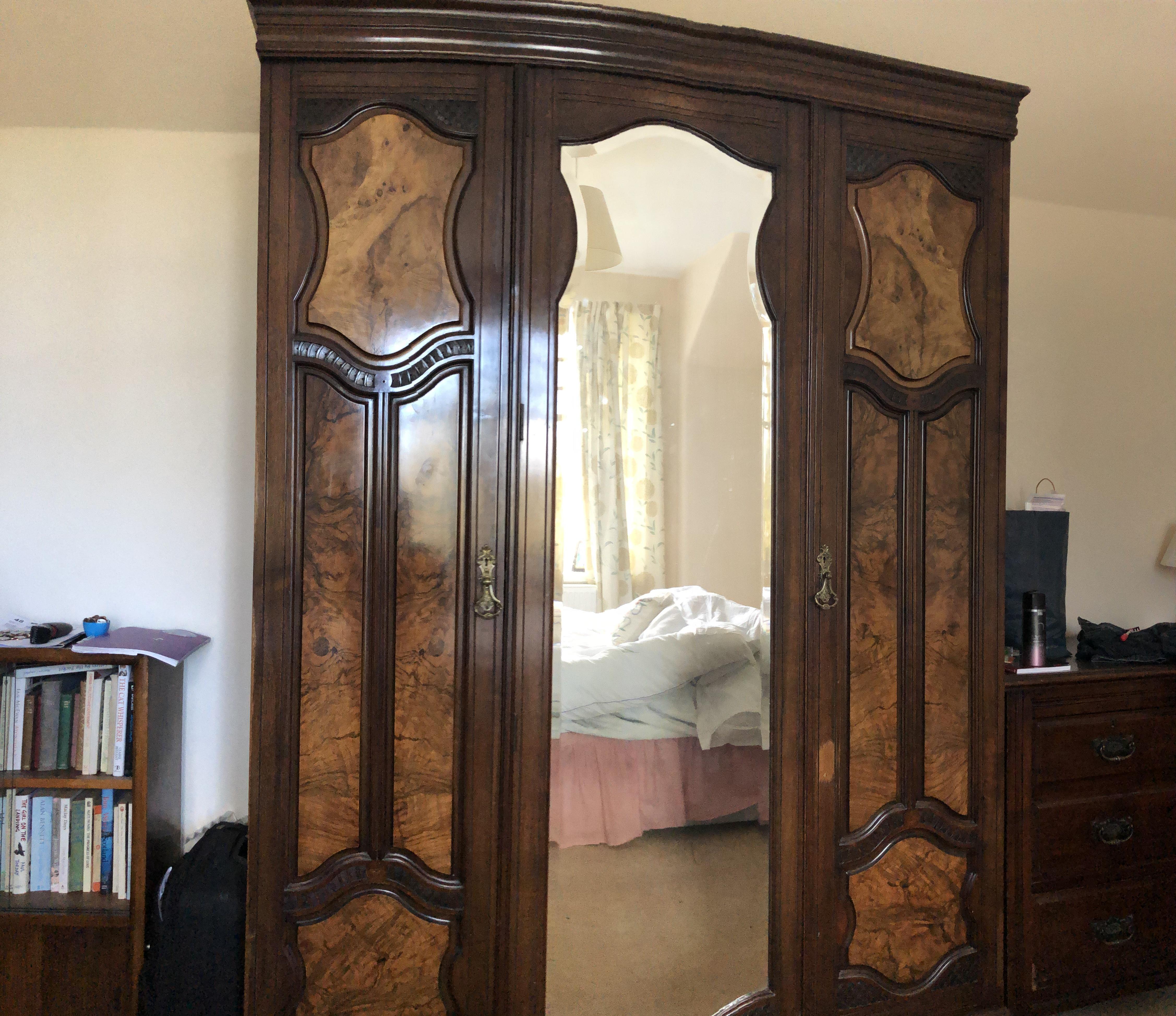 Large triple wardrobe with walnut inserts and full length external mirror. In very good condition
