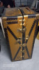 It has 2 mirrored doors to hang clothes in on each end . In the middle of them it has a door with glass on top that you might put a hat in . Under that is 4 drawers . Across the bottom of the whole thing is door that opens out .