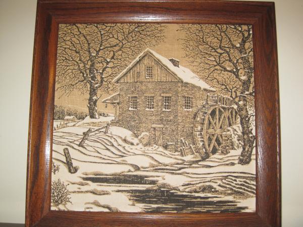 A painting of what appears to be a house on a snow winter day with a some sort of big wheel attach ot the side. also two bare trees on either size and lots of snoww all around