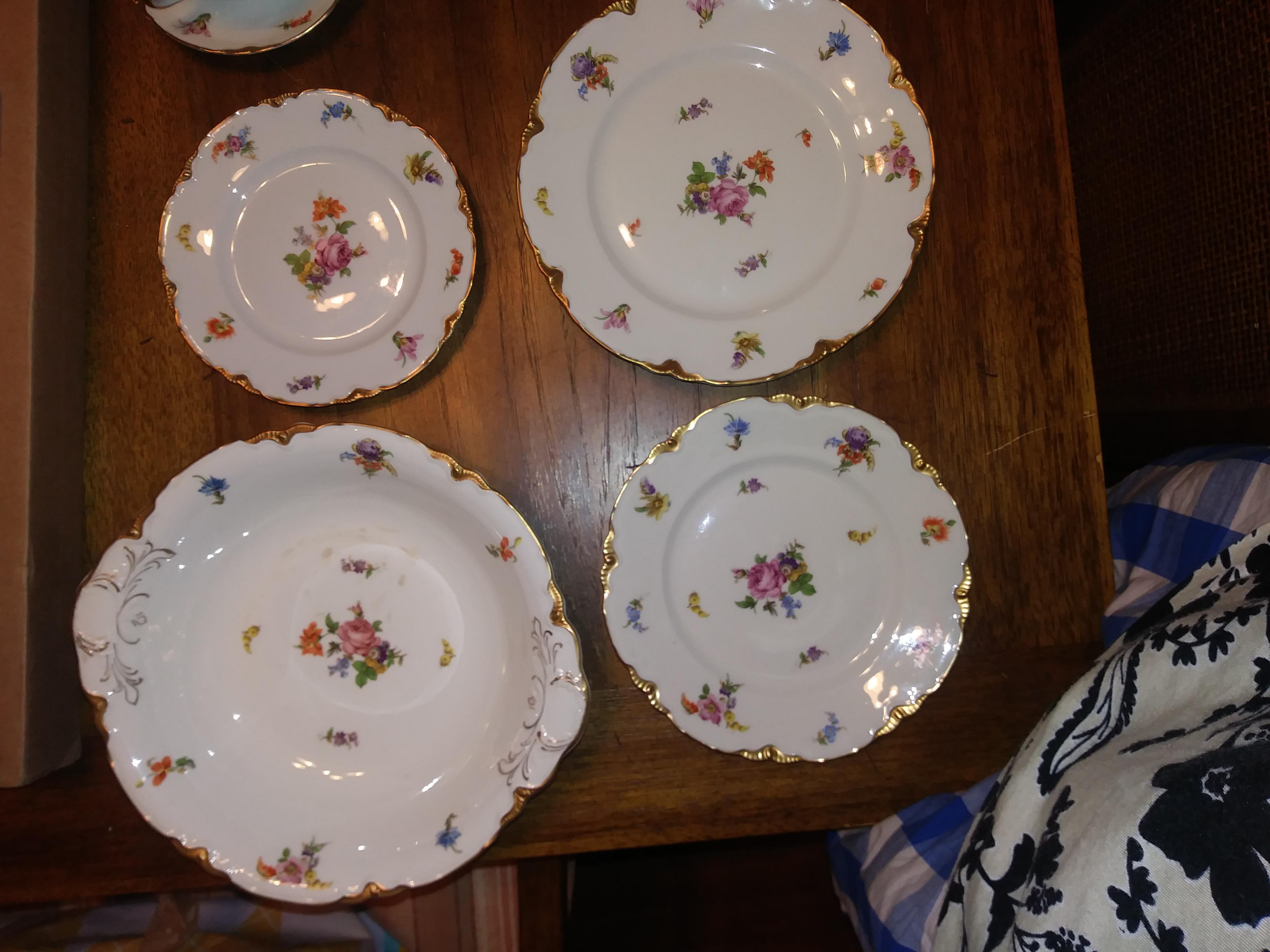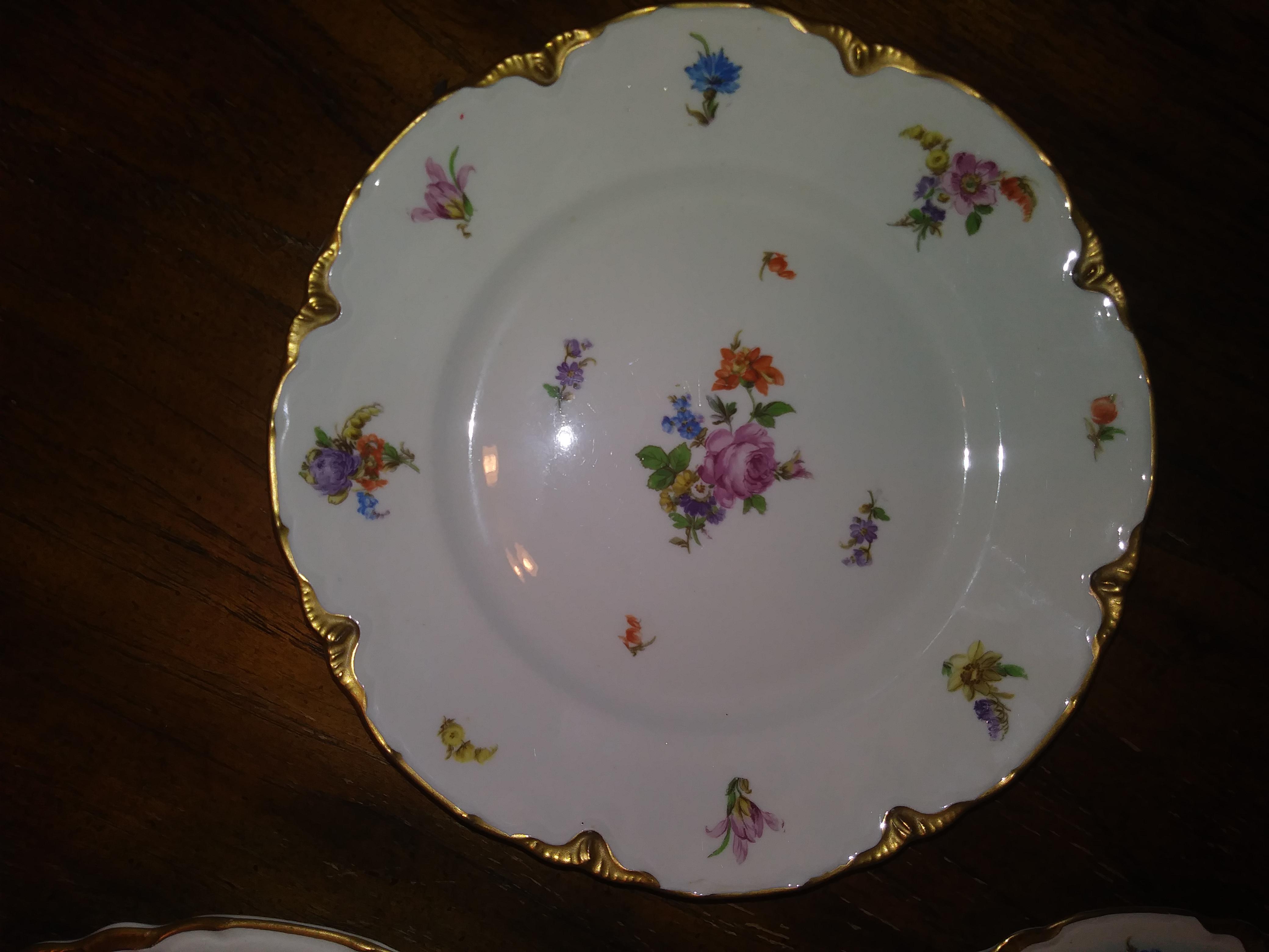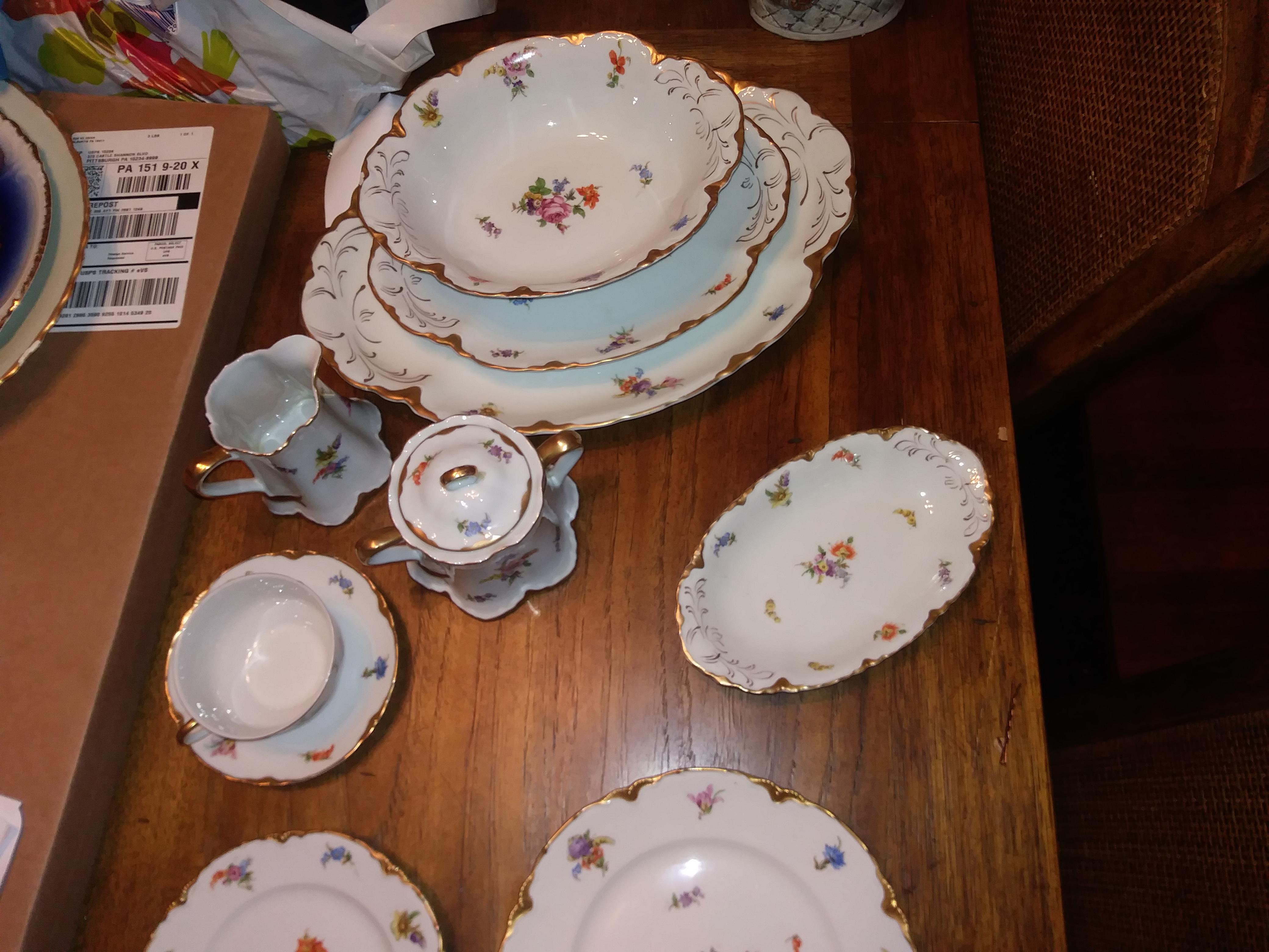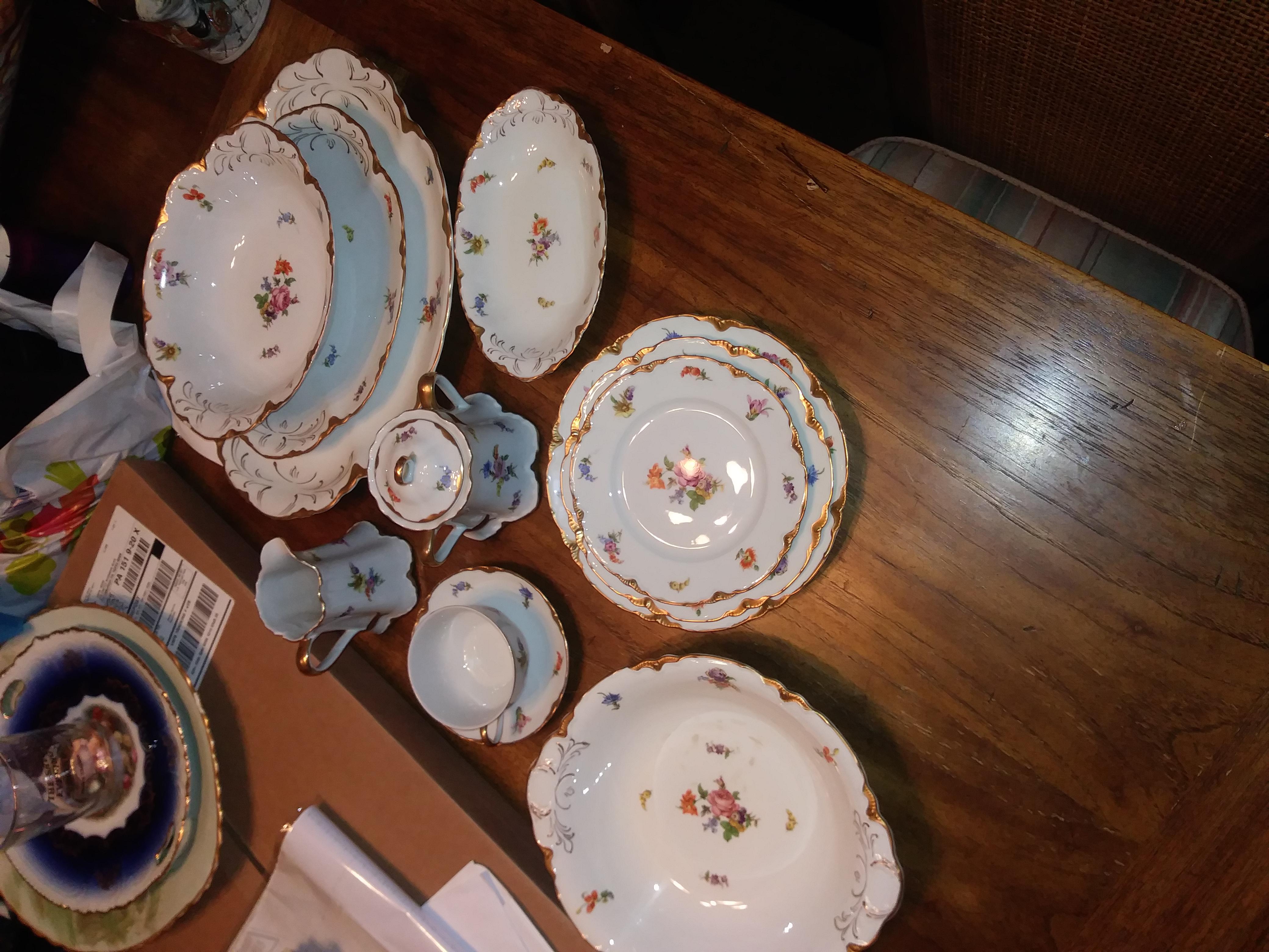 Set of Warwick china Dresden design C2000. Flower pattern with gold trim. Also marked with the Warwick stamp on the back of the pieces. It was never used and properly stored in a China cabinet, so its in excellent condition. It was my grandmothers so I'm not sure of the age or value. Its a complete service for 12 set with serving dishes and platters.