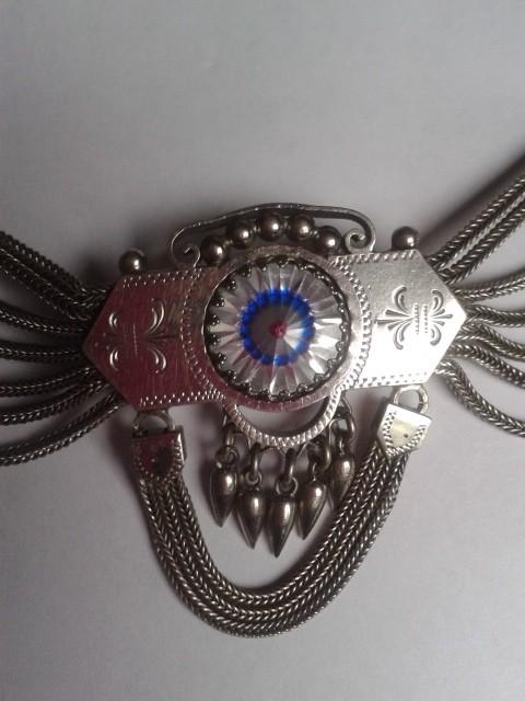 This item may have been purchased in another country but I am not sure and there is nobody in my family to ask that would know since they are all deceased. My mother always told me it was a watch fob...The entire thing is silver in color with very detailed swag chains. Upon looking at the glass or crystal looking prism, it appears that there is a blue dot on the point in the center and a red ring inside. When turned over, the opposite is true (the dot on the center point is red and the ring is blue.) The only kind of markings that I was able to see is on a ring near the end and it says "PUR PRIMA GARANTIE"