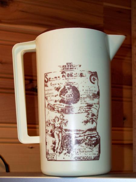 Plastic, with brown lid, cream-yellowish in color, brown decal on it with the words 1897 Sears Roebuck Catalogue, Sears.Roebuck and Co., orignated with a capital of $150,000.00, Paid In Full, Reference By Special Permission, Natl Bank Of The Republic Chicago,Metropolitan Natl Bank, Natl Bank Of Illinois, German Exchange Bank New York, Cheapest Supply House on Earth,Our Trade Reaches Around the World, Authorized and Corporated Under the Laws of Illinois, Consumers Guide, Catalogue No. 104, 82 to 96 Fulton, 73 to 87 Desplaines, J17 to 31 Wayman Street CHICAGO, Ill. U.S.A. Has a picture of the horn of plenty, a woman, the earth, house and barn. The print is on both sides of the pitcher.