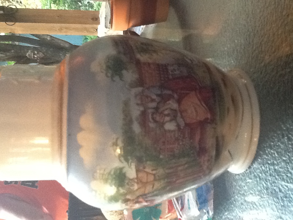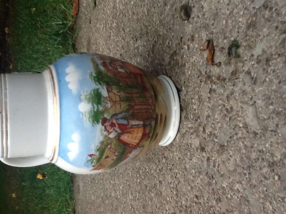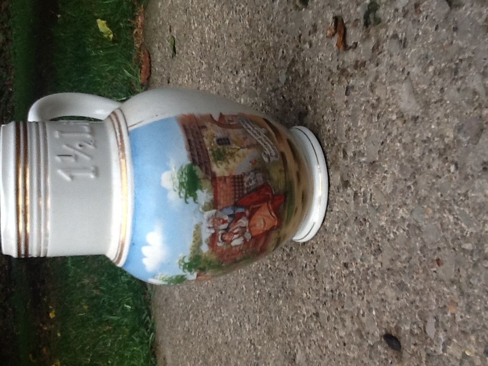 I have a water pitcher that is all white with gold rings around top and bottom of pitcher that has 1 1/2 lit. On the neck.On the front it has a picture of a village with a man and women on left side they have old clothes lady has a long dress with a apron on and a funny white hat on.man has boots on up to knees on the right side is two woman on sitting and one standing both have a long dress and aprons on and funny hats on.on the left side it says prodana nevesta Verne nase milo anti on the right it says prodana nevesta rozmyslisi Marengo.This picture is in color.