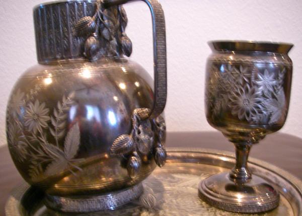 I don't know how to judge it's condition, the tray is slightly warped with some small scratches. The pitcher has one small, shallow dent. The cup's lip is slightly out of round. Unpolished.