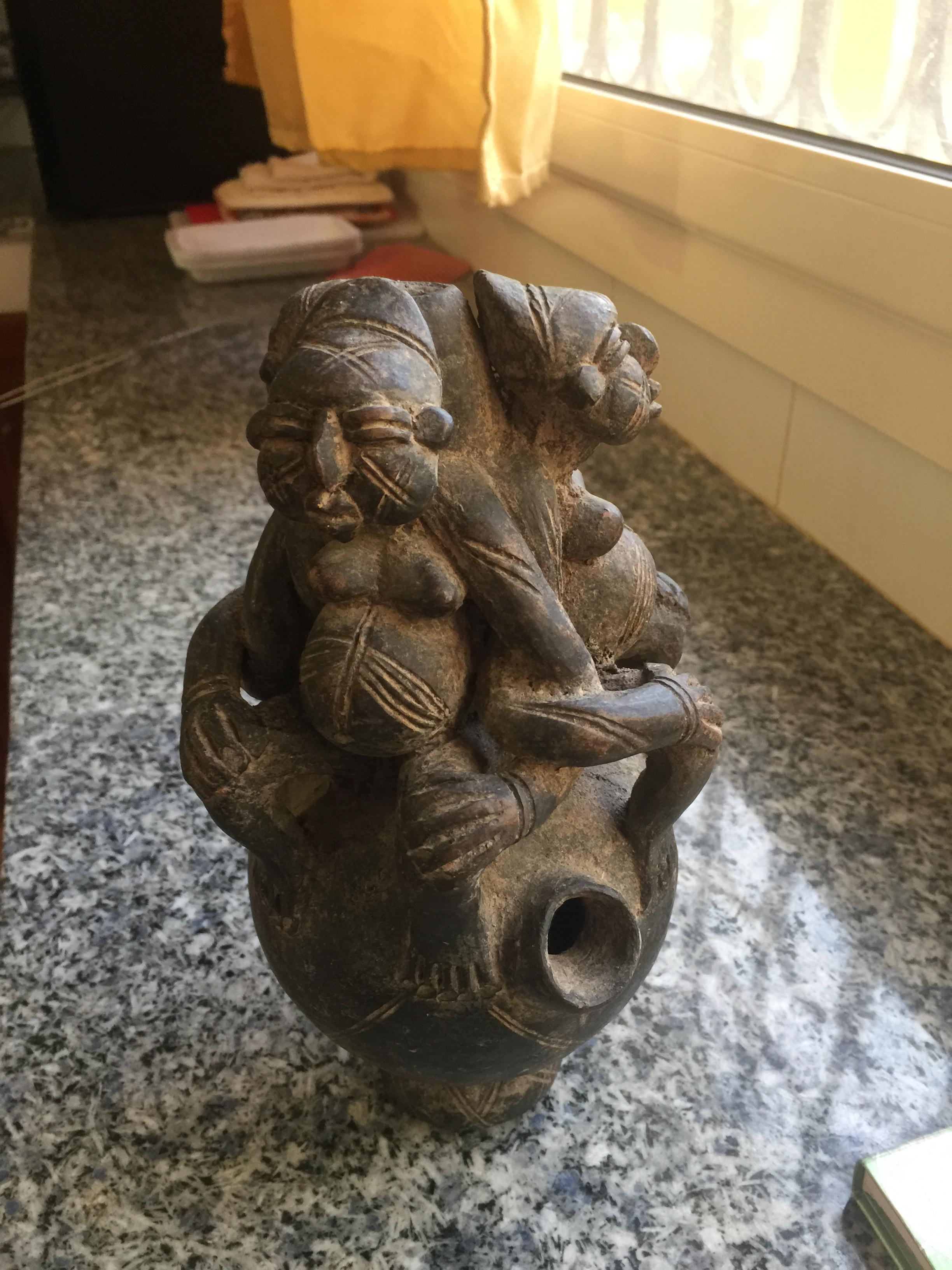 This water pot is from south east Mauritania, and is supposed to be at least 100 years old, possibly more. It was used by the village elders for a fertility ceremony, the young women wanting to get pregnant drank from the pot.