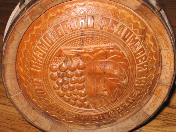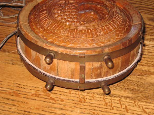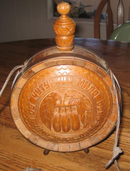 Its a wood barrel type container, has wood slats around with two strips of brass over it and a thin leather strap running under the brass to carry on your shoulder. The wood has hand carved grapes and a leaf on one side and leaves and some kind of fruit on the other side, both sides have oriental writting around the picture, the spout also has decorative carvings and it stands on 4 brass pedastil feet. The leather strap has been broke in three different places but have all been tied back in knots, all three knots look the same as if they were tied by the same person. The varnish is fading a bit, other than that it is in excellent condition. I would like to know what it is and what its worth. Any information would be great its such a nice piece.