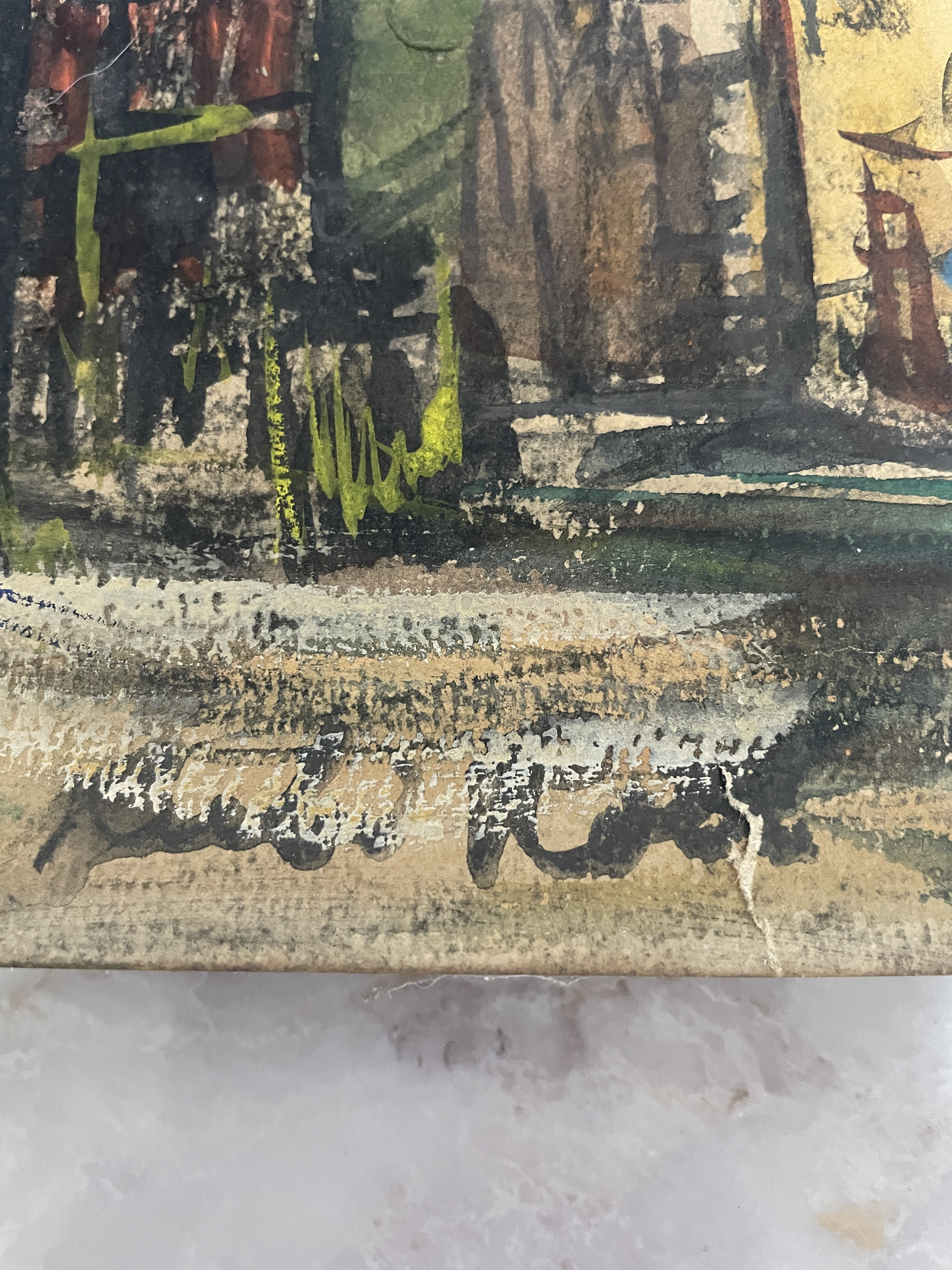 The painting's style suggests it may be from the mid-20th century, based on the use of color and technique typical of that period. The materials used (watercolor on paper) are consistent with traditional methods employed by artists during that time.
