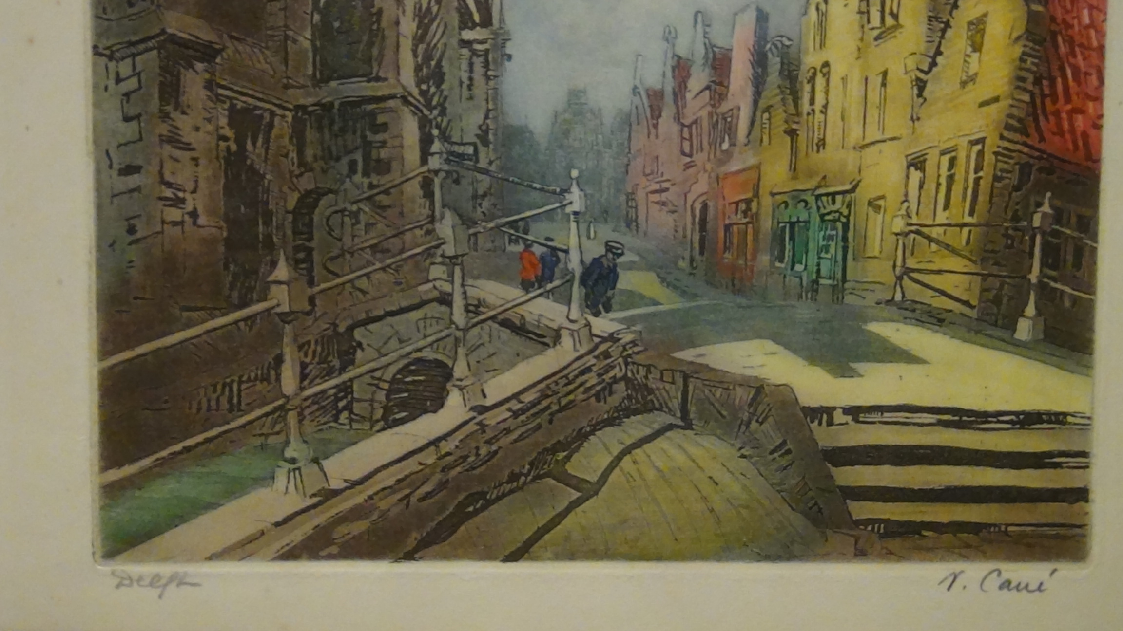 I have a water color that is marked in pencil "DelfL" in the bottom corner left and either N Carre, or V Carre in the bottom right. It is on thick stock heavy card, or thin board. At first I believed it was ink and waercolor but when I took it apart to clean the glass, The black appears to be heavily imprinted into the paper, then painted everywhere else with watercolor. Where the watercolor is the paper is ever so slightly wavy, but is not visible until out of the frame. It is beautifully done on 8x10 sheet and would appreciate any information you can give me on this print/artist/value.