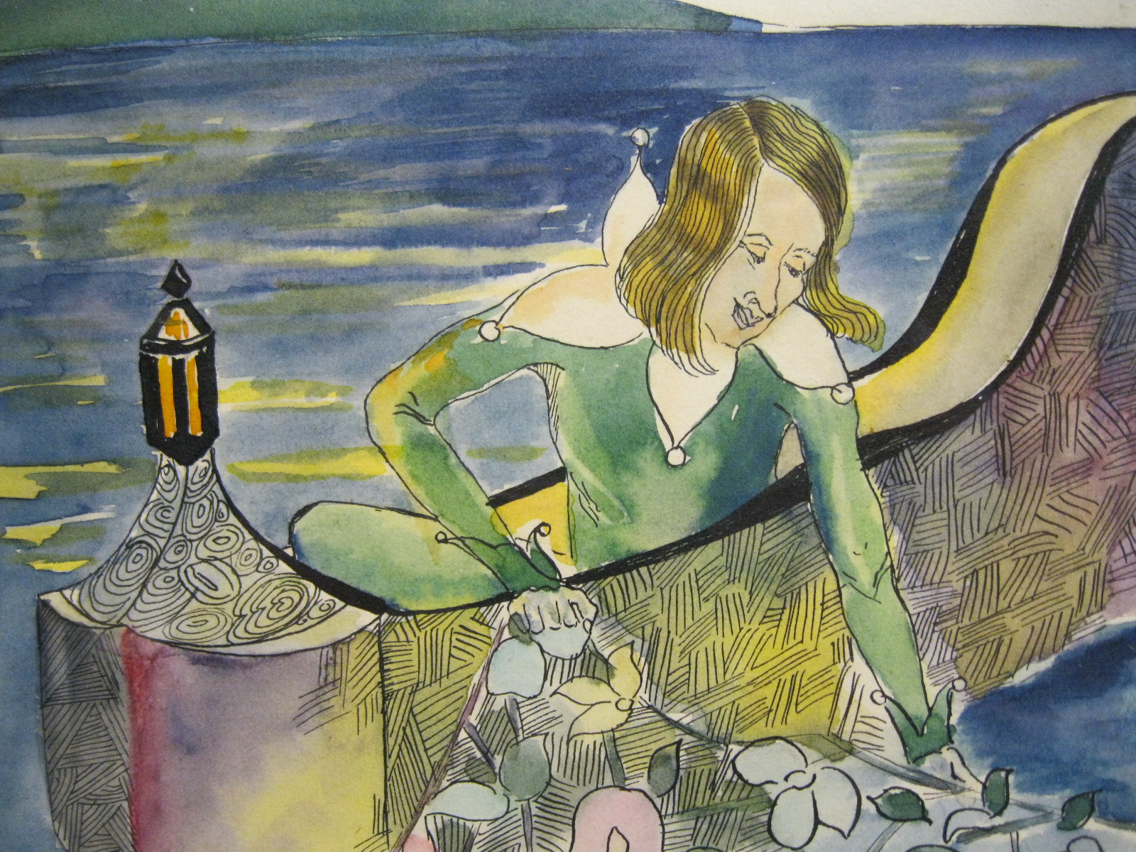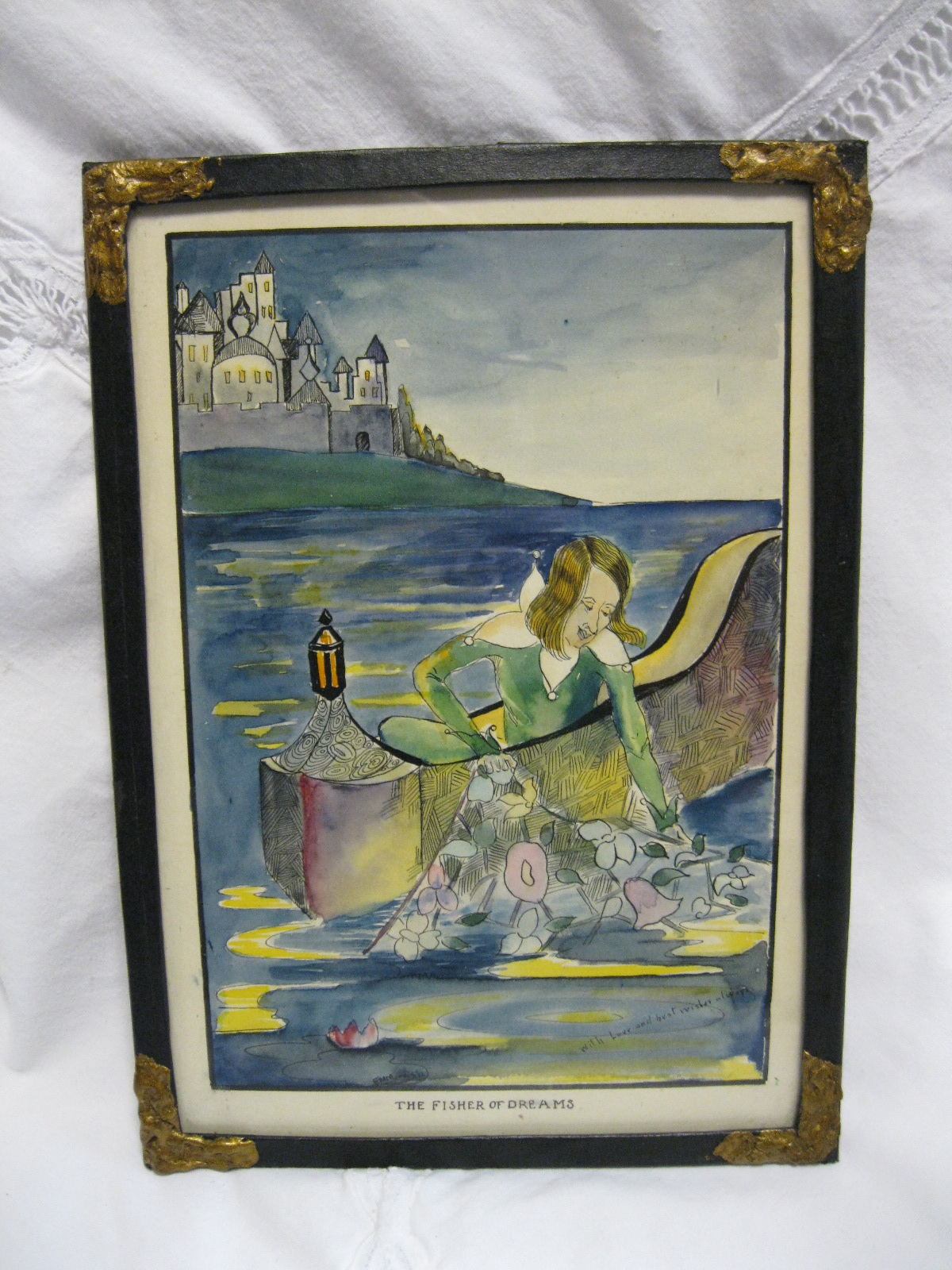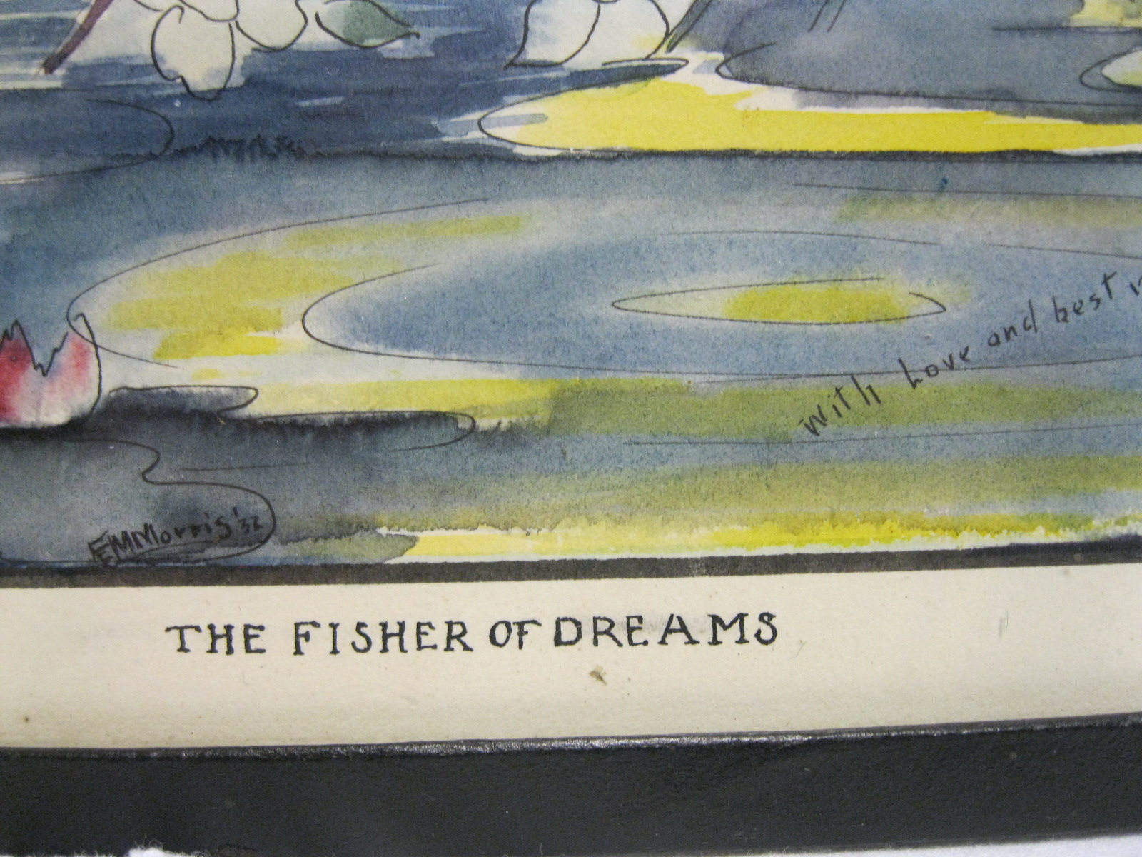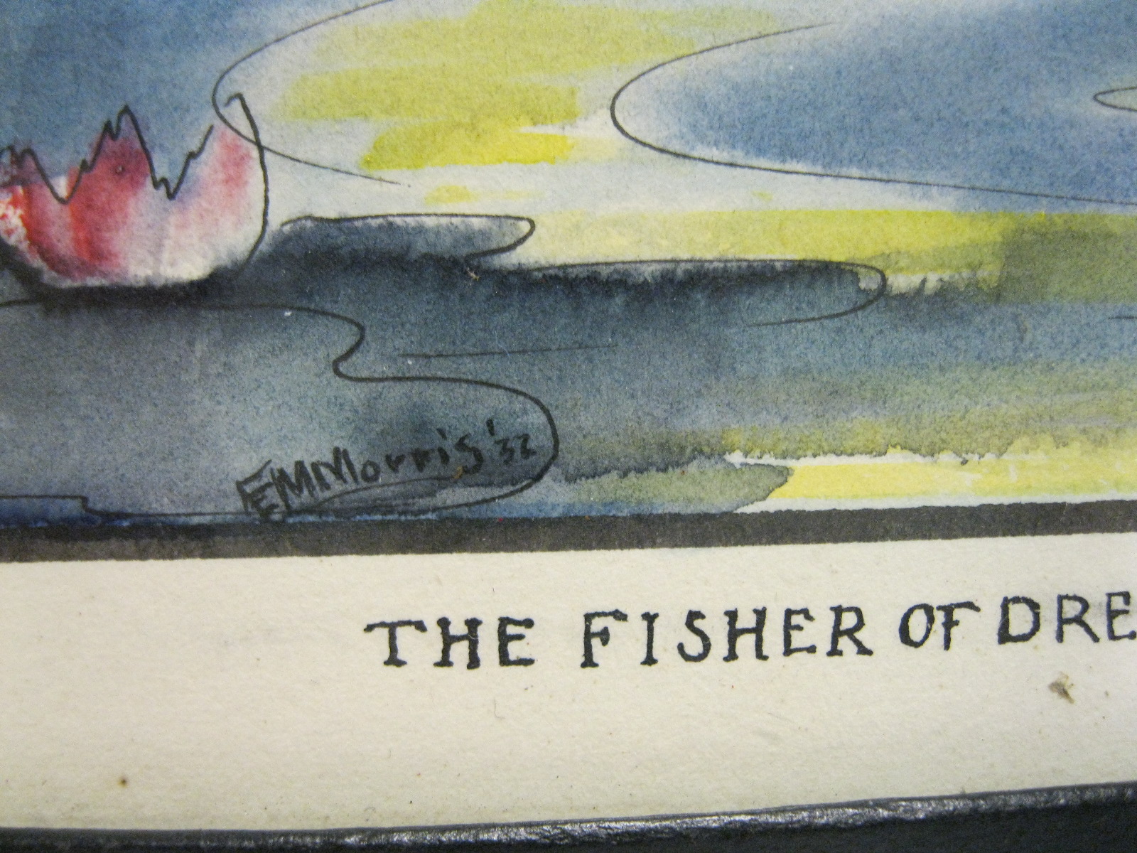 I have this piece or artwork from an estate auction. I cannot find out any info about the artist. It looks to be a watercolor on ink. Since I am not an artist, I'm not even sure about that. It is signed E M Morris '32, with love and best wishes always. Under the painting is "THE FISHER OF DREAMS". It is framed and measures 7 5/8" by 10 5/8". The frame looks to be made of some kind of black paper tape with painted gold soldering on the corners. The backing is some kind of hard thin board. Is this a watercolor on ink or could it be an illustration from a book that someone just signed or watercolored? I have searched everywhere and cannot find out anything. Thanks for any help you can offer.
