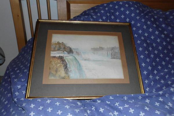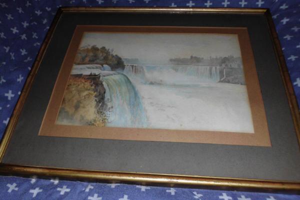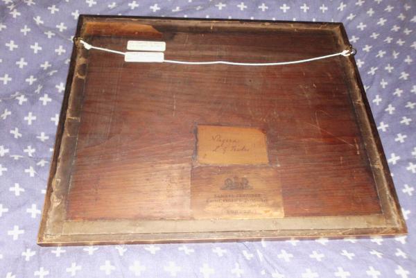 Painting was purchased from his brothers estate, Admiral Sir Wilmont Fawkes in 1925-6 in Crowborough, Sussex England. The painting seems to be a gift from sibling to the other, Still in original frame with label from the framemaker whole and intact. I can not tell if the actual painting is signed as there is the 3" matt surrounding a portion of the painting. In remarkable condition with no spotting on the painting whatso ever. Files are to big for close up of labels but they are original to the framing of the painting