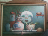 Typical Morrow painting shows large painted Native American pot in foreground along with several ears of multicolored corn. Background shows arid landscape with distant mountains and a full moon.