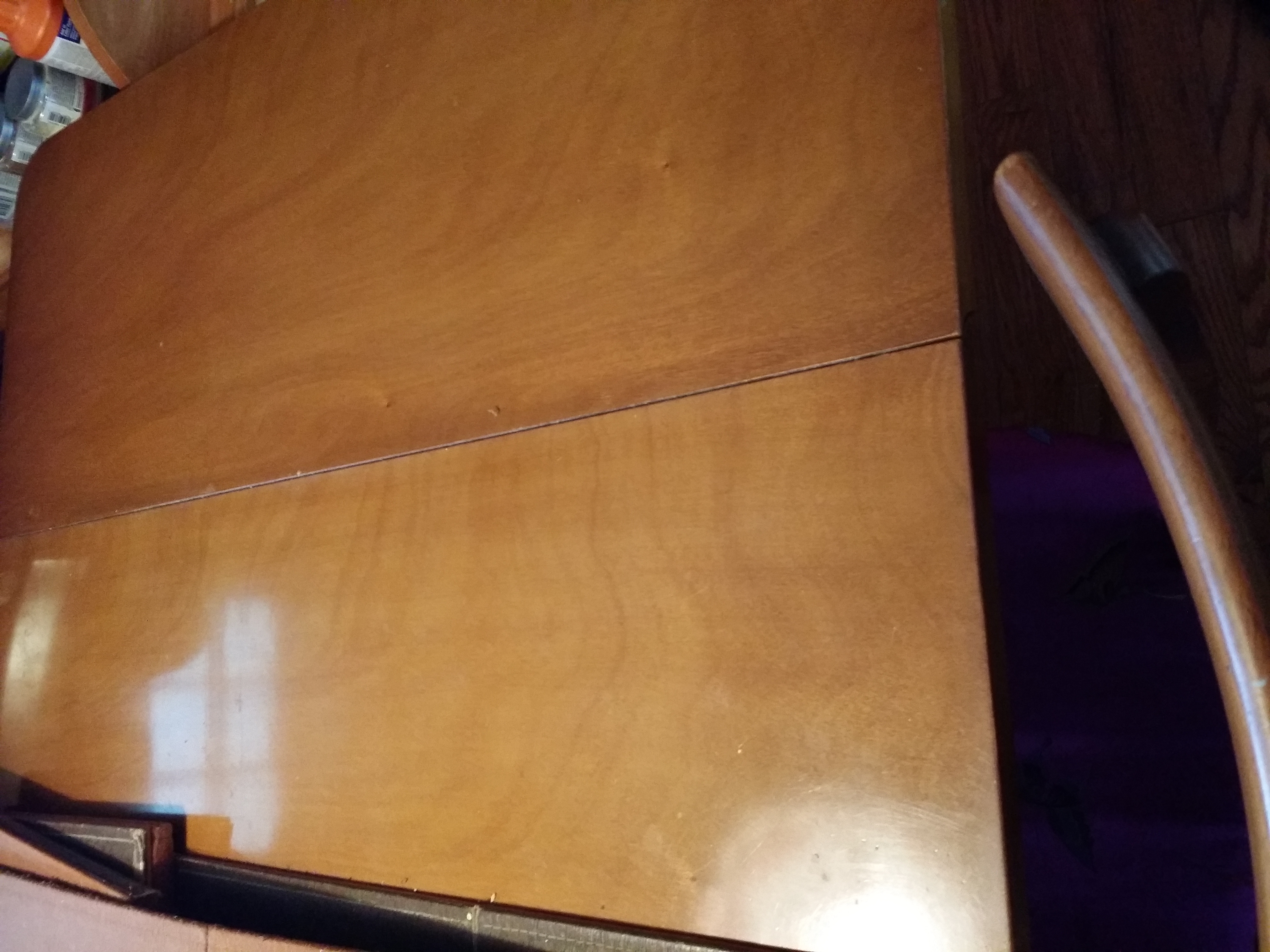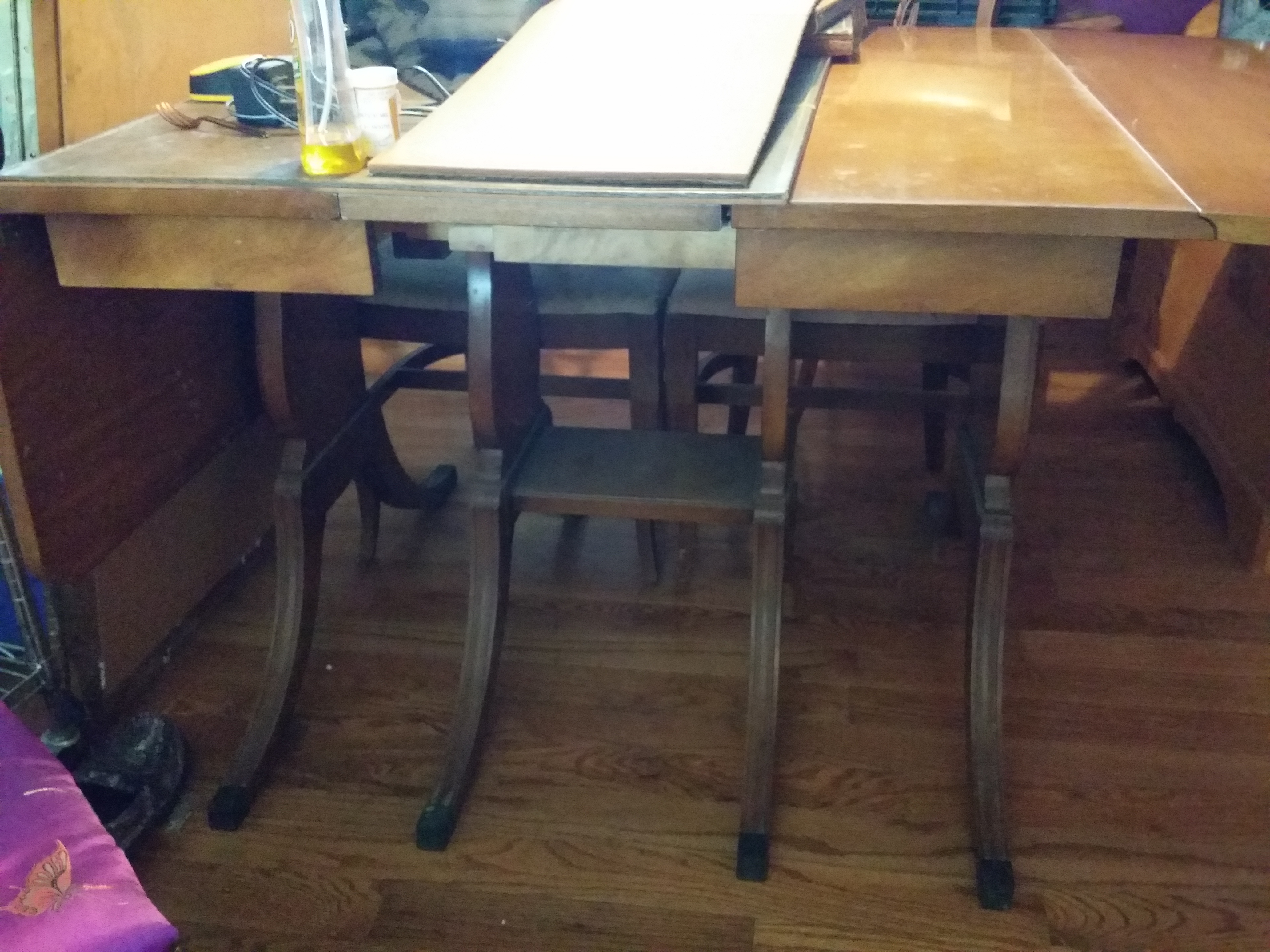 It is in EXCELLENT condition. There has been a leather protector covering the table and the top is in perfect condition. It is stamped with the Watertown slide from Watertown Wisconsin trademark stamp. 4 chairs that match the set. Seats need to be reupholstered.