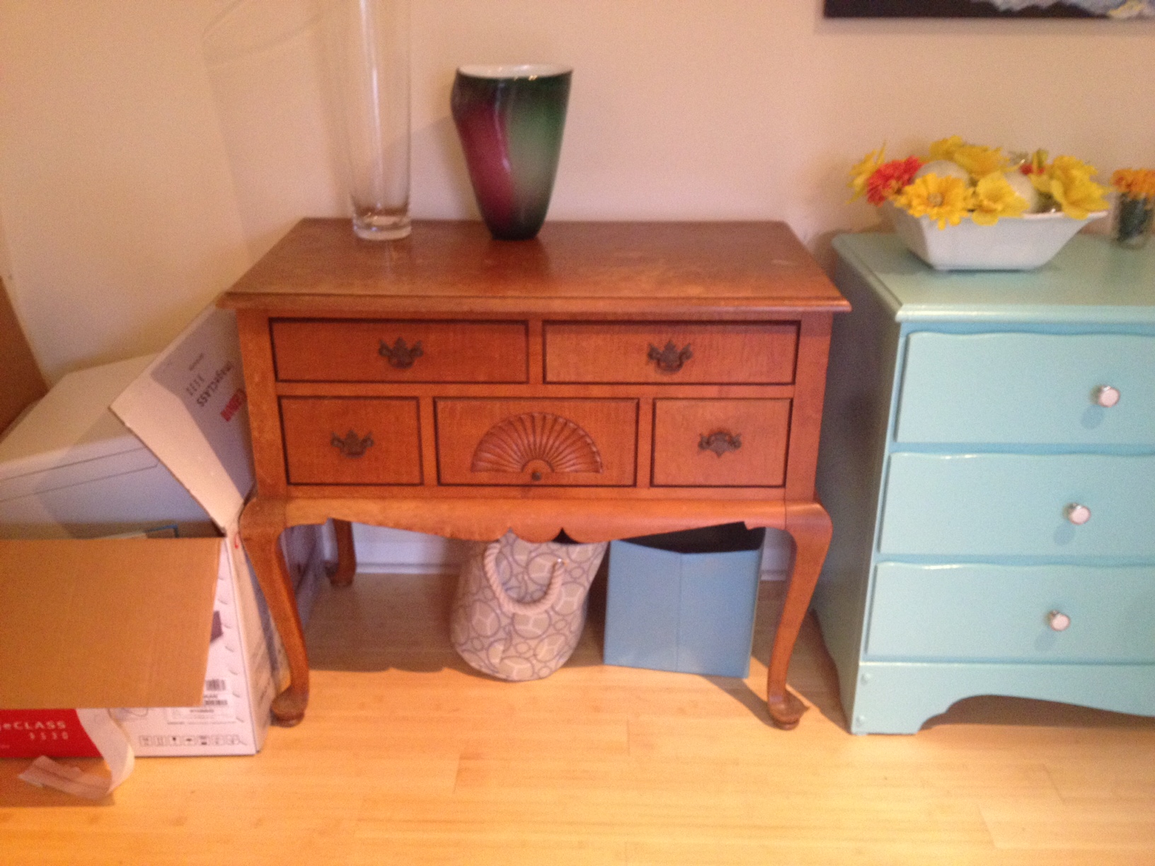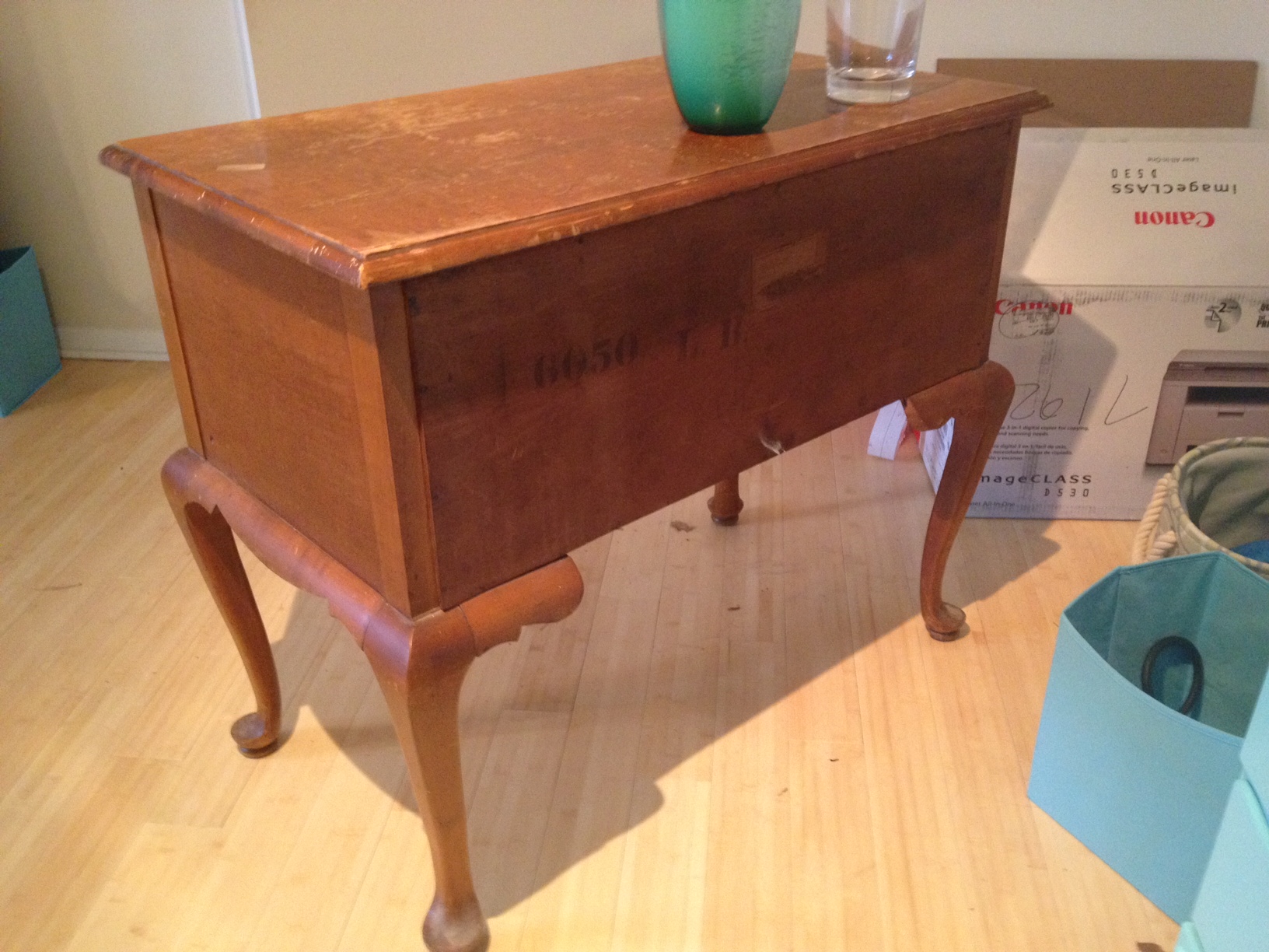 Bought this piece of furniture off of Craigslist for $80. The man said it came with his house but he did not know how old it was. He said he did some research and discovered it was made by the Watkins Brothers Inc which was a furniture business out of Manchester, CT. The family business existed from around the 1880s to the 1980s. This table is in very good condition but has some sun damage on the right side where the wood is faded. The drawers are all dove tail joints and the table solid wood.