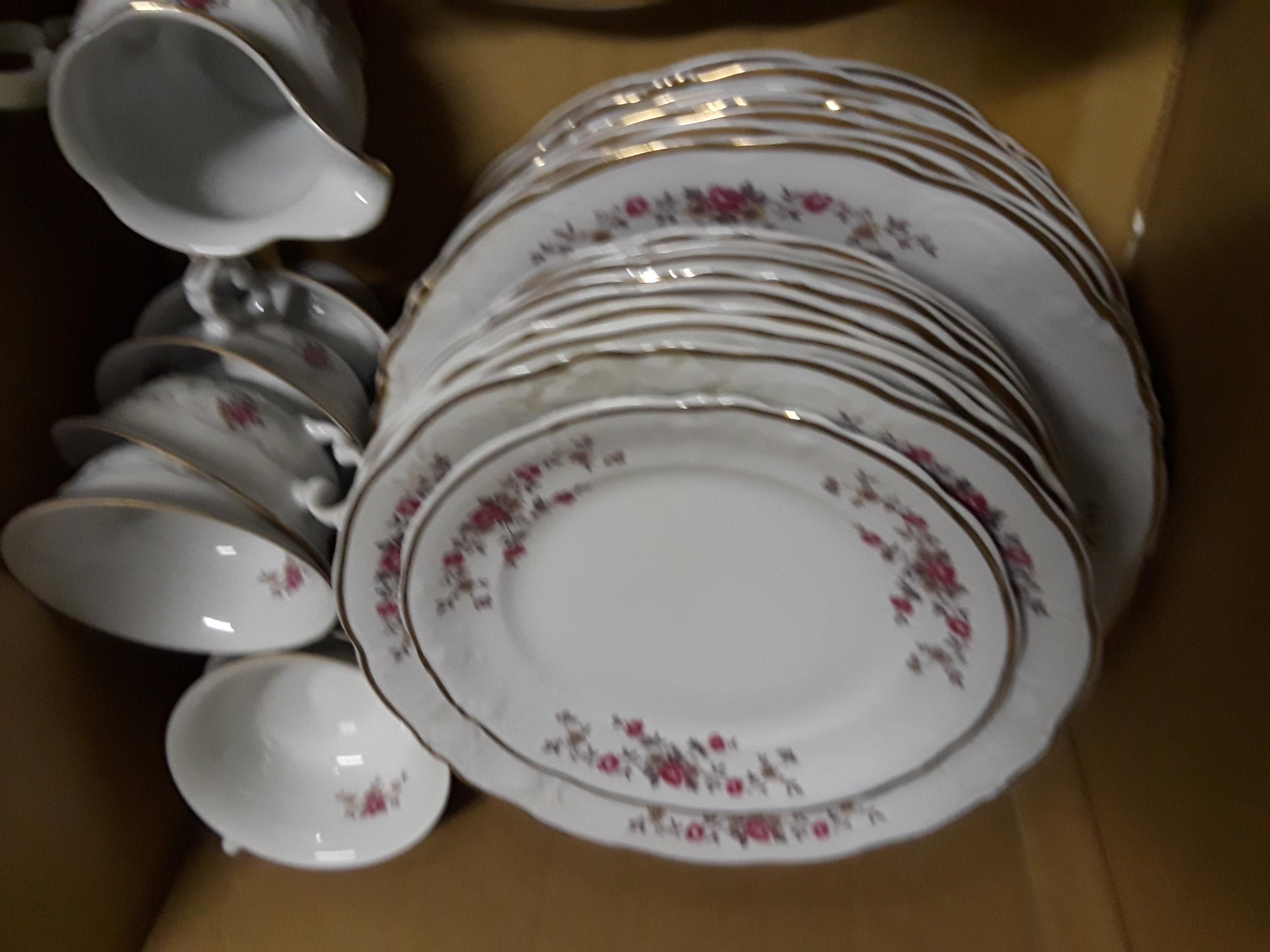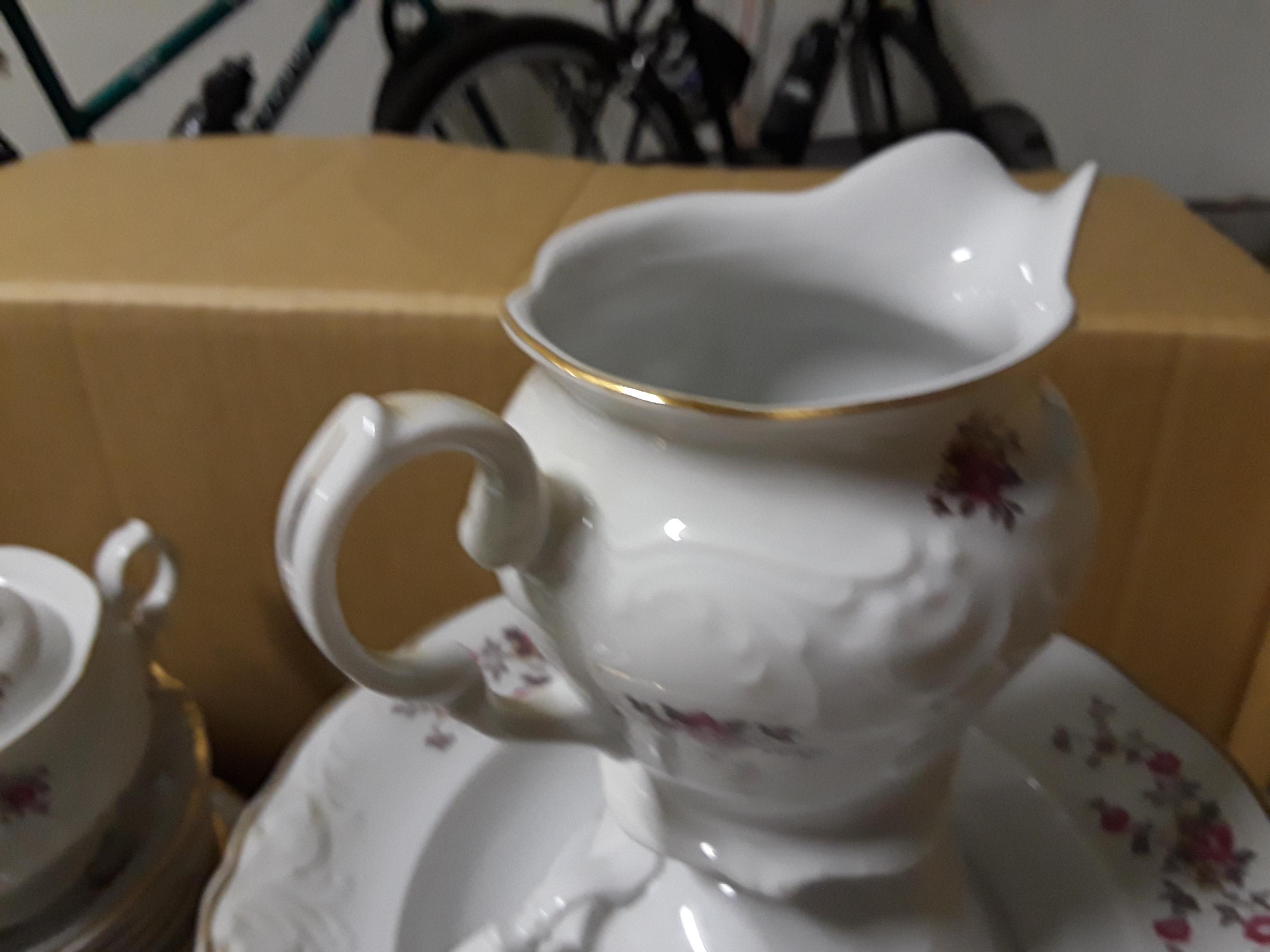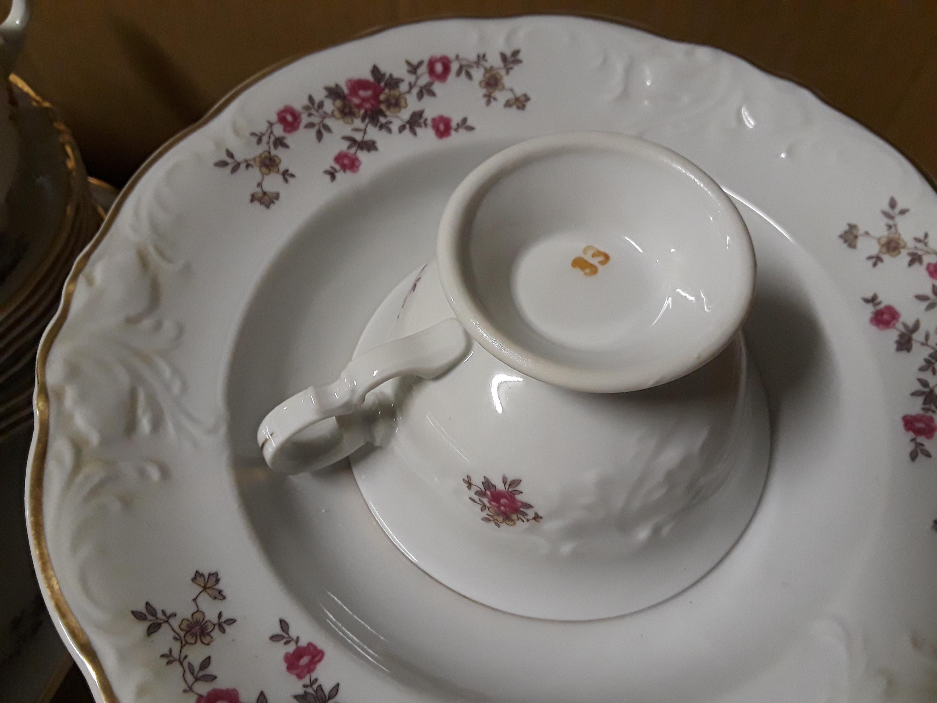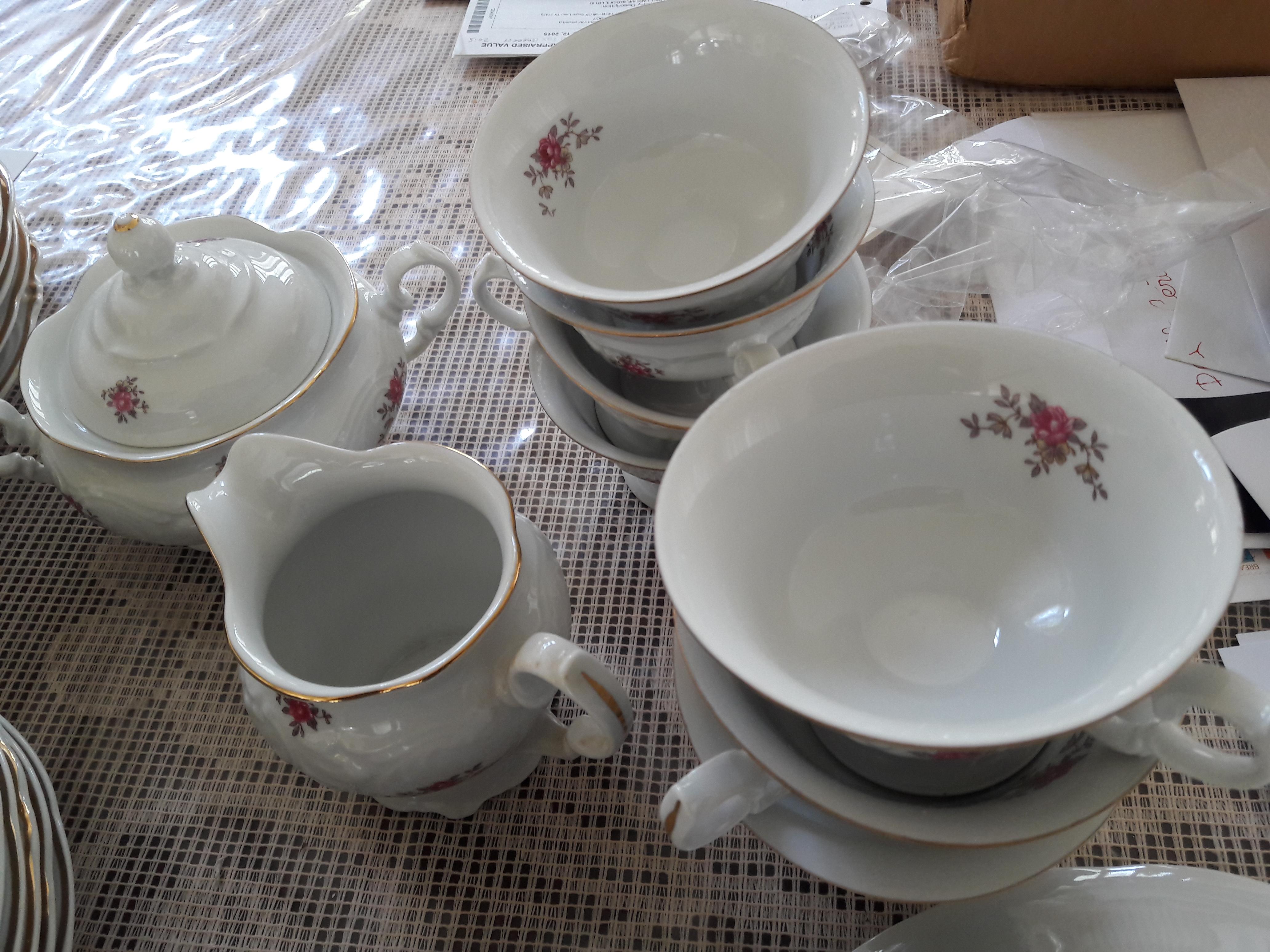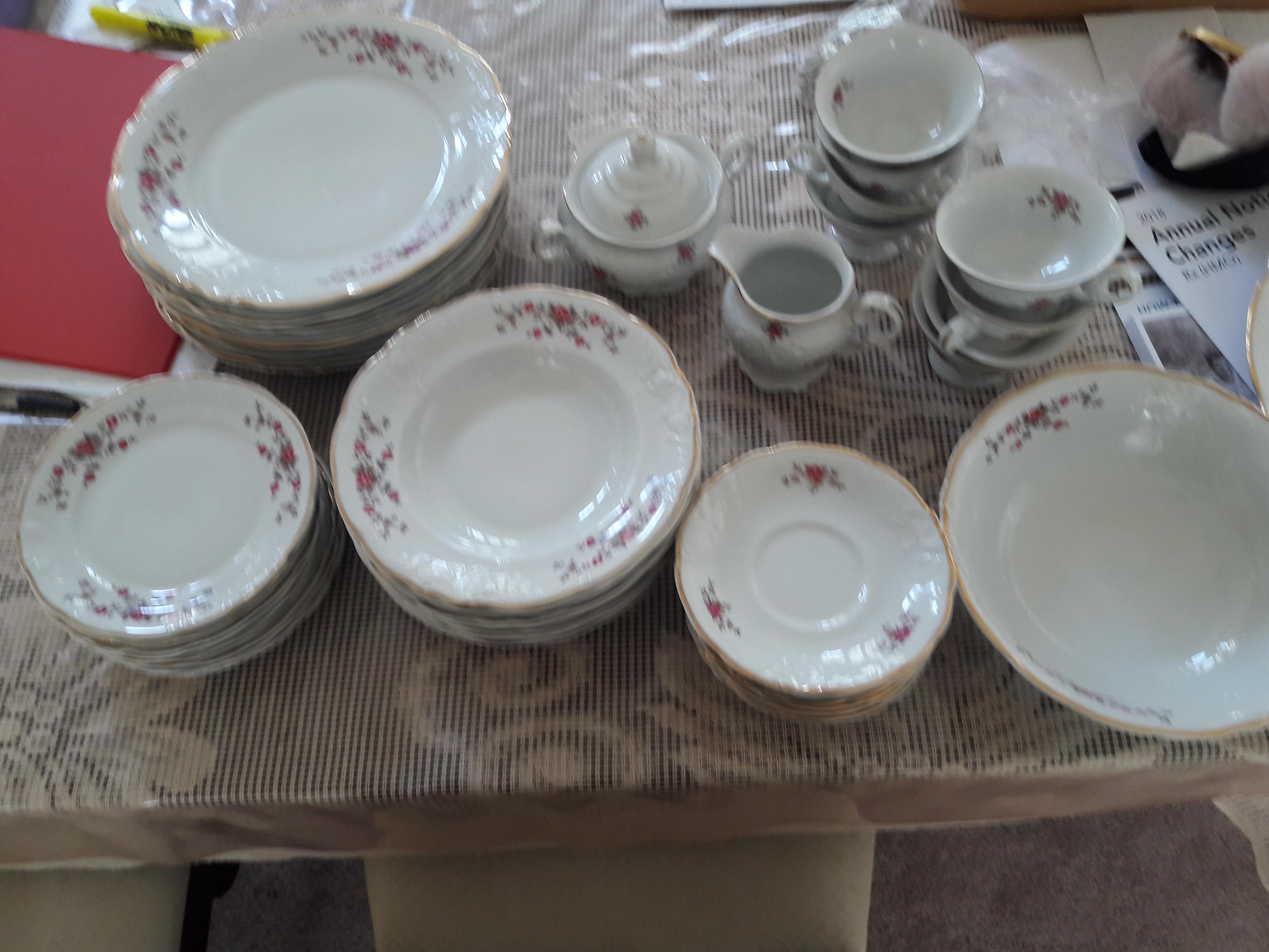This is an unused set of China. Sat in a China cabinet. It's service for 8 plus a server bowl and platter and tea and sugar.