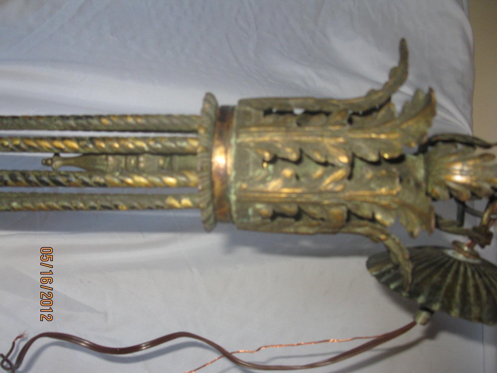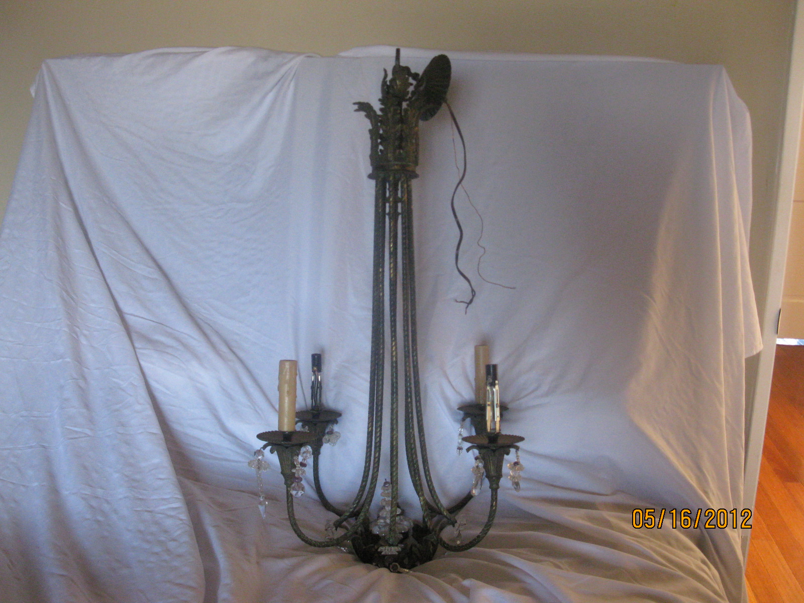 This chandelier is 36 inches high and about 18 inches wide from candle to candle. It has a crown with leaves at the top. Some of the prisms are glass, some are missing, and some, like in the center area at the bottom of the chandelier, are plastic. They are arranged like fruit (the plastic ones).
