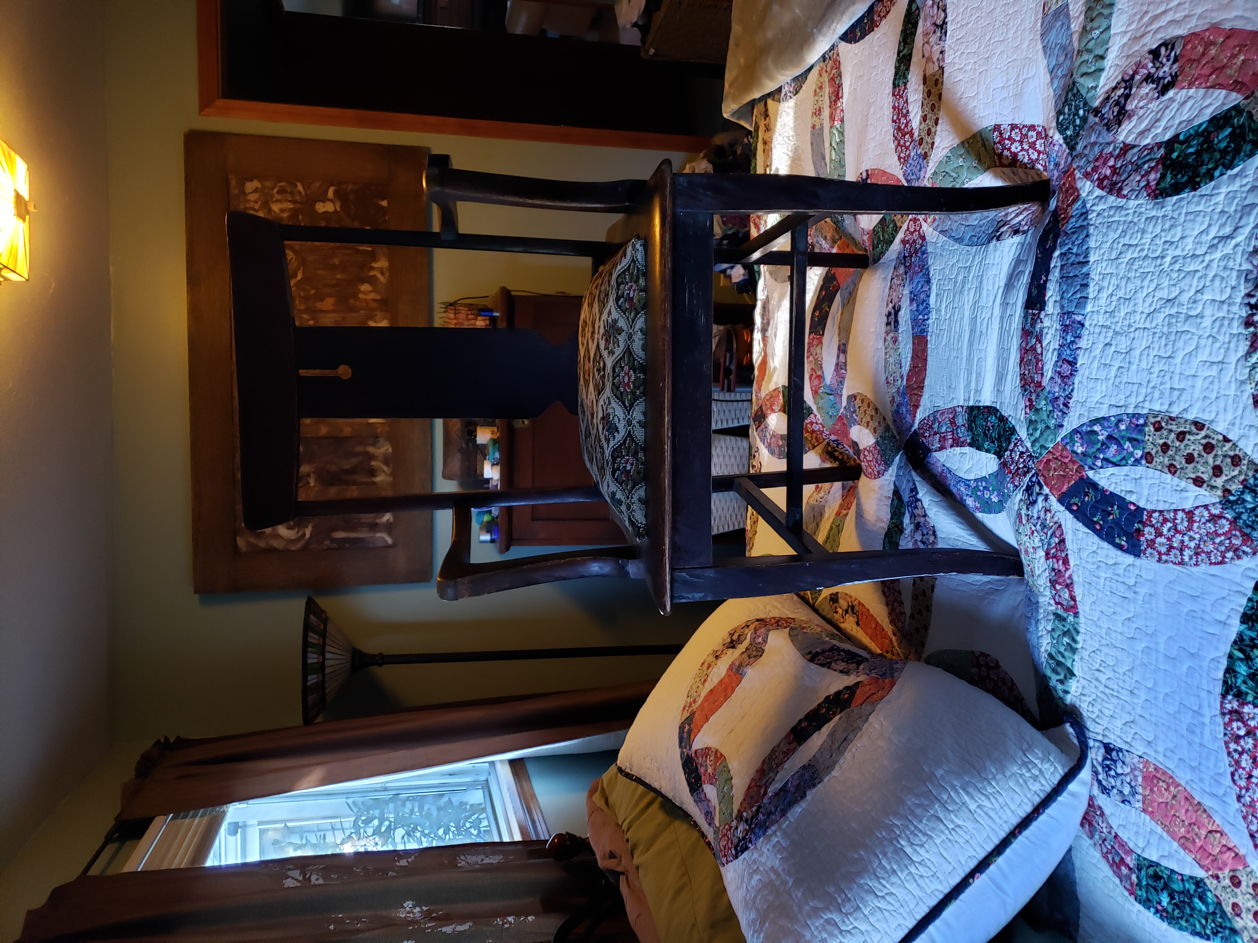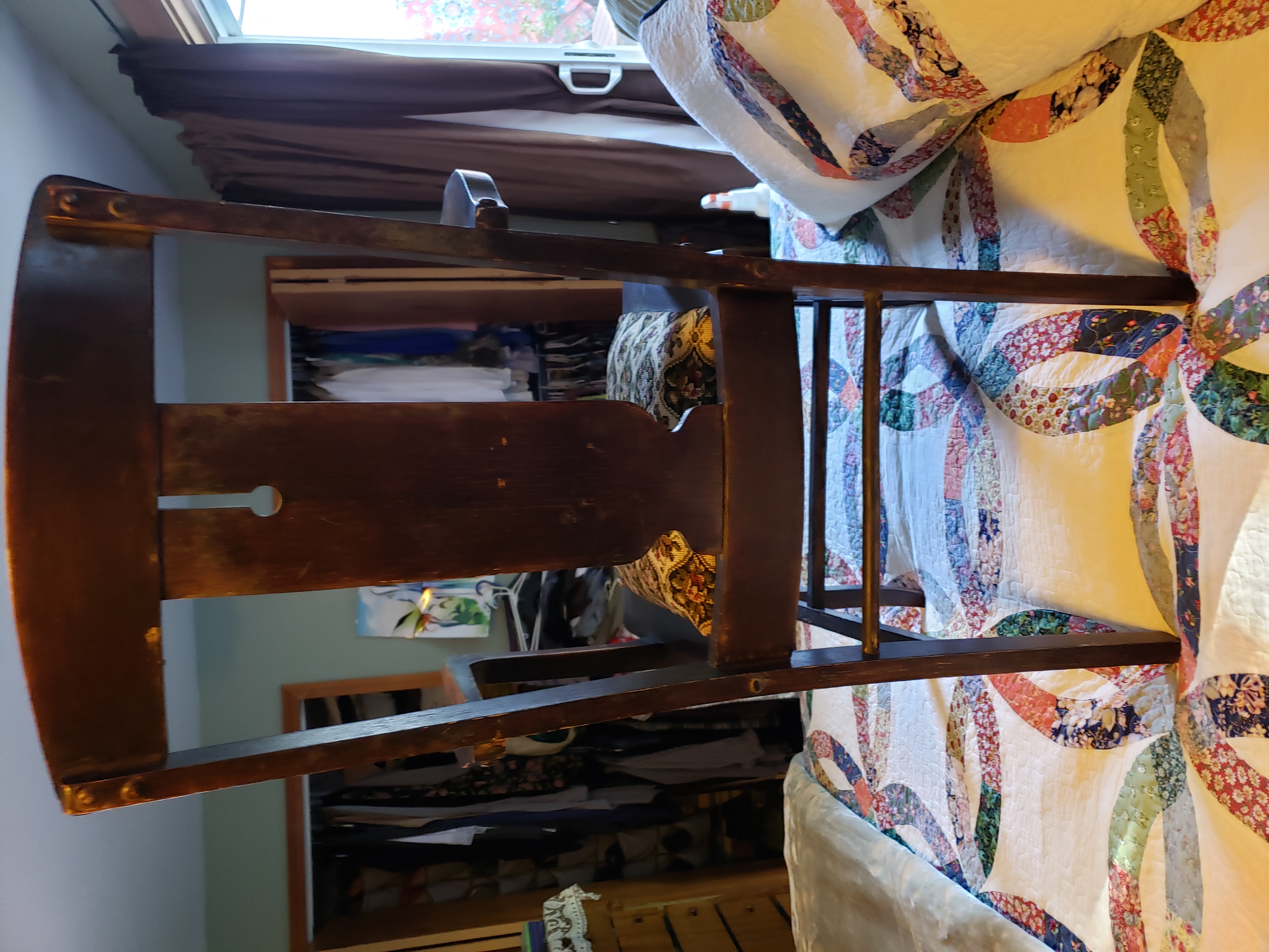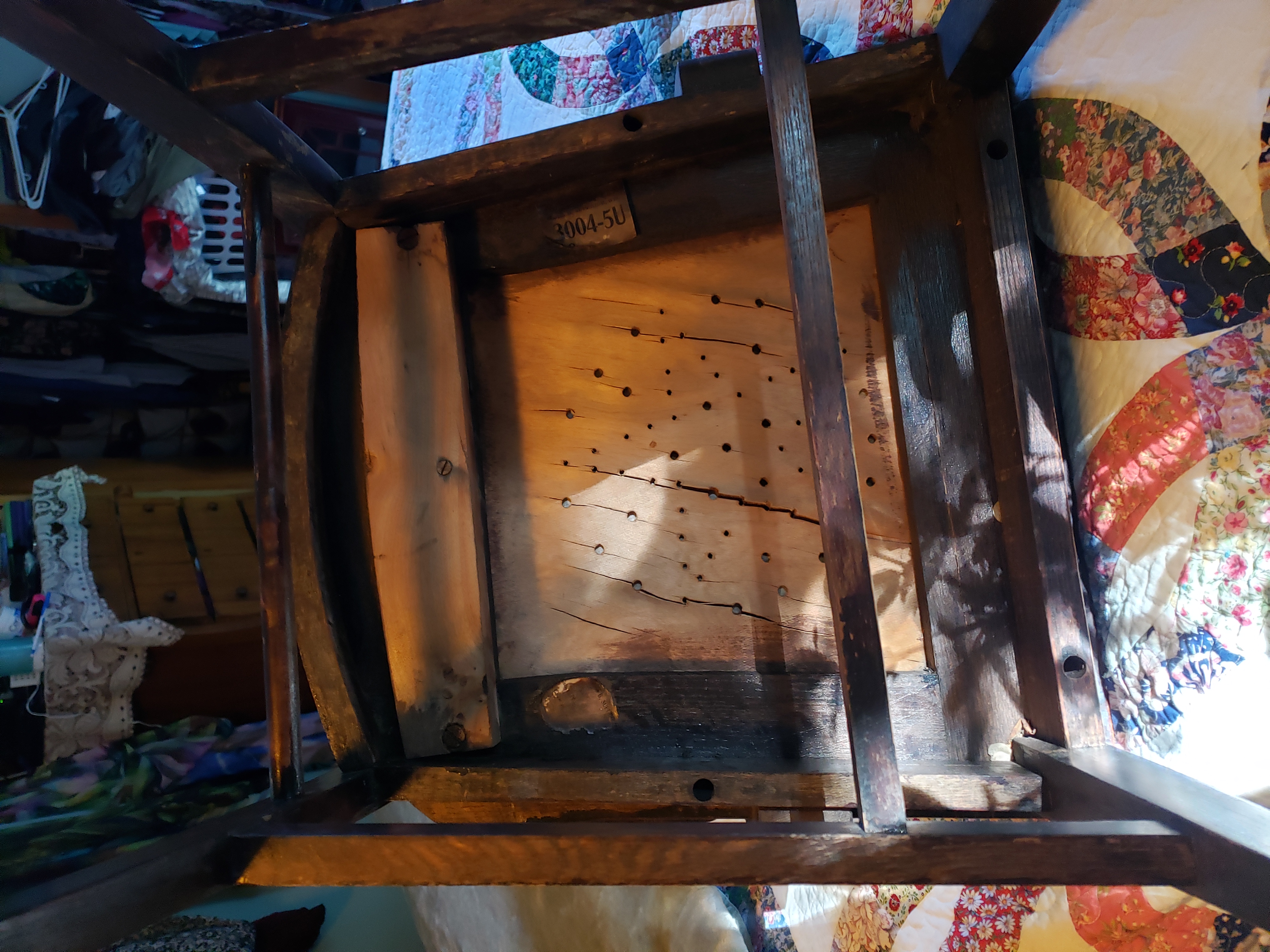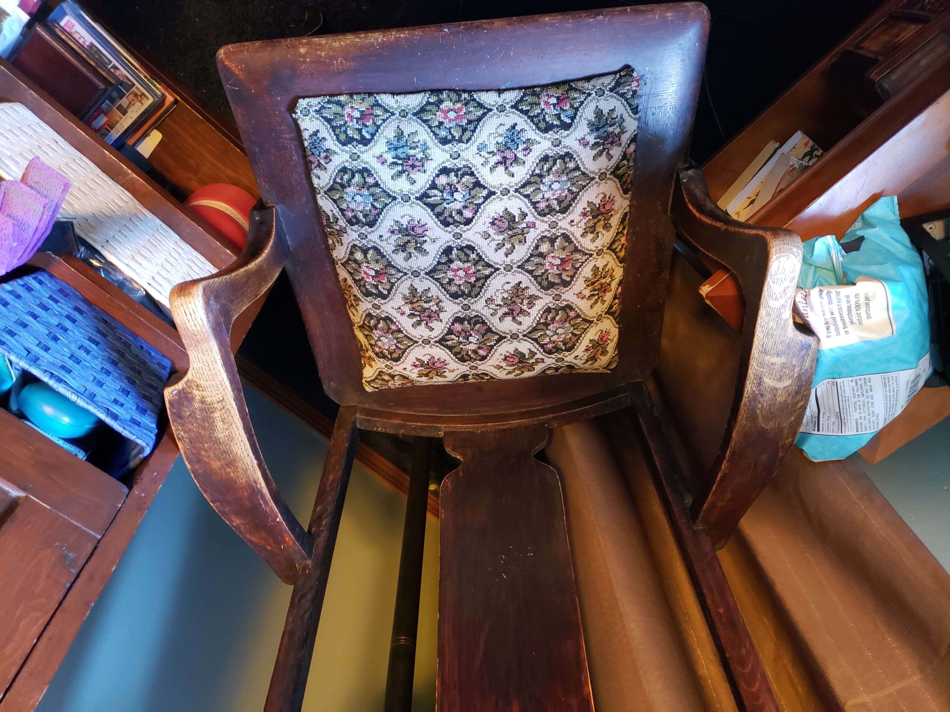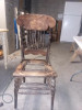 Oak high back chair with padded seat. Orginal stickers on bottom. Peg construction. Webster mfg co 3004-5u.