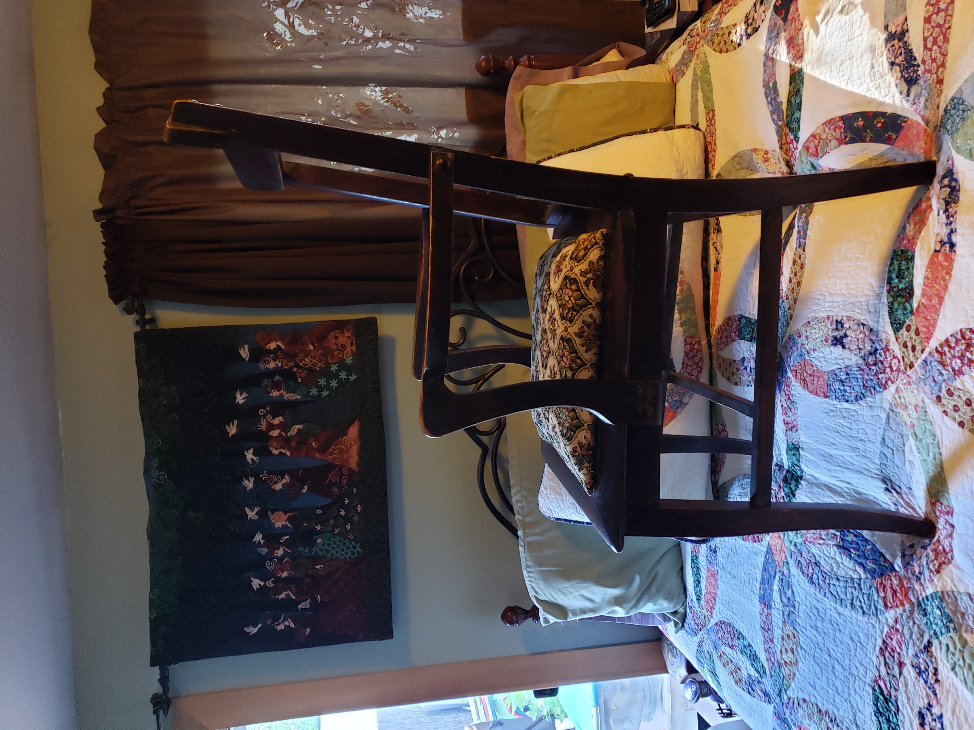 Odd back with wide middle slat with one area that is i guess a decoration cut out.