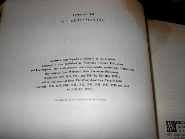 Websters Encyclopedic Dictionary of The English Language Copyright 1957 H.S. StuttmanCo. The binding is off of the book pages are in good condition, 4800 pages.