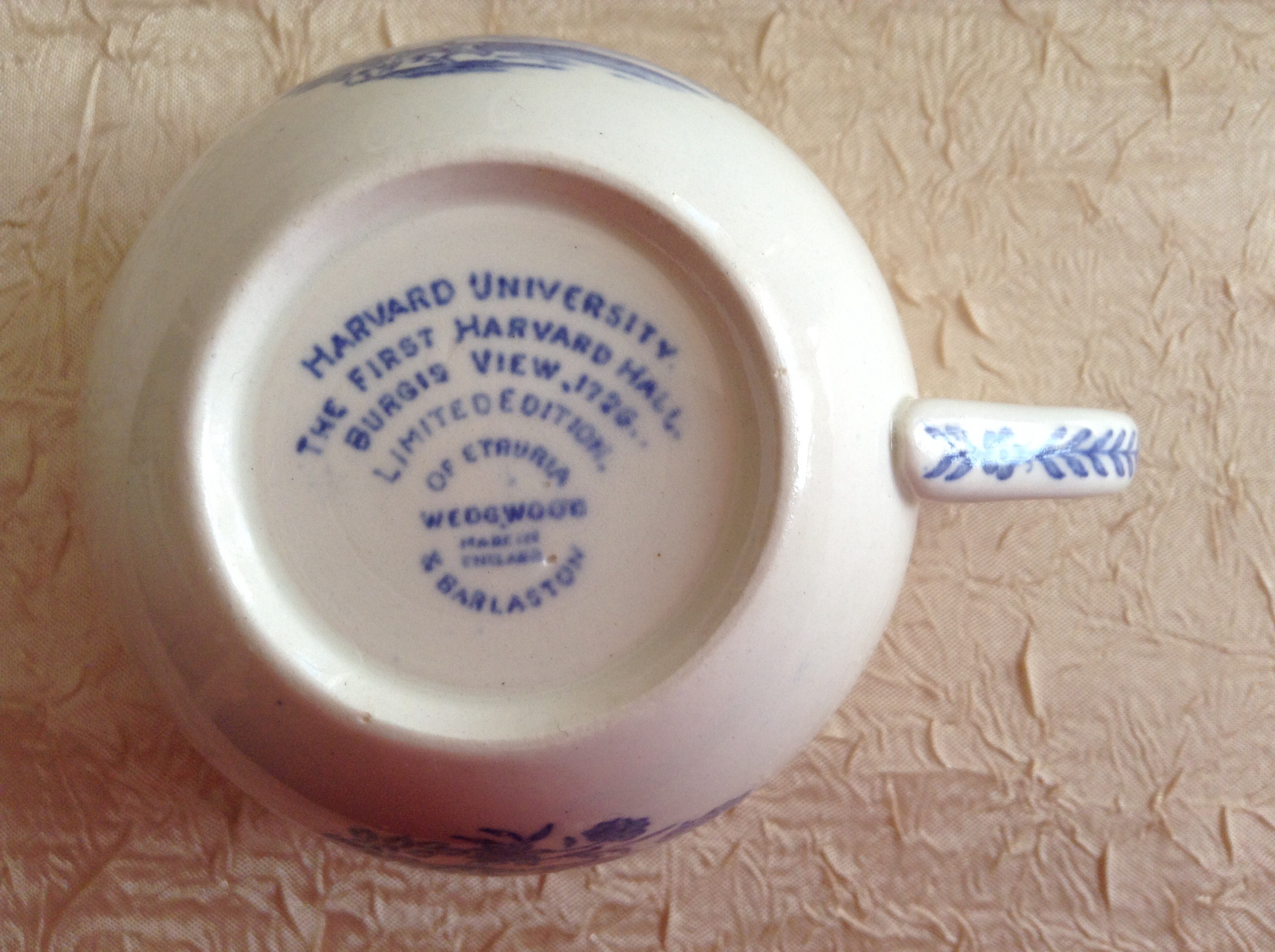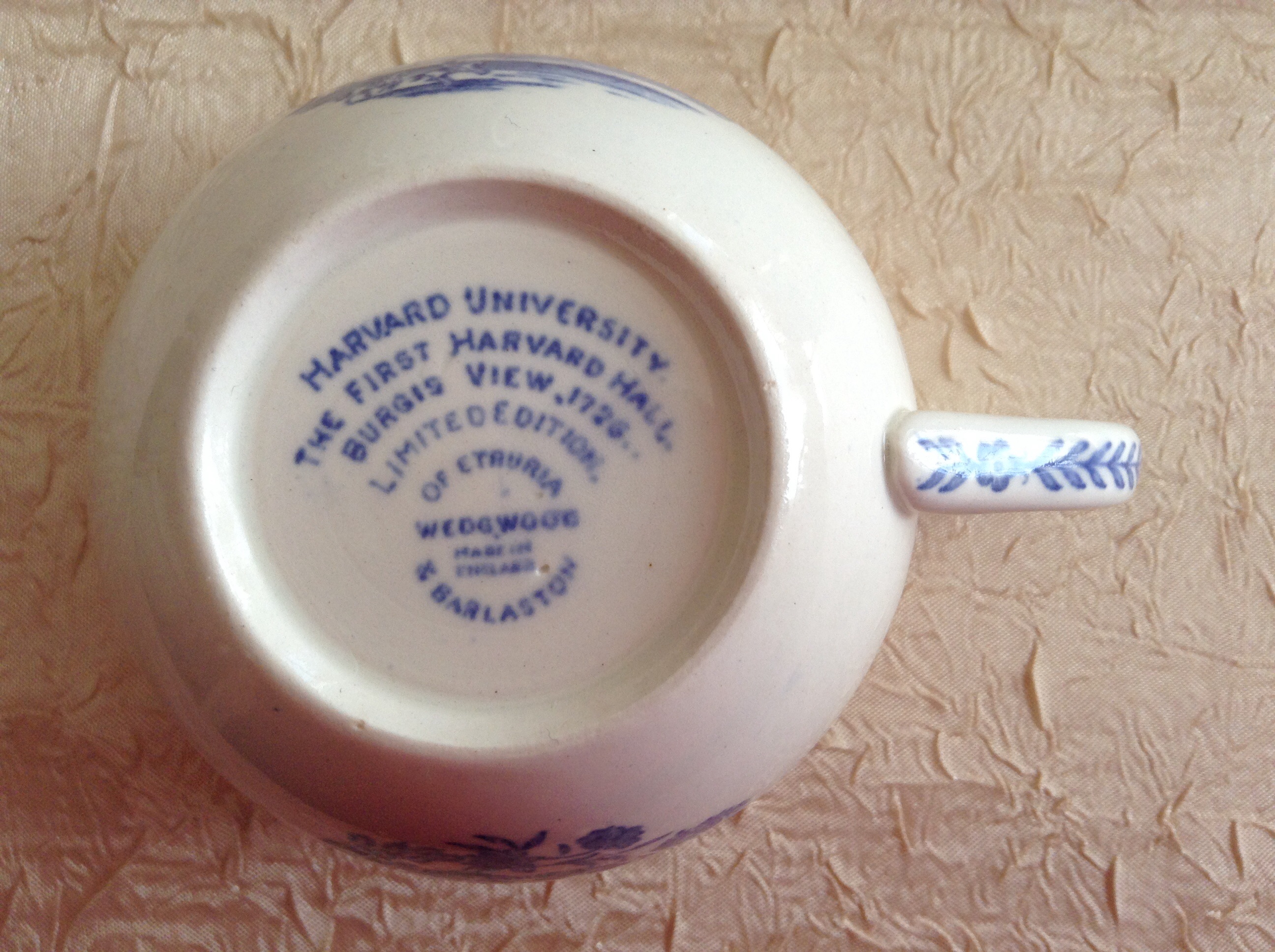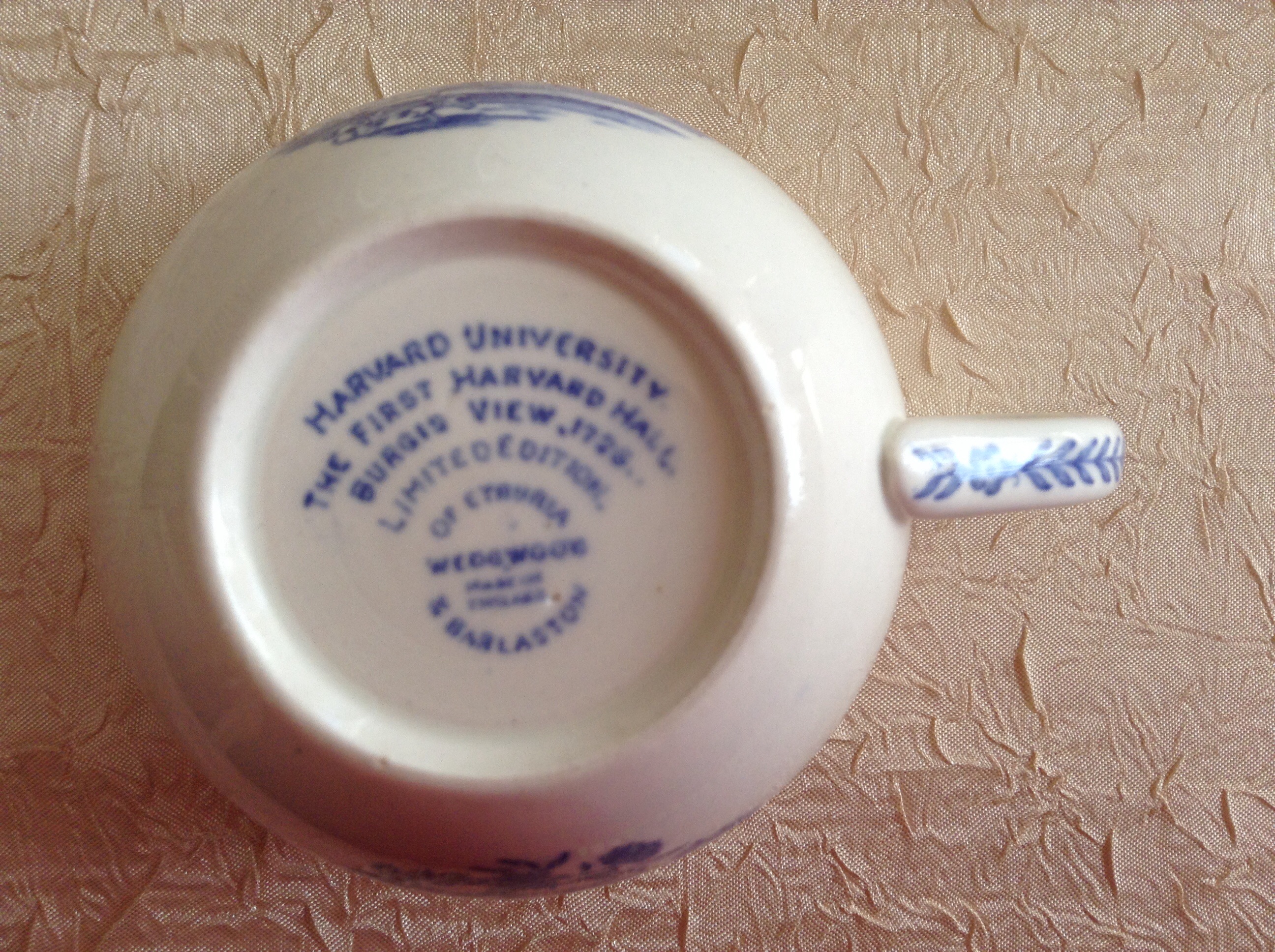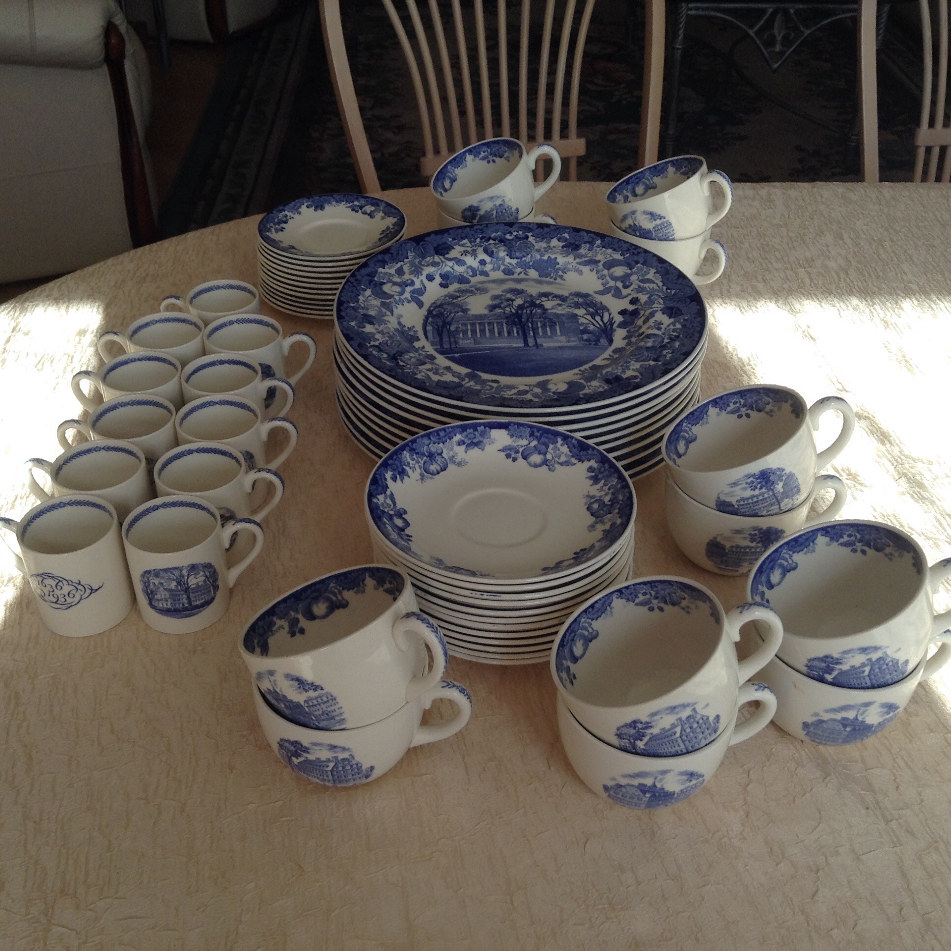 This is a Limited Edition Wedgewood Harvard Anniversary 1636-1936 set of Harvard plates, cups, saucers and demitasse cups and saucers. It belonged to Vernon Wallingford of Ferguson Missouri. Vernon was my husband's grandfather who attended Harvard University. It is classic royal blue and white. All of the cups and plates depict different buildings of the University. It was a set of 12 but now there are 10 plates in perfect condition. There are 9 tea cups with 1 damaged, there are 11 demitasse cups with two cups showing their age. All the saucers are in perfect condition. The set is beautiful and I still use it on special occasions.