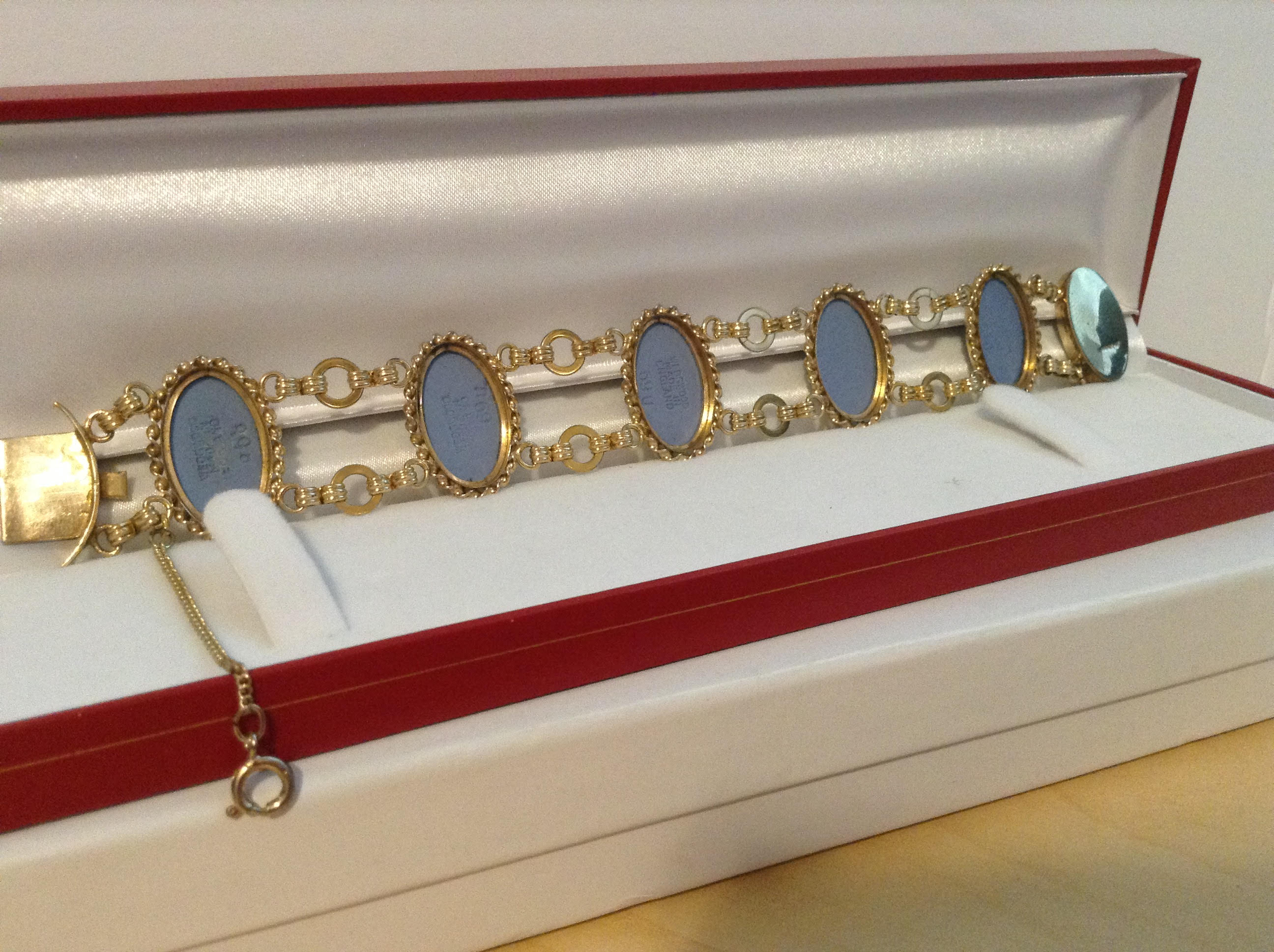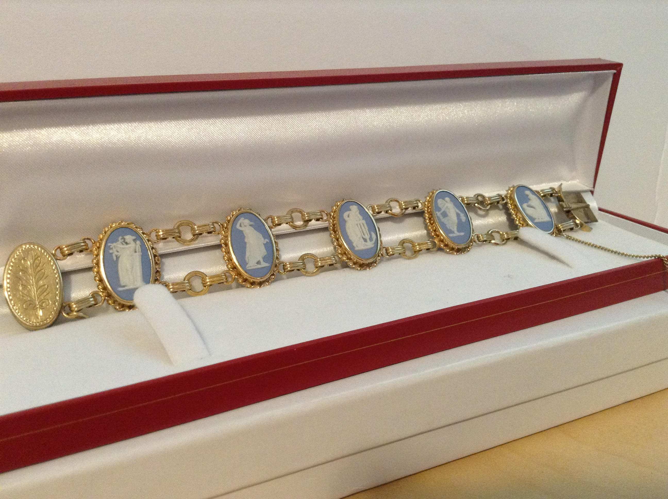 i have a wedgwood made in england rainbow-gf bracelet. it has 5 different blue cameos, engraved leaf pattern on clasp. 2 cameos have s68, 2 have 69u and the 5th has what looks like and R or B and 68. approximate age? approximate value?