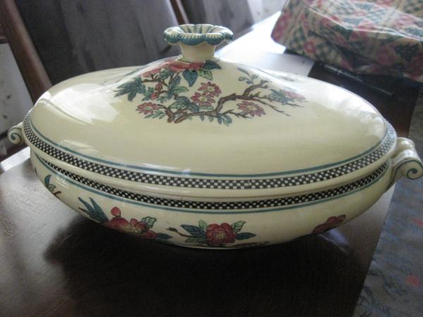 complete set serving 6 except 1 broken soup bowl, 1 broken tea cup, 1 missing smaller plate- the set includes dinner plates, soup bowls with plates, smaller plates, dessert plates, tea cups with saucers, demmitase cups and saucers, serving platter, smaller serving platter, butter dish?, soup tureen with lid, sugar bowl with lid, creamer, and small serving bowl. no damage or chips on any of the dishes except the broken ones stated which were broken in the 90's from california earth quake at my grand mothers home. larger serving dishes are impressed but plates and cups are just hand marked. I would like to know more about the patten, date, value and possible replacement pieces.