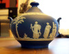 Creamer and sugar with a wedgwood type or cameo type design in porcelain like with a shiney interior. no makers mark, just 4 numbers 3069 on one and 3070 on the other.