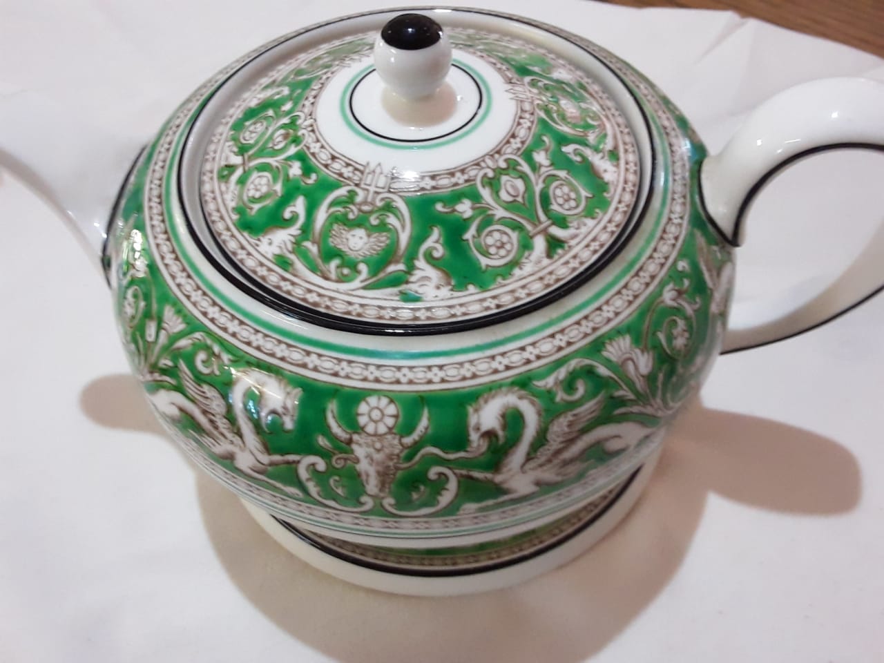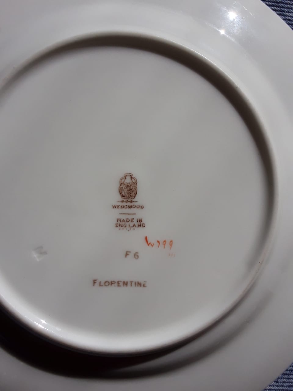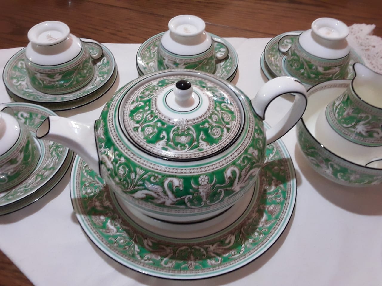 Wedgwood Florentine Green Tea set, no center design, numbered W799 in red. Includes Tea Pot with stand, Sugar Bowl, Milk Jug, 4 Cups and 4 Saucers, 6 Cake Plates all in good condition. Gifted to grandparents in 1938. Interested in some idea of what its value may be.