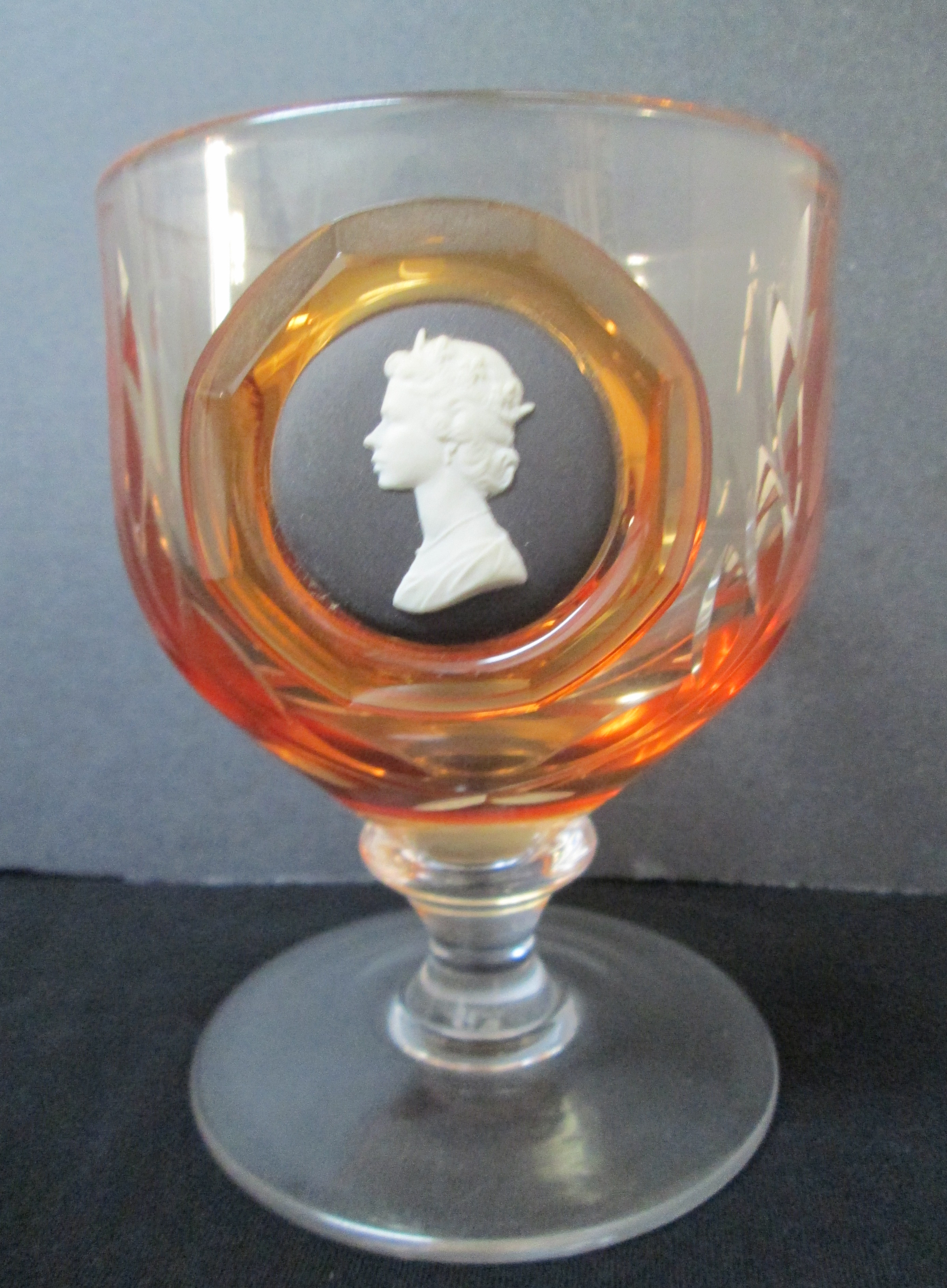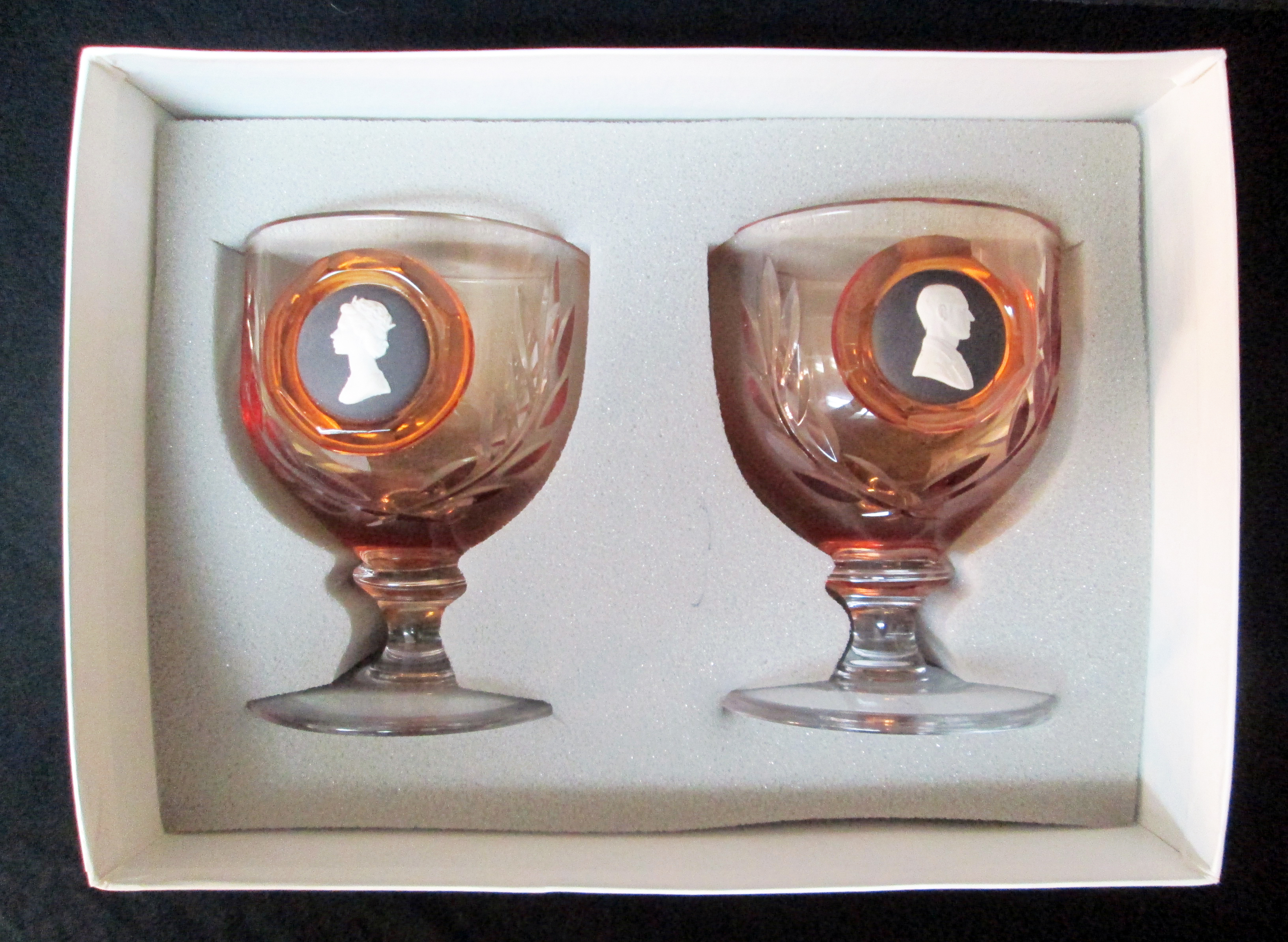 I acquired recently at auction a set of wedgwood England Topaz Glass Royal Silver Anniversary 1947-1972 Topaz Glass Goblets with Jasper Ware Cameo Decoration.