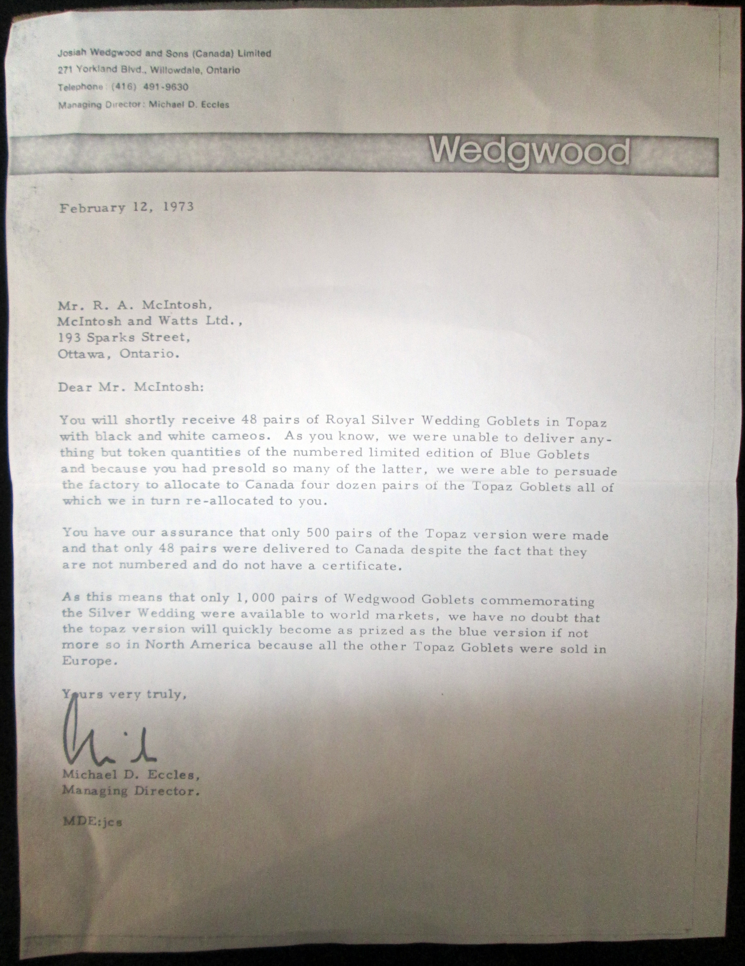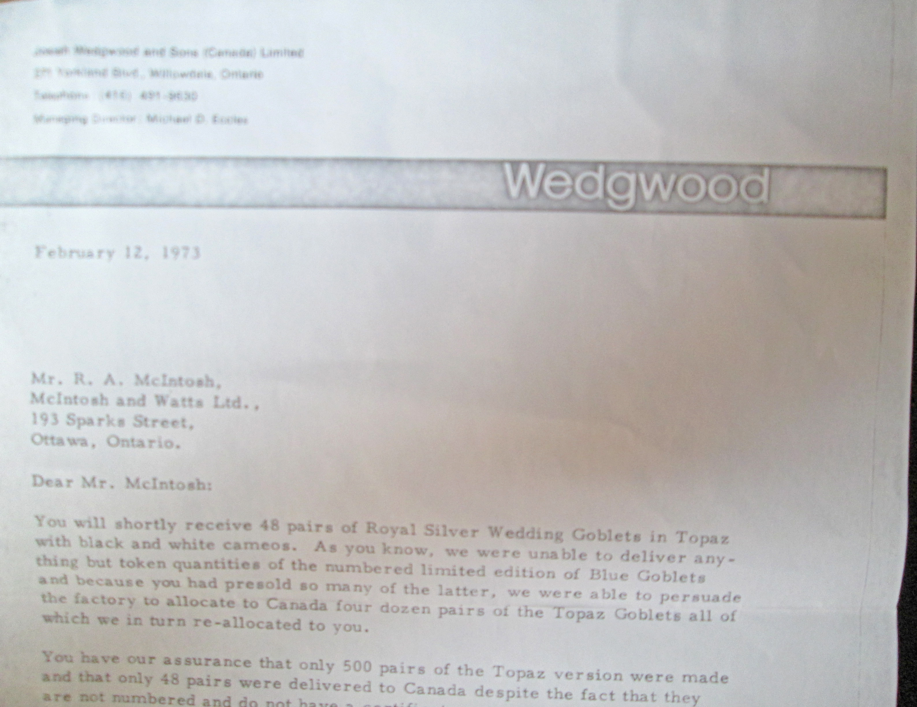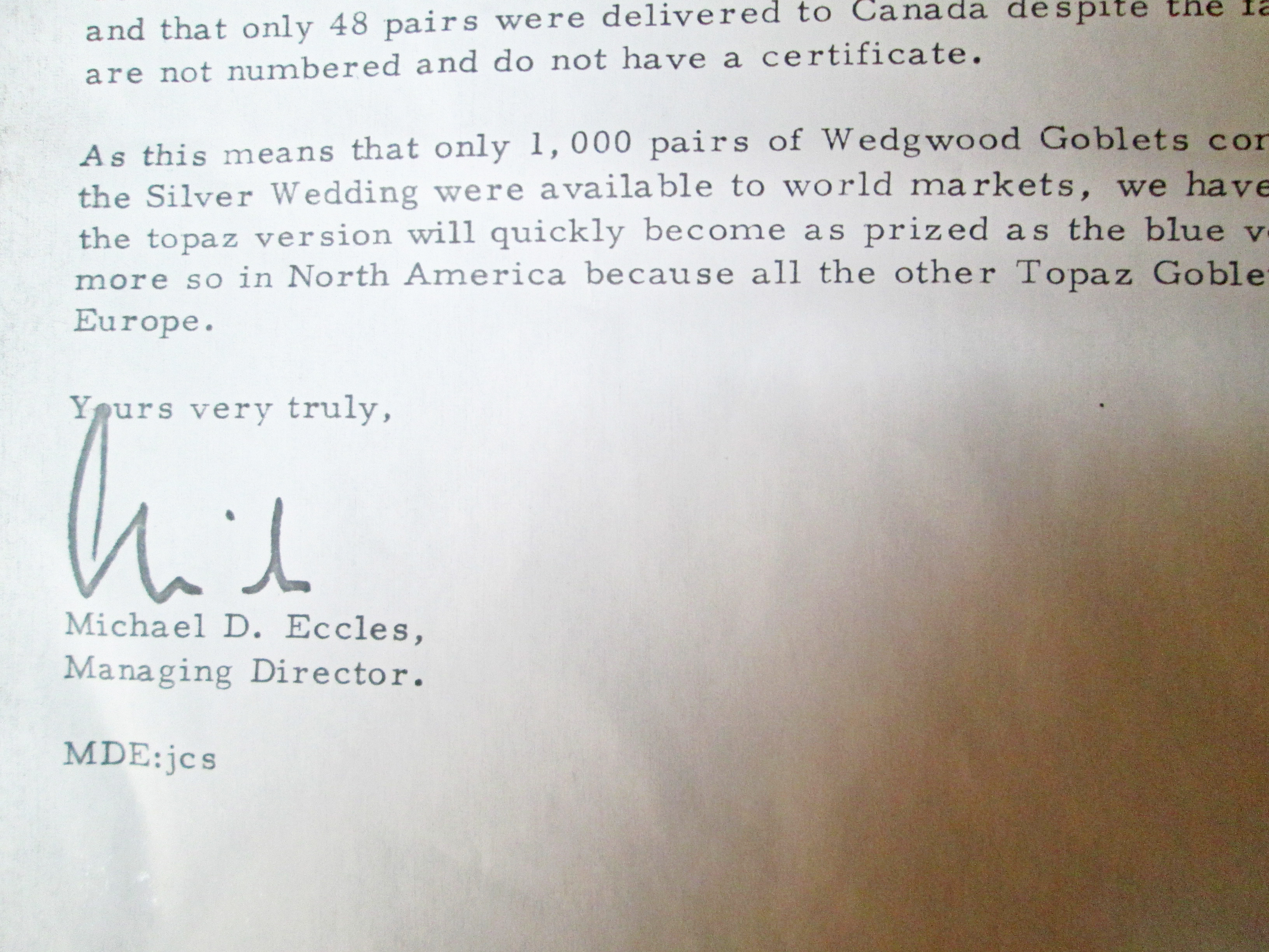 The goblets are new, unused in the original packaging and come with a letter dated 1972 from the then Managing Director of Josiah wedgwood & Sons Canada, Michael Eccles.
