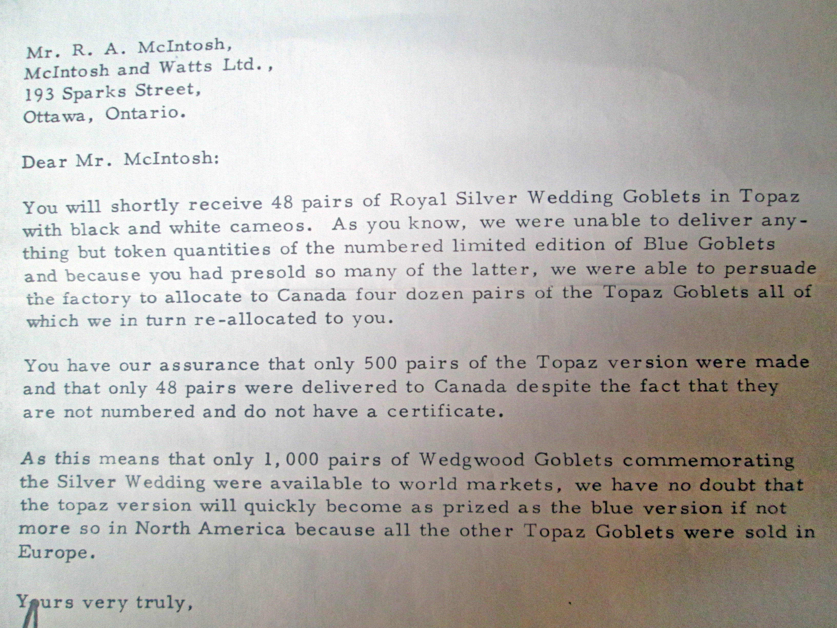 The letter details a situation of seriously constrained availability and the resulting shipment of 48 sets only of Topaz glass goblets to Canada. The letter also states that those 48 sets were part of a total of only 500 topaz sets and a part of a total 1000 sets alltogether.