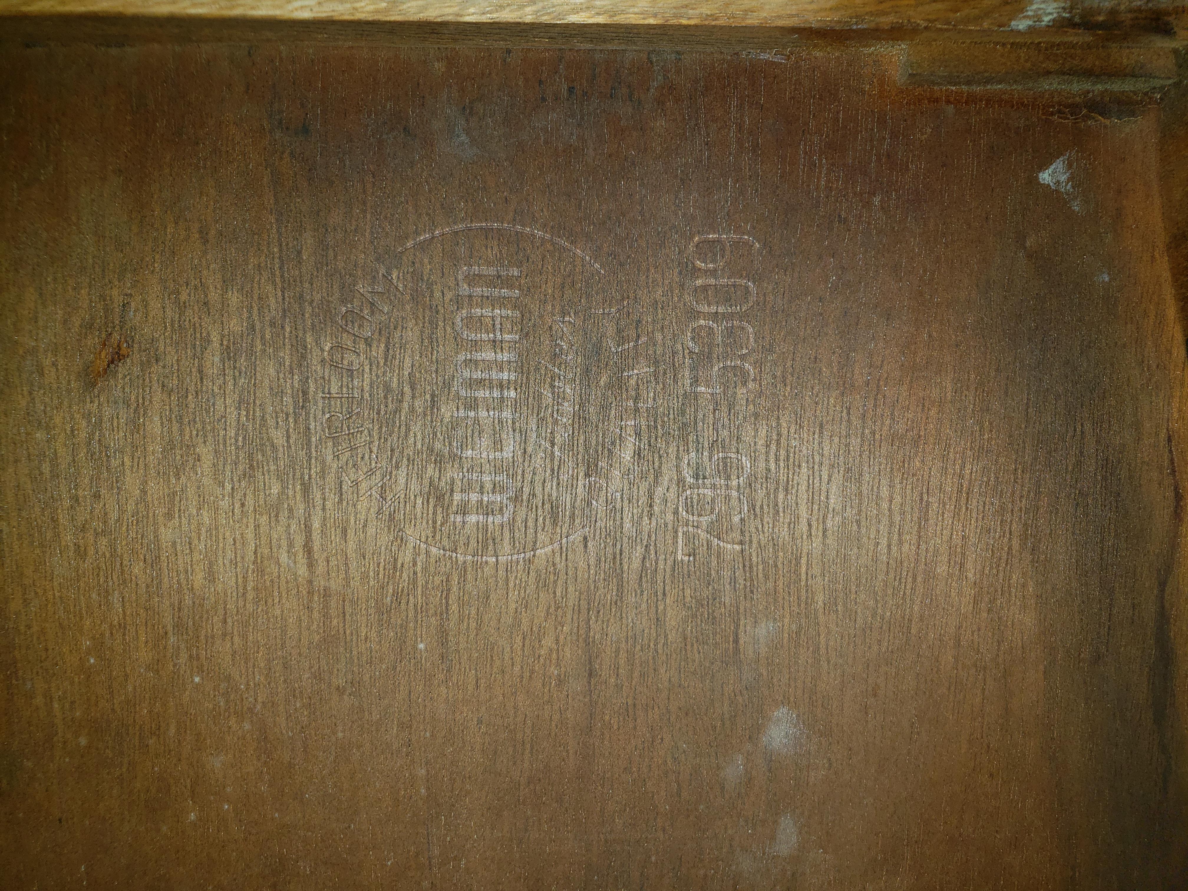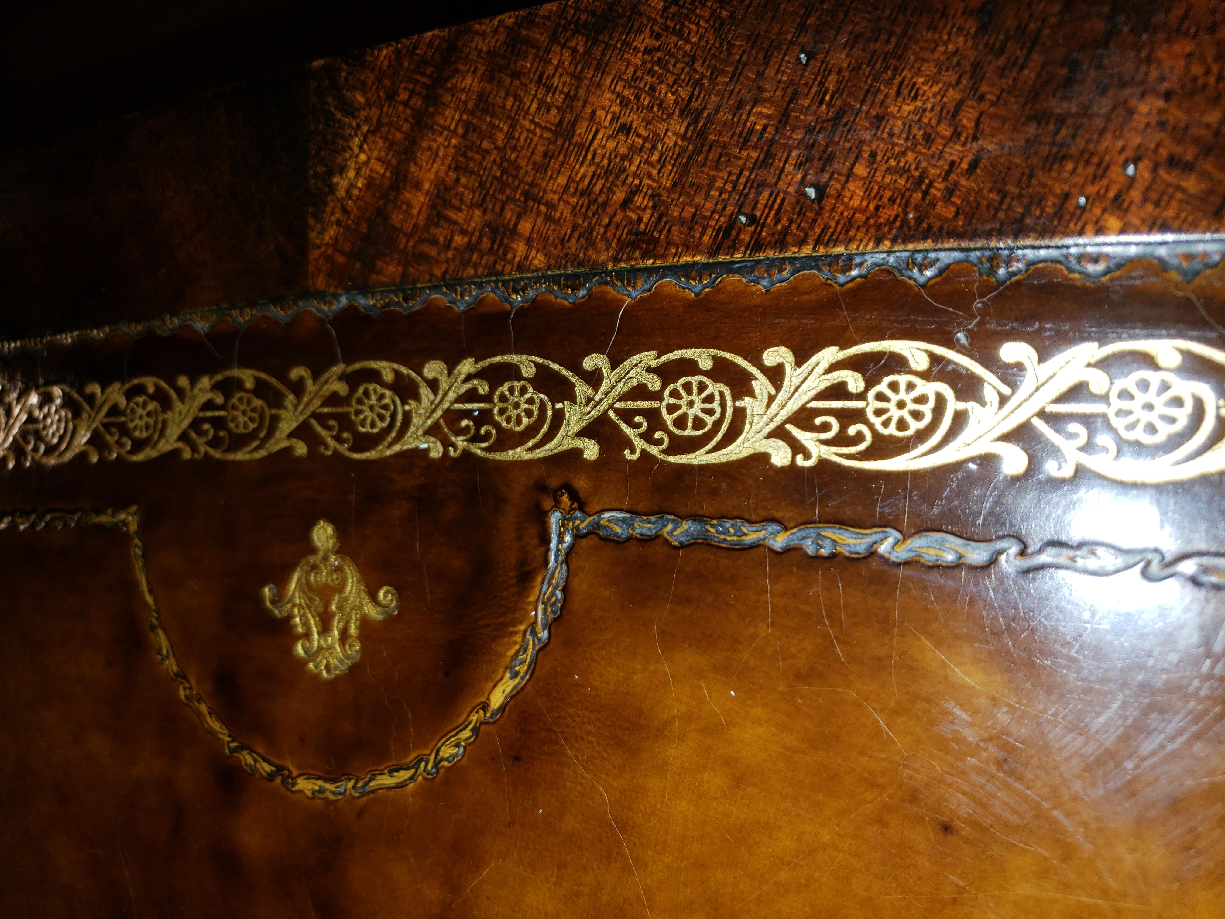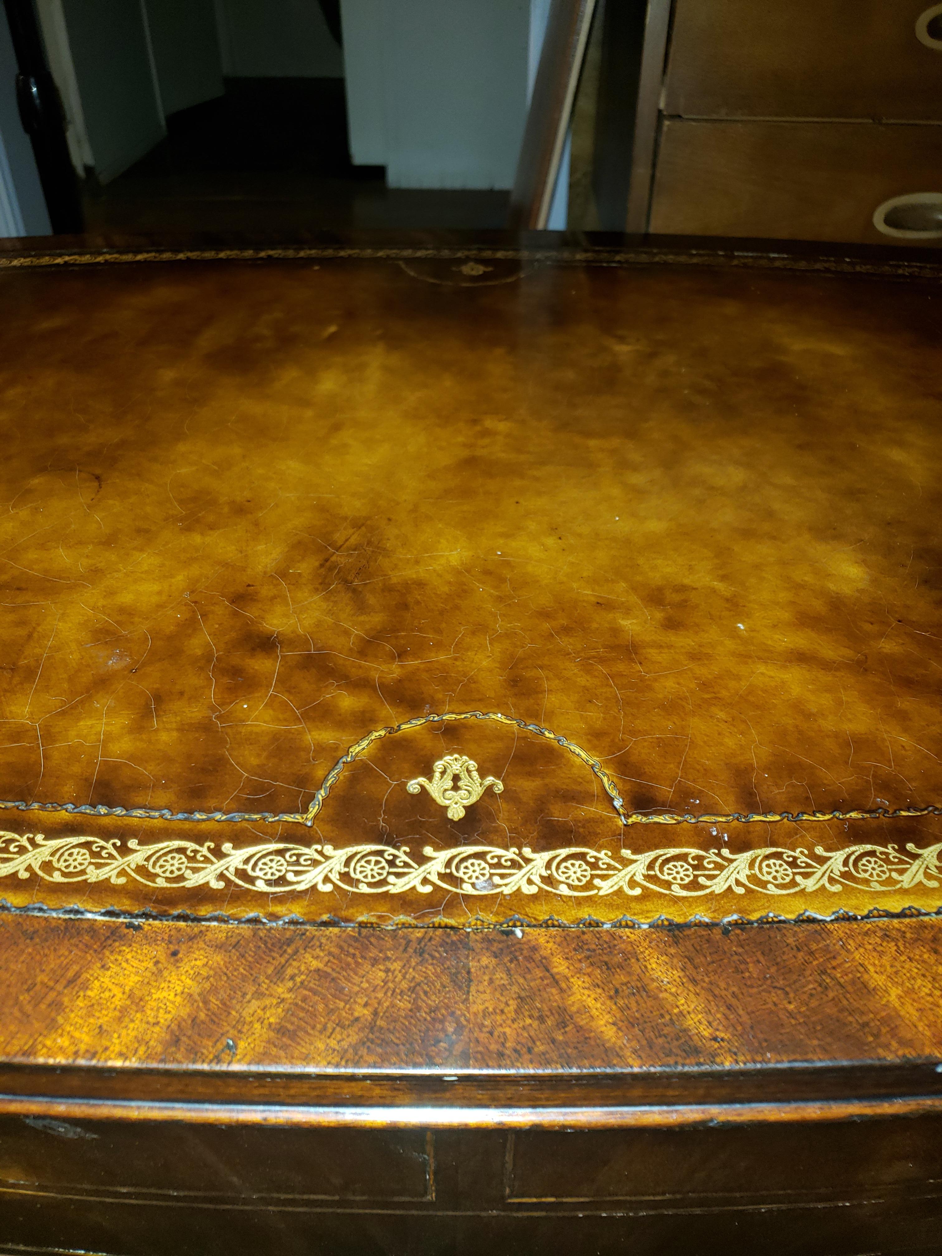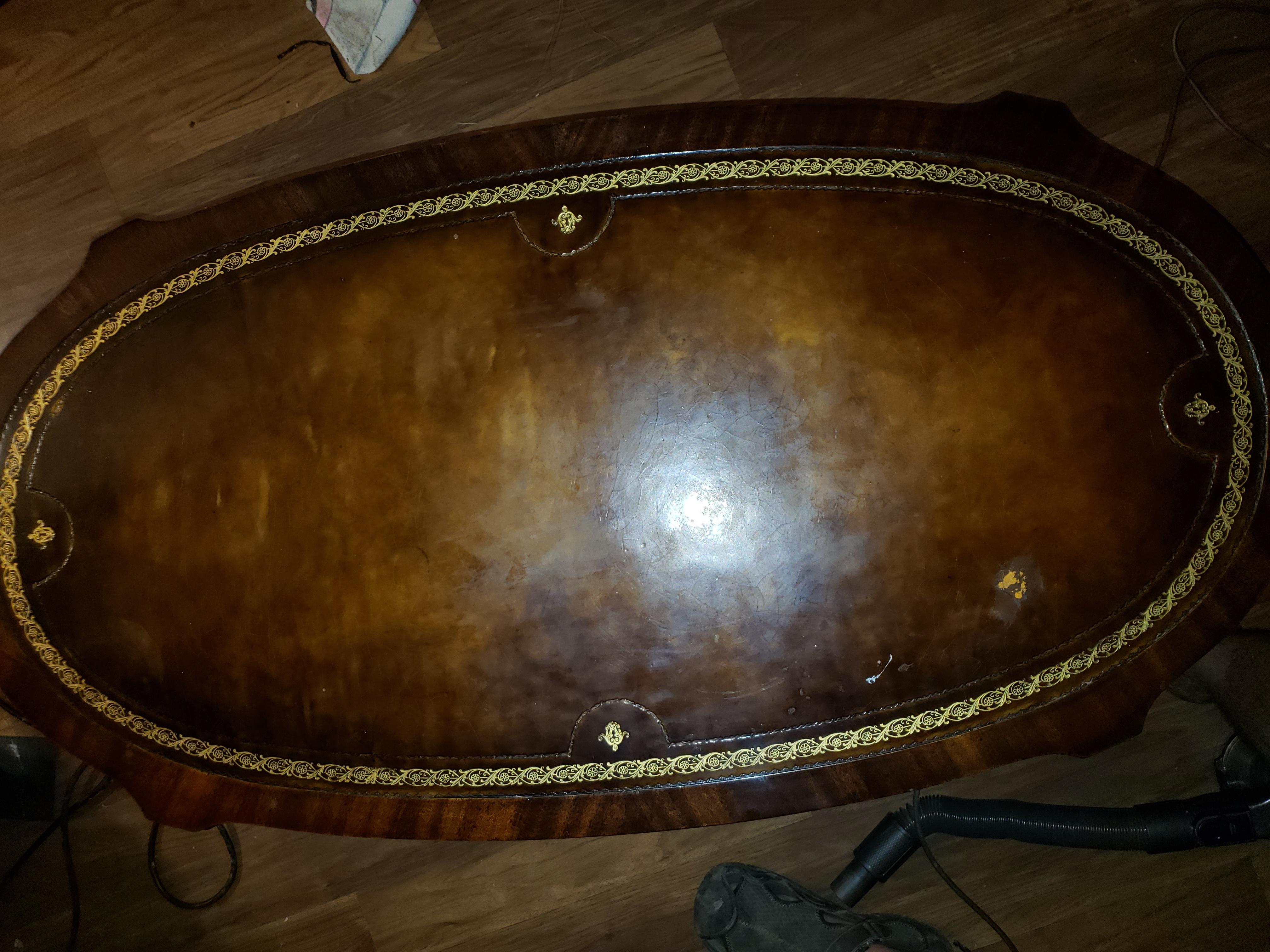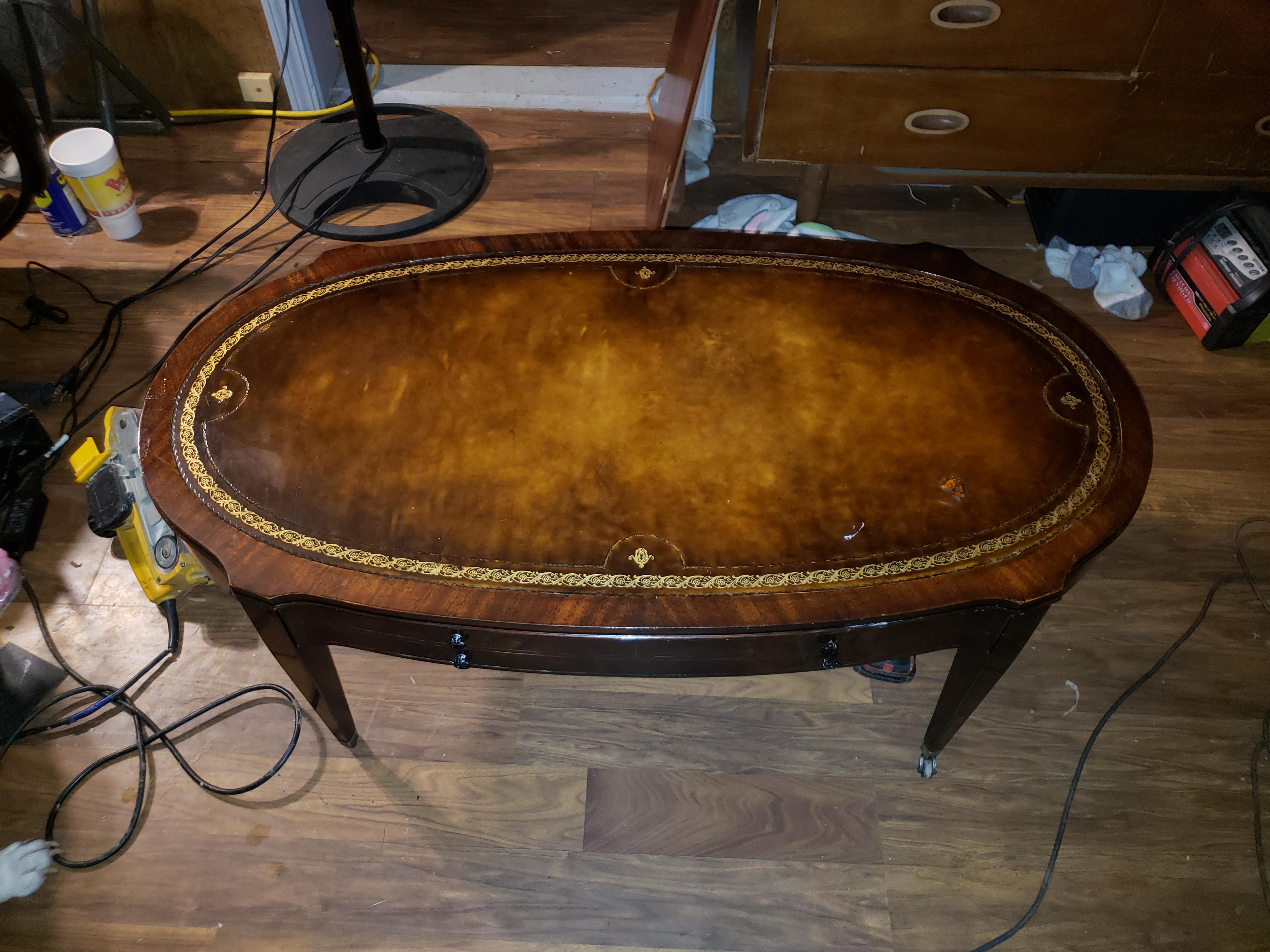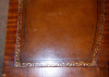 Weiman coffee table. Teak colored. The top if the table is leather with pressed design around the edges where it meets the wood, and gold inlay around the edges of the leather. The table has one drawer and had small swivel casters on the bottom of the legs.