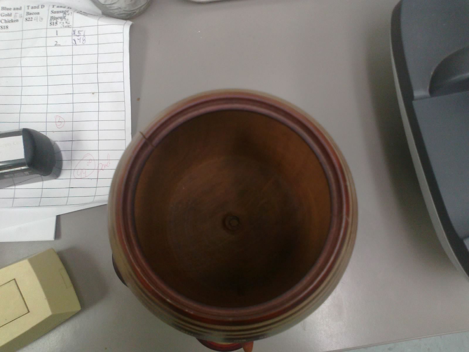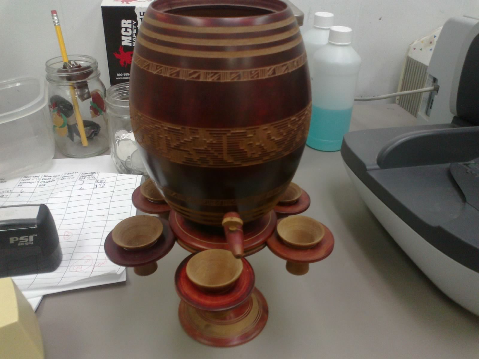 this is a wooden urn looking thing that has a ring of cups around it.  i think it may be a sake set but i honsetly have no idea.  under the lid is a sticker that has the numbers 1635 and a line then 340.  other than the sticker there are no other markings on the item.