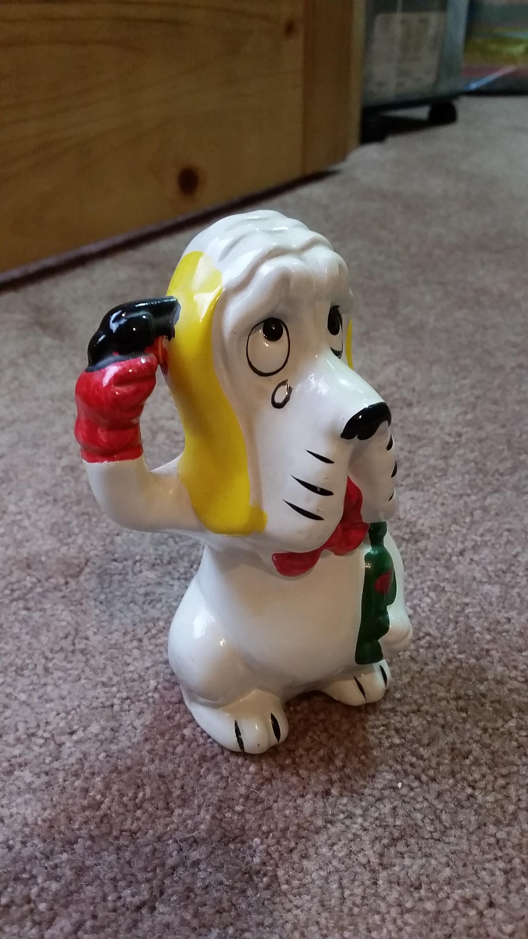 The design still stands out as pretty unique, with the crying dog holding a bottle and a gun. It’s definitely one of those weird, kitschy items that you wouldn’t expect to see every day. While it might seem dark for a coin bank, it reflects a kind of gag-gift humor that was more common back in the mid-20th century.