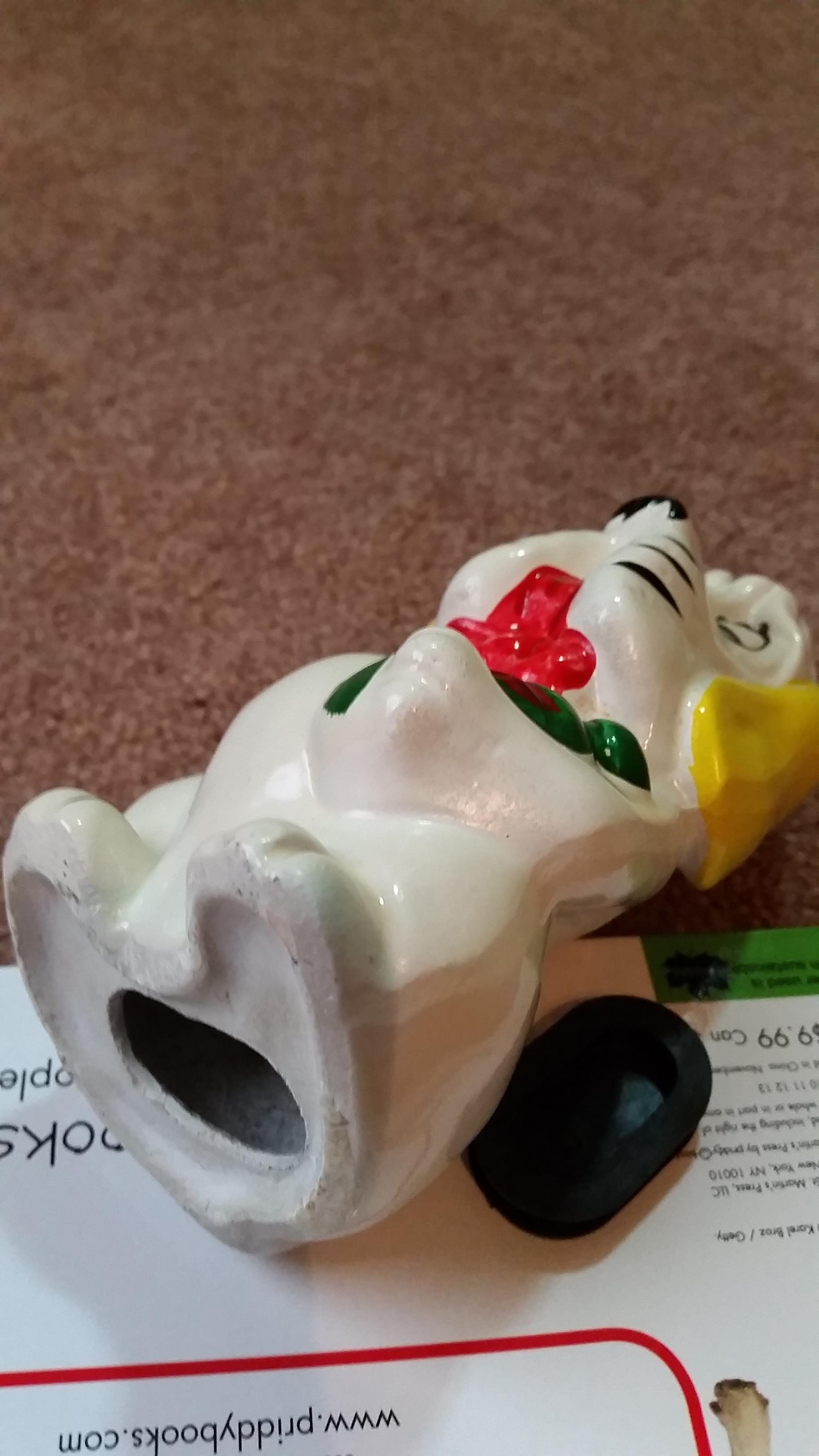 Prices for these coin banks vary quite a bit. Some examples have been listed at auctions for as low as $10, while others have gone up to $50. The exact value depends on the condition, and yours seems to be in good shape with no visible damage, which is a plus. Still, since it’s not super rare, you’re probably looking at a range of $10–$50