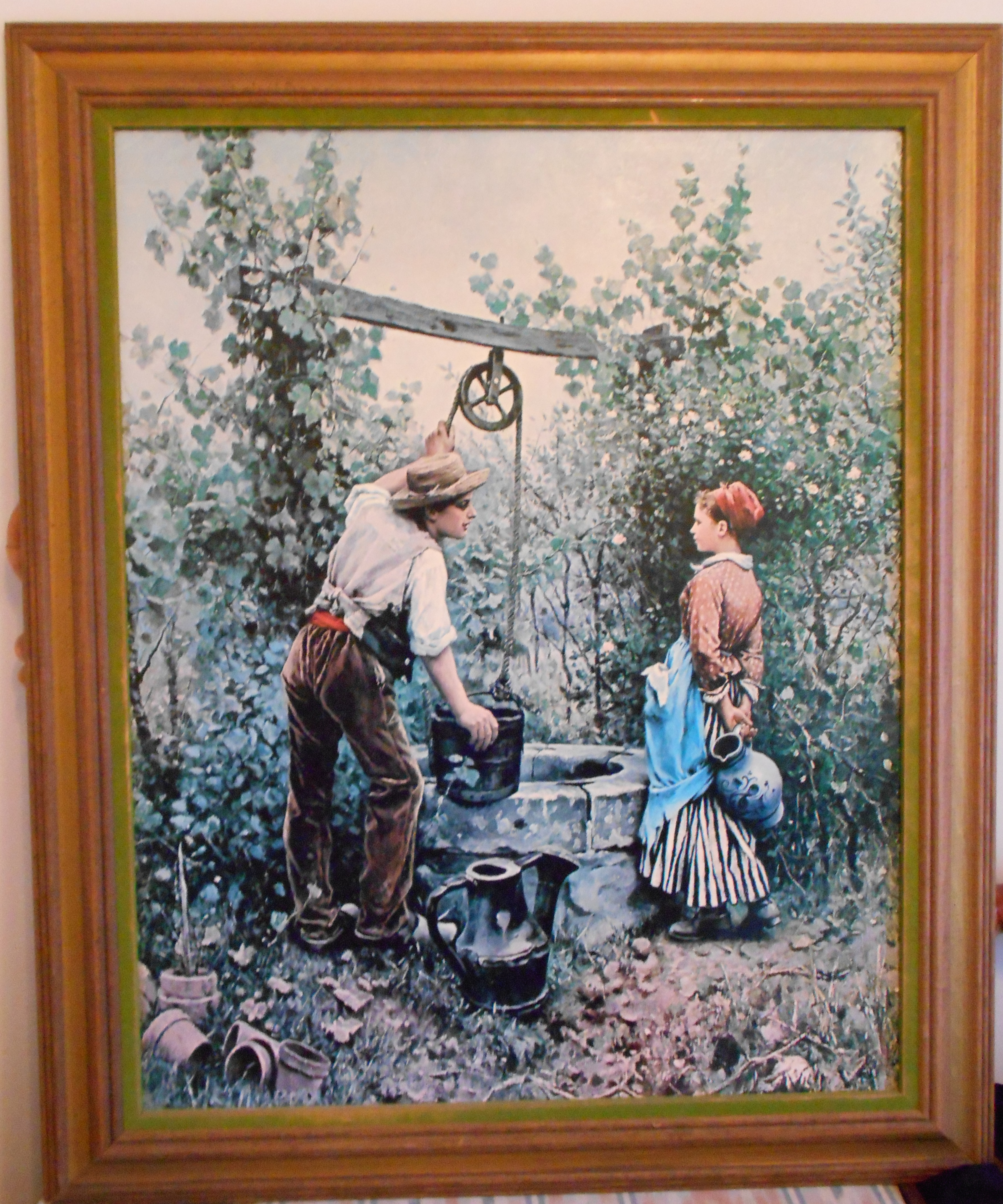 Has the number V5424-533 on the back of a sticker with Illinois Moulding Co. featuring Windsor Art Products.  Hand written numbers and hand written "At the Well" .  Back covered in brown paper with a few tears in the paper.  No glass on the front but a 'felt like' trim around the inside of frame.  Including the frame it is 30" x 36" in size.  Belonged to my son's great-grandmother and she died 45 years ago at the age of 88.