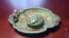 a frog perched on one side and two lily pod leaves on the other. green and copper colored.