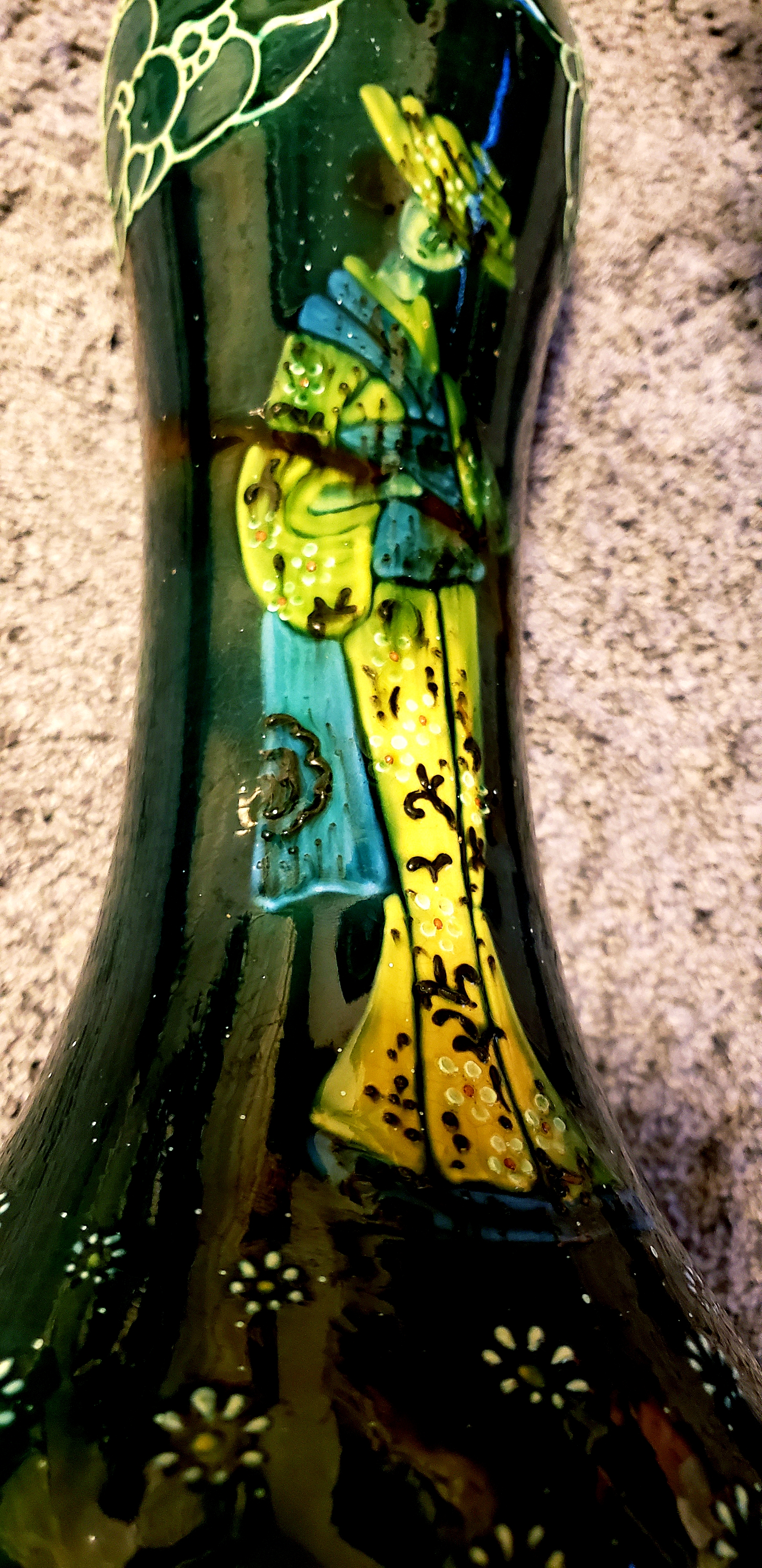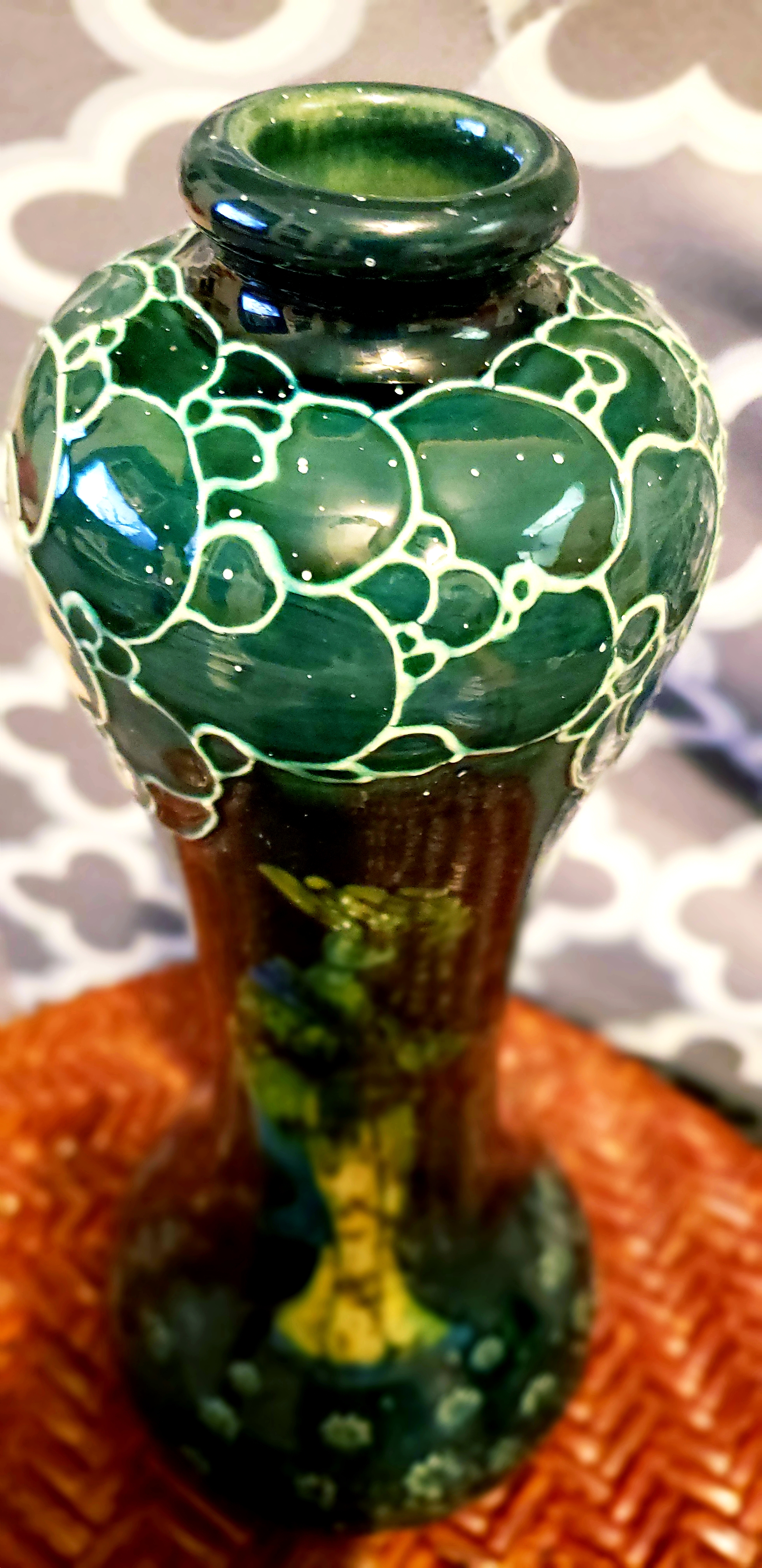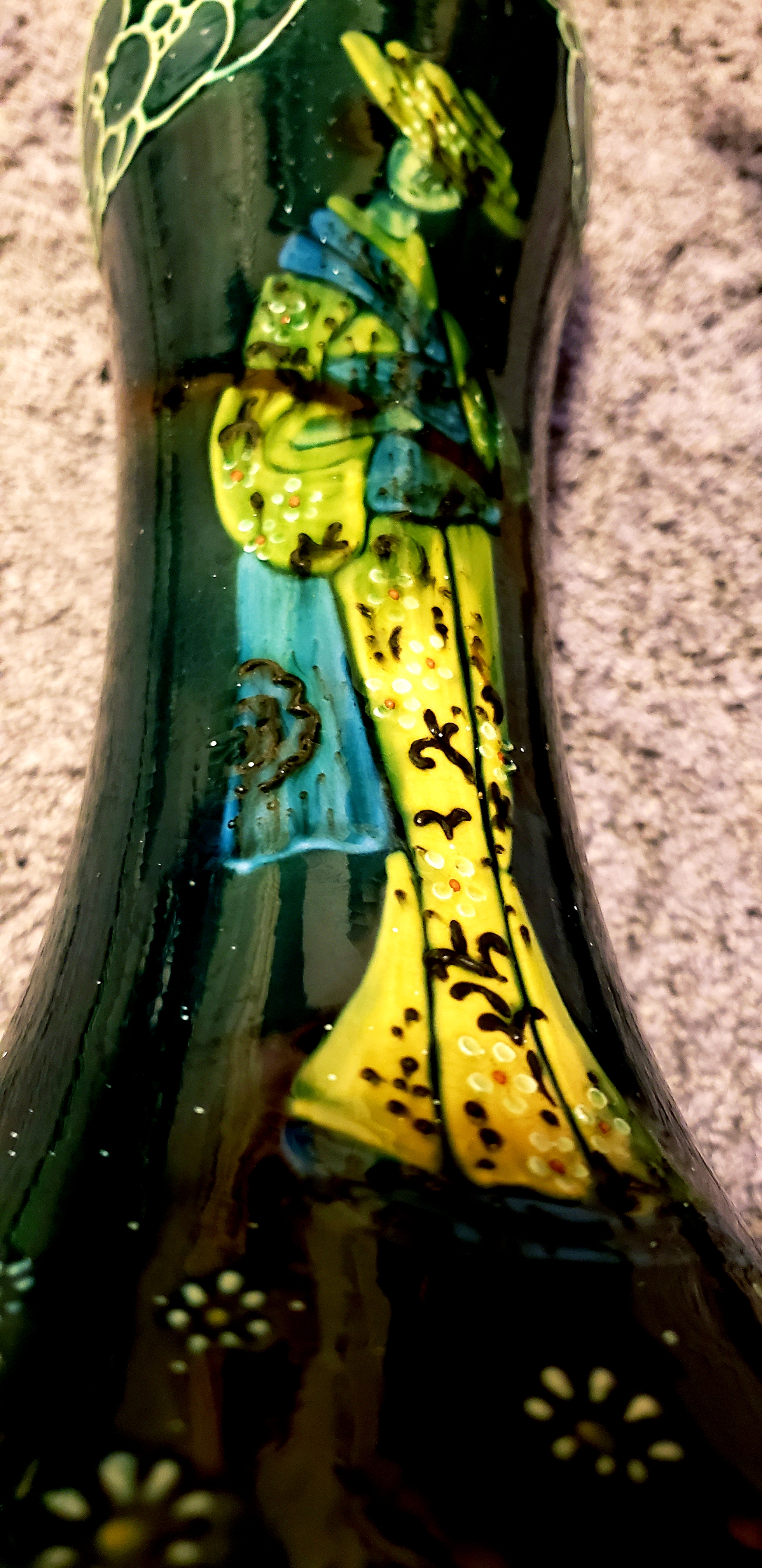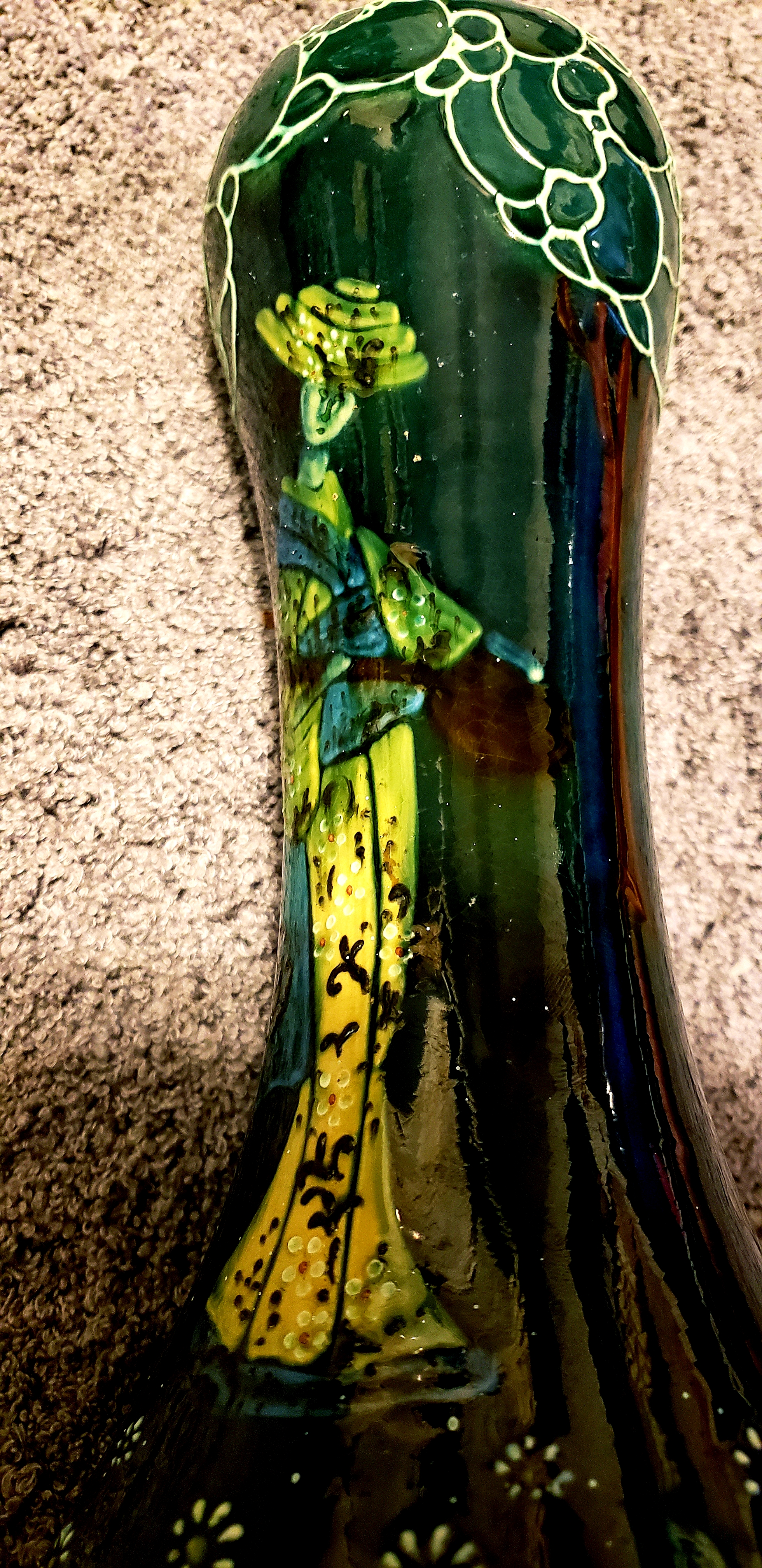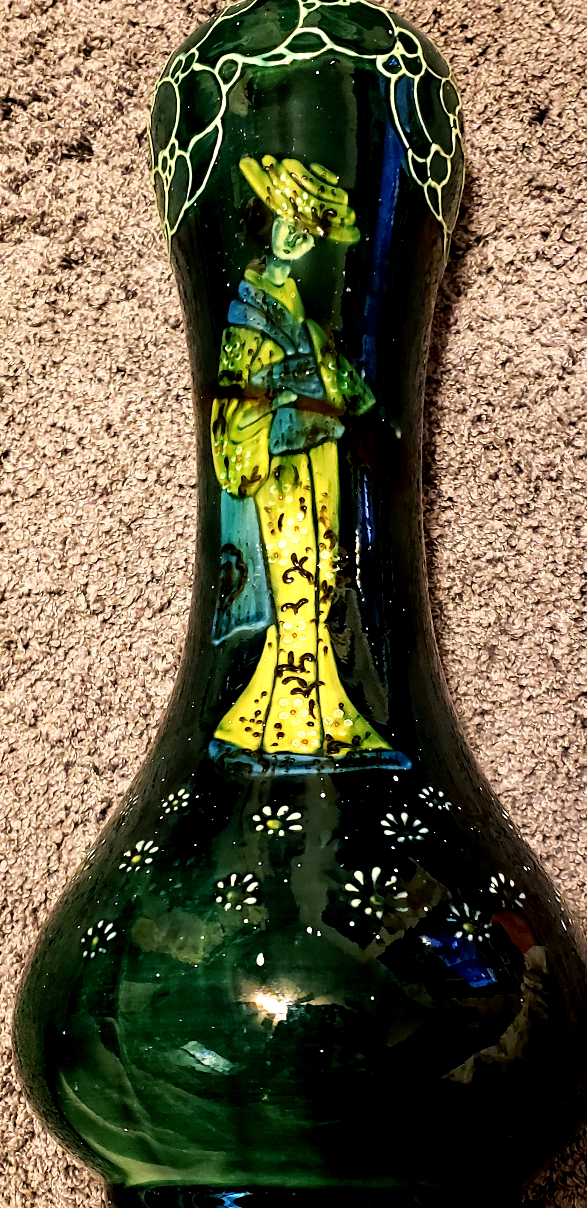 It's about 15 inches tall and 6 inches on the belly of the vase. Green ceramic with geisha surrounded by trees. Really need help on how valuable is the vase. And it is a rare piece from frederick hurten rhead. I can't find exact one like this one.