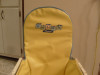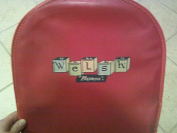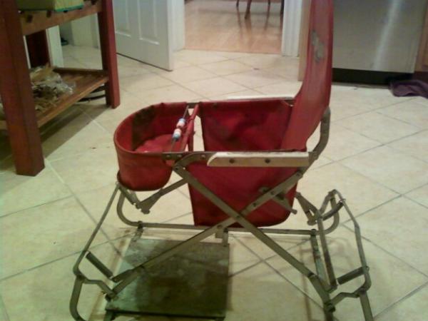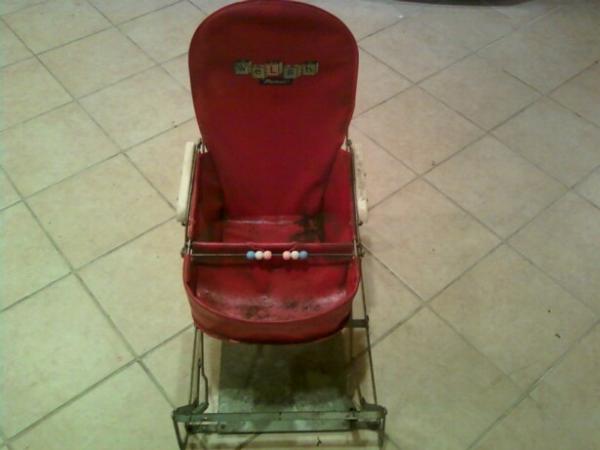 The chair is constructed of metal, and has these metal springs to make it bouncy. The seat is red and says Welsh Playmate on it. There is a tray-type thing made out of the same red material in the front, and a metal rod going across with colored beads on it.