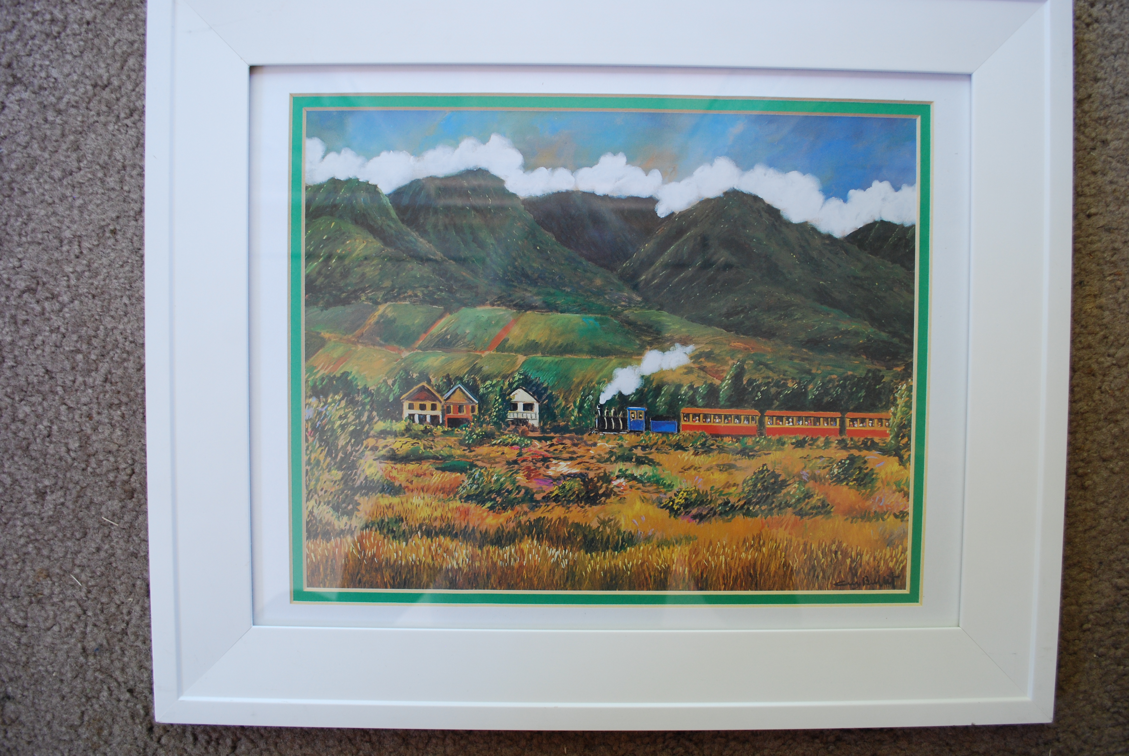 This art print by the famous artist Guy Buffet depicts the West Maui Mountains with a train traveling beneath them. The site is probably Kapalua, the popular resort area on the island of Maui. The print is 9.5x12 inches. The glass-covered white frame is 14x17 inches.