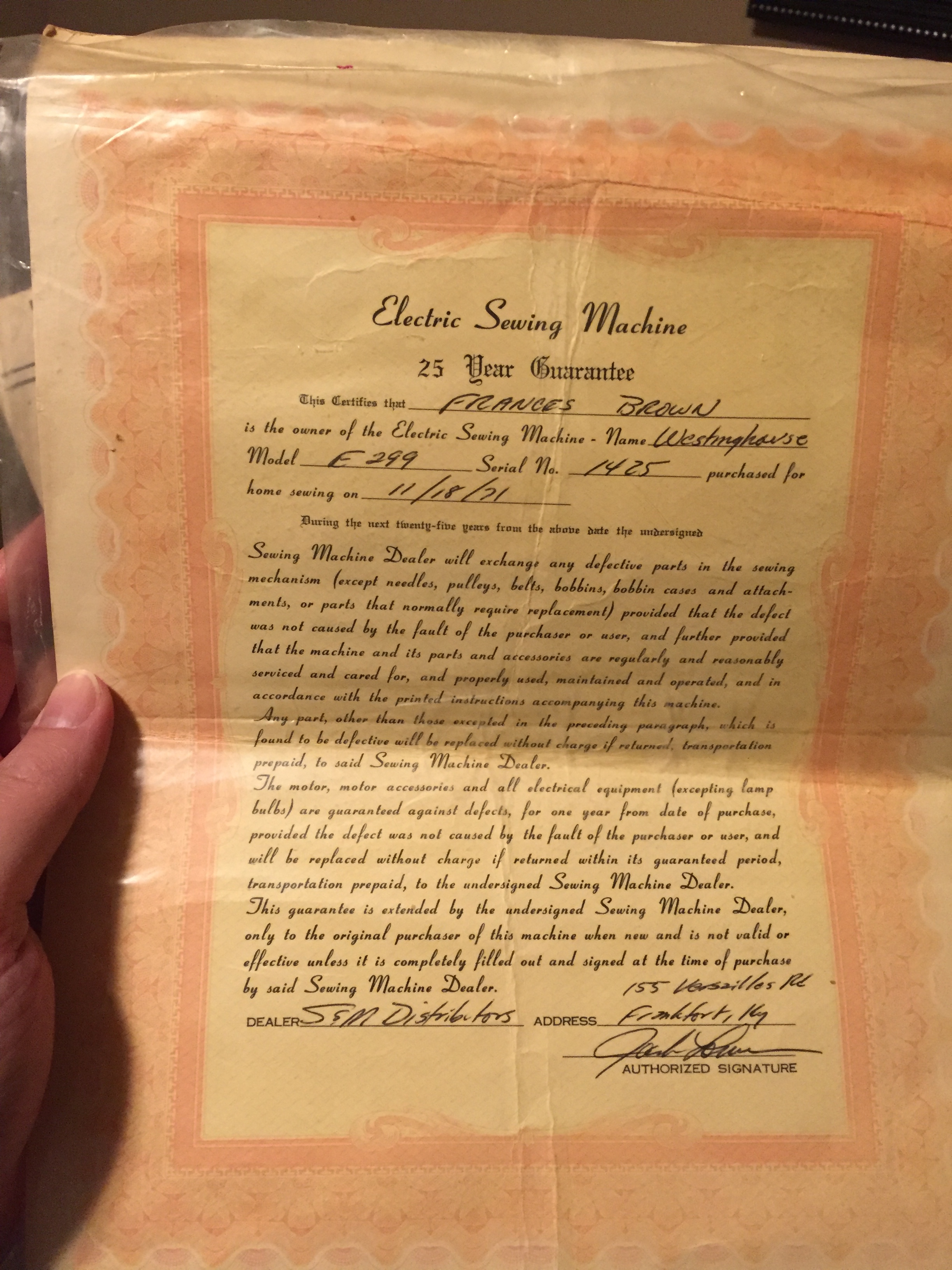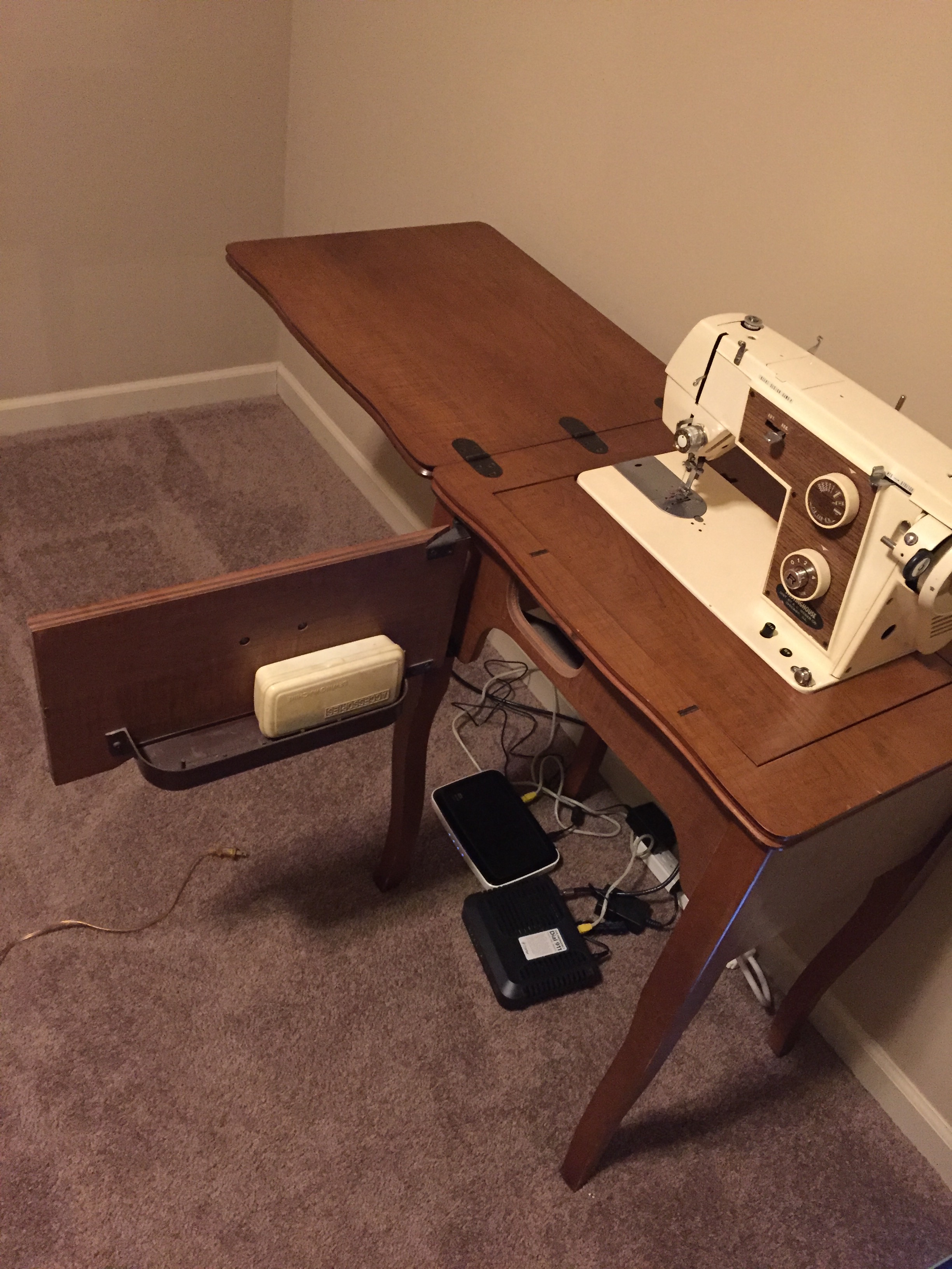 This is a Westinghouse Sewing machine in a table which says it was distbruted by A.C. Weber Co, Chicago Ill. It was purchased in 1971 and the model number is 299 and Seriel No is 1425. I have the orignal paperwork and all the accessories.