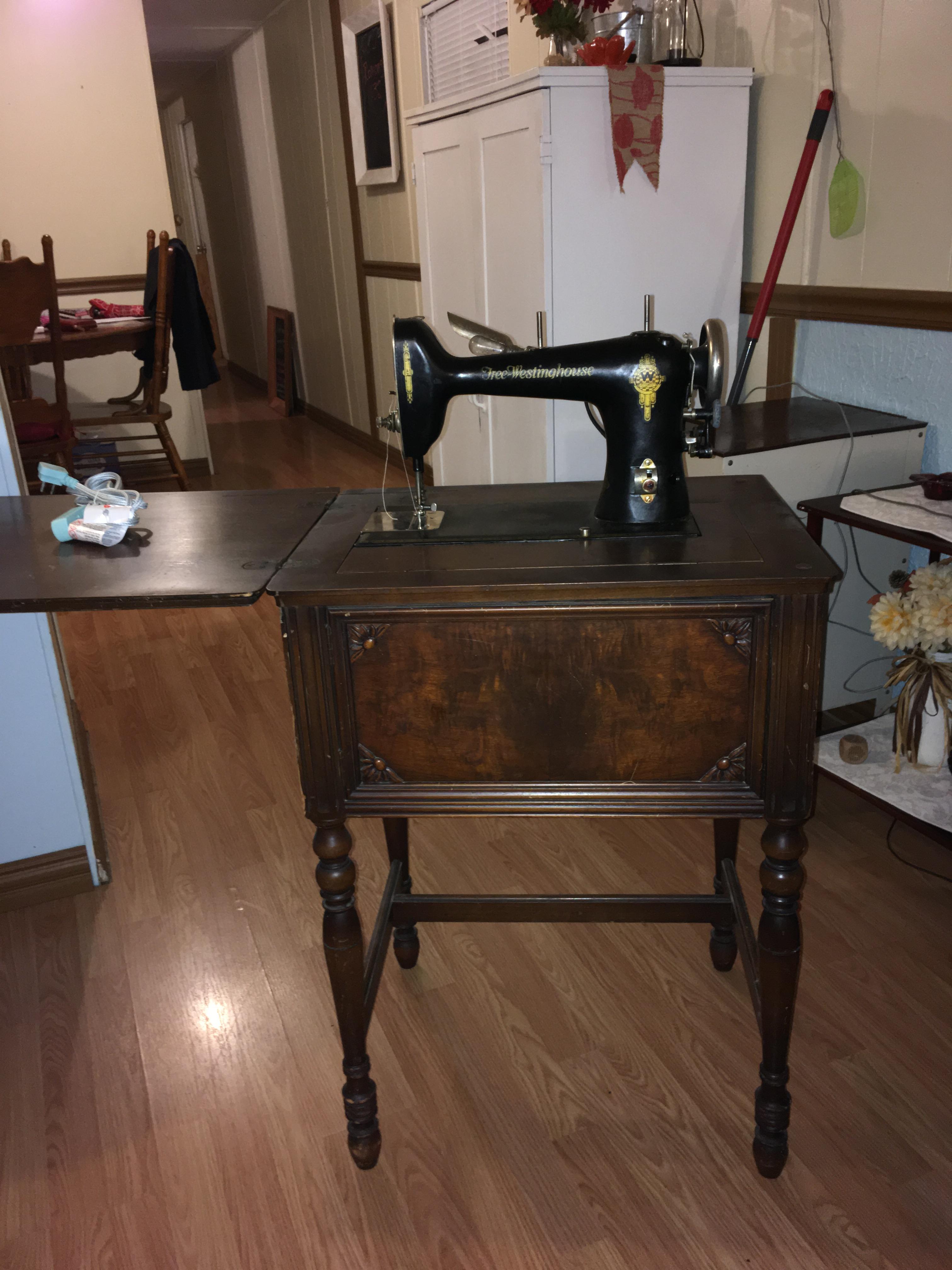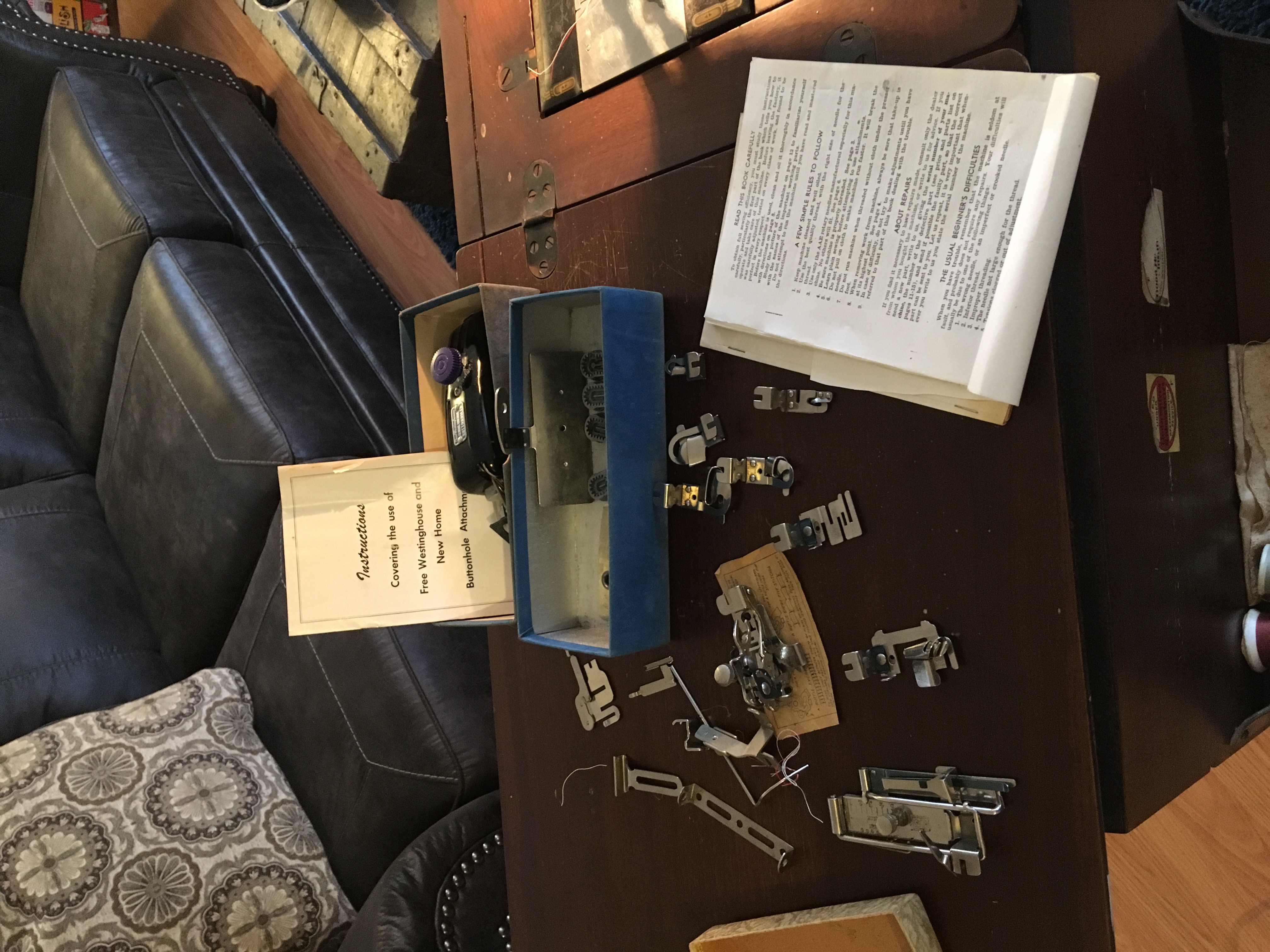 Sewing machine works and comes with several accessories. Runs with knee pedal instead of foot pedal, casing in good condition, and comes with original instruction papers.