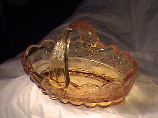 This item is a westmoreland paneled grape split handle basket in amber. I have no idea of the date or value of this item.