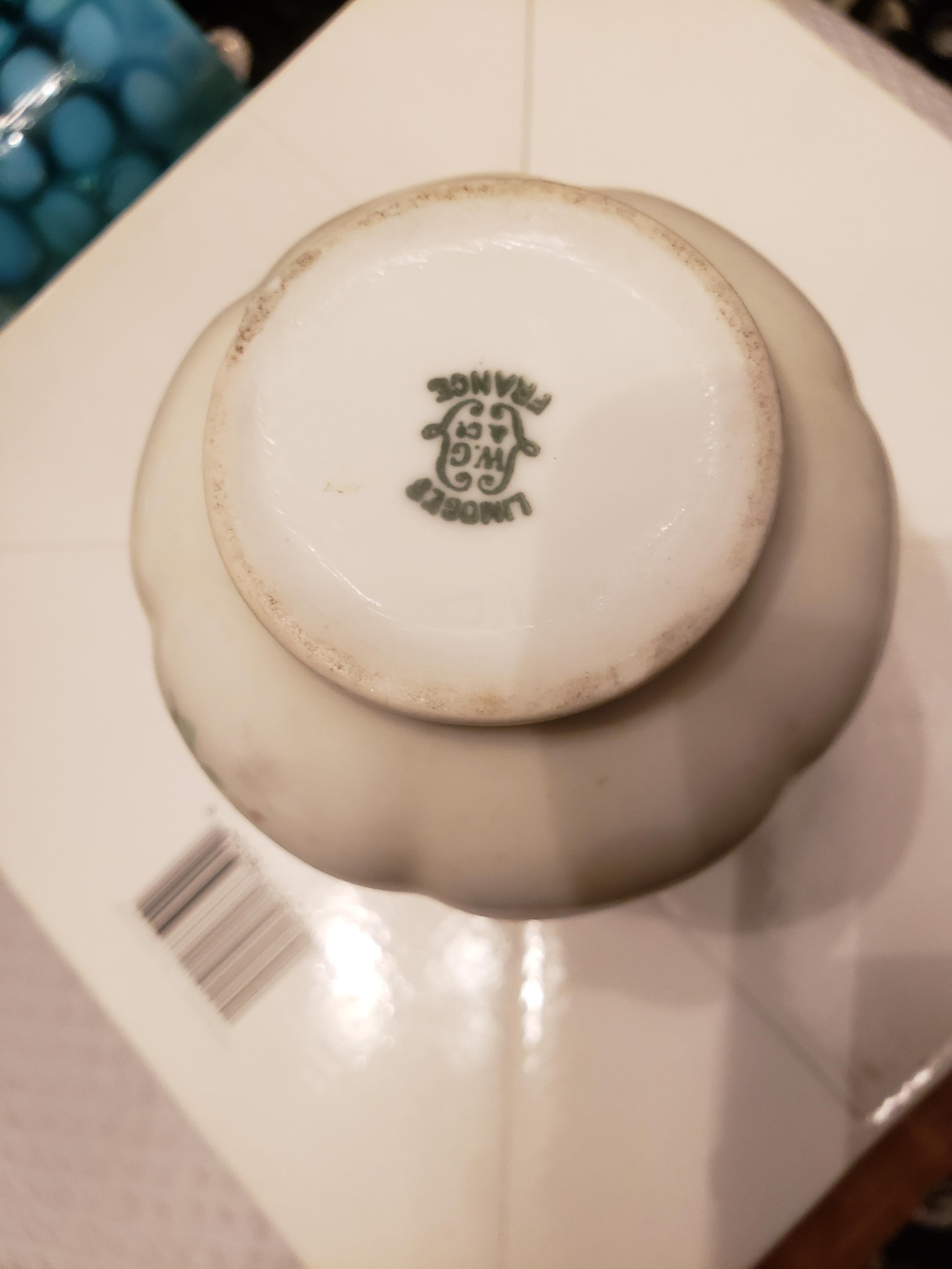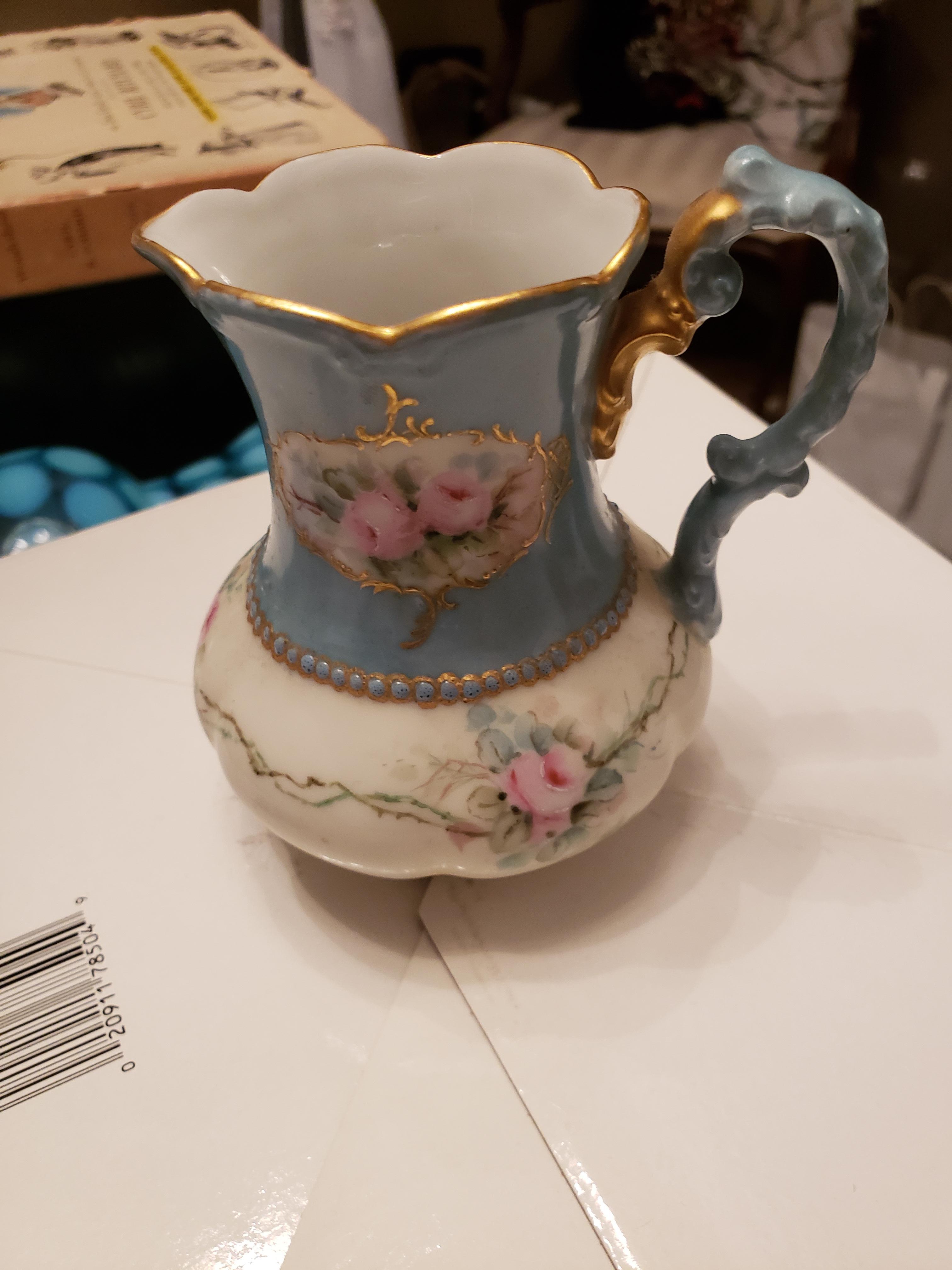 Hand painted Lamage creamer? Has the W.G marker on bottom. Blue and white with pink Rose's and gold.