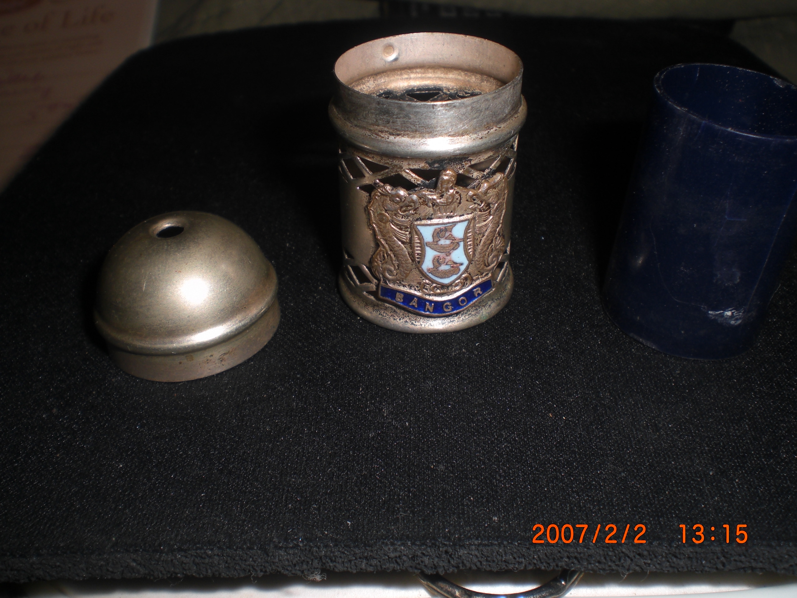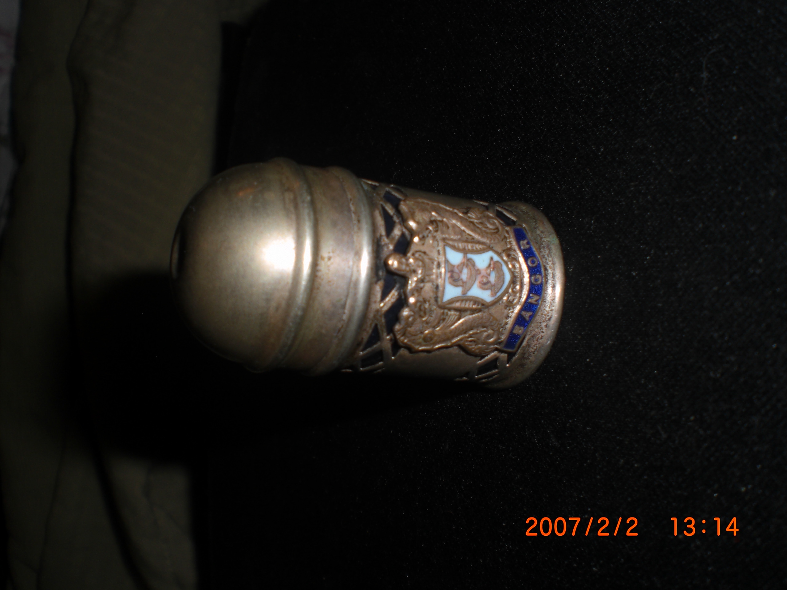 It looks like a souvenir toothpick dispenser from Bangor, County Down, Northern Ireland. The EPNS on the bottom stands for electroplated nickel silver, meaning the item has been electroplated with a very very thin layer of silver over a nickel base. As to what its purpose is, I'm guessing it's a toothpick dispenser although it might be a thread dispenser. I'm fairly certain this was meant for the tourist trade and would currently go for somewhere between $10-$25.