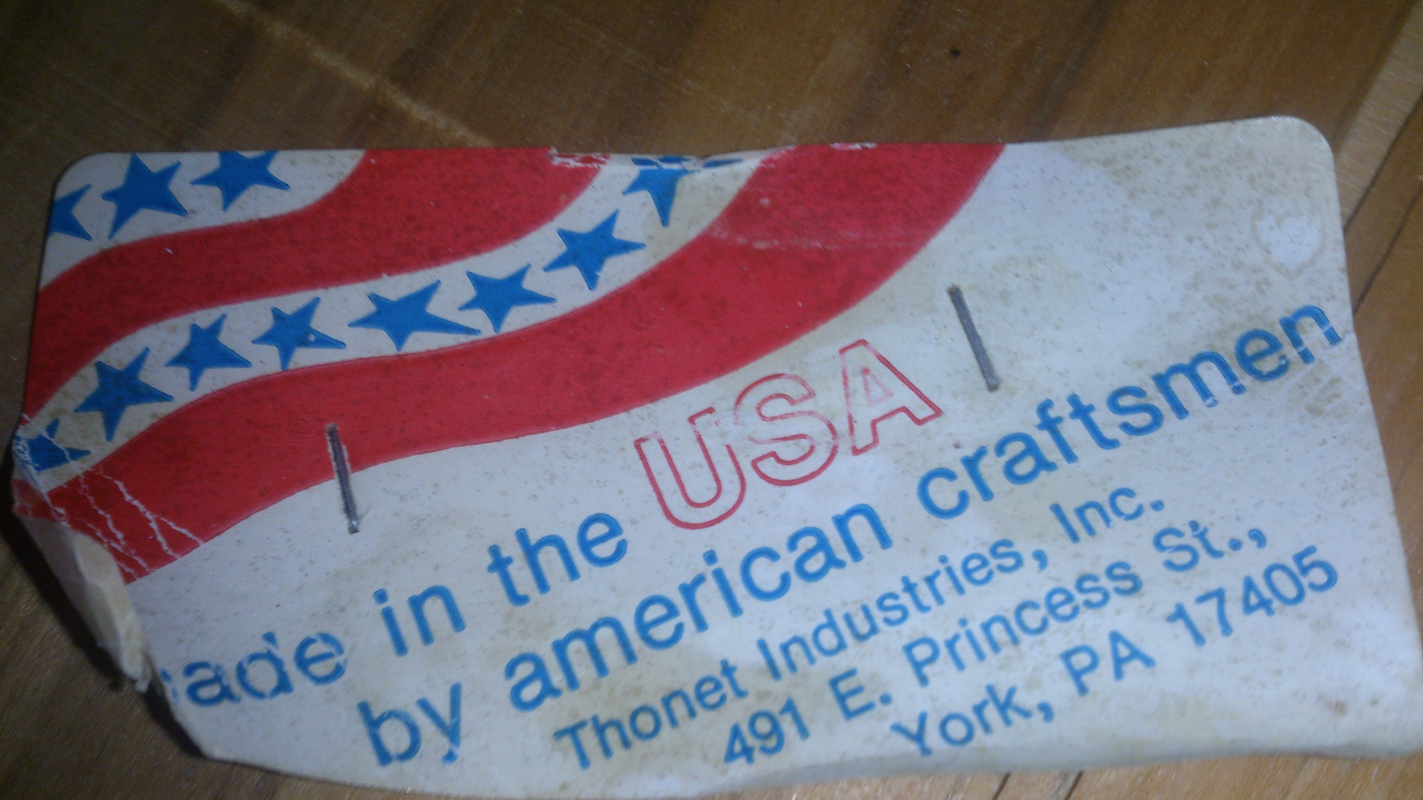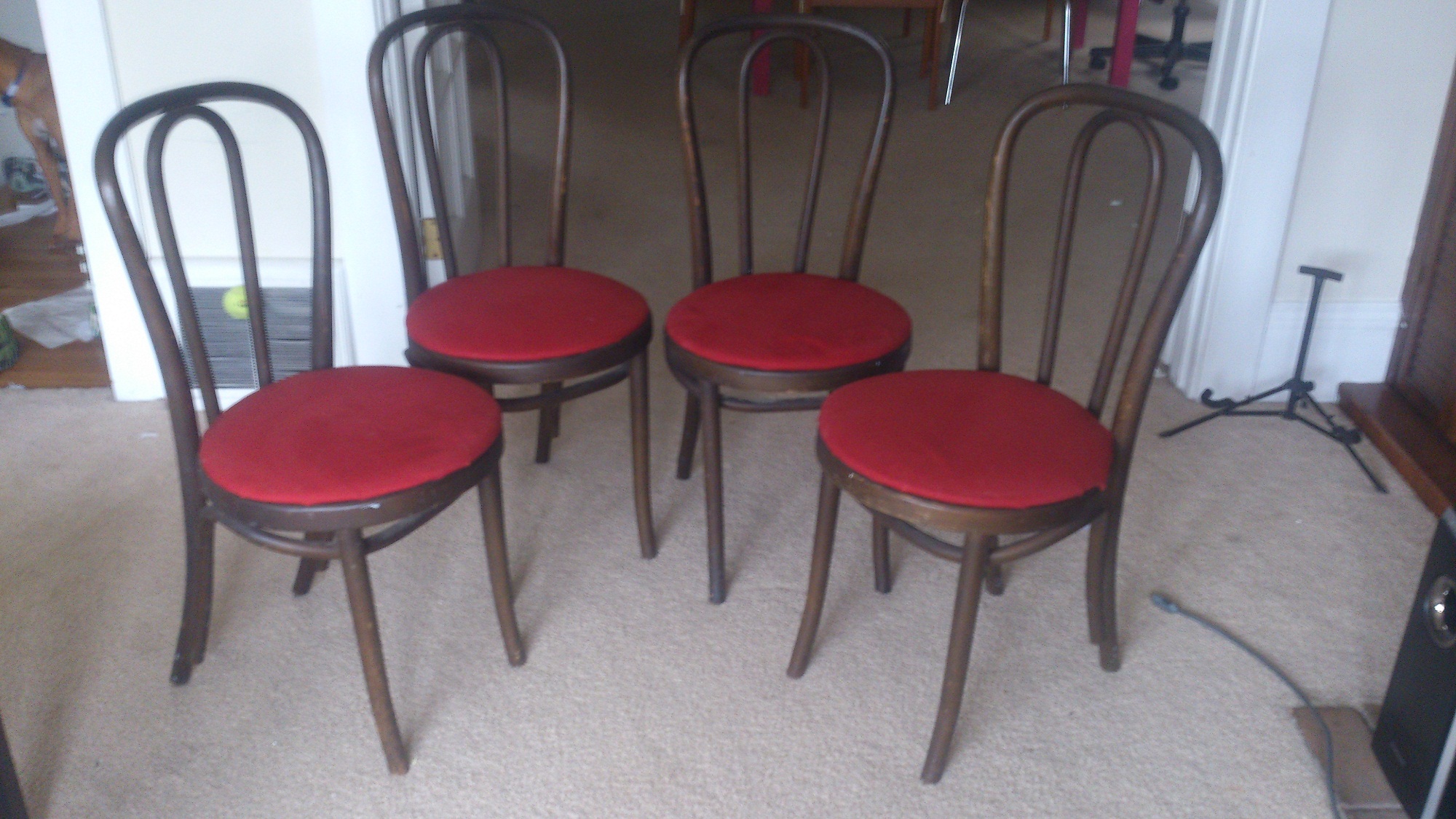 From the label and the fact that the company only moved to York in the 70s I assume they're not very old. Can anyone tell me whether they are original Thonets and are they worth anything? I don't know whether to try to sell them as is (though it looks like they have already been re-upholstered) or whether I should sand, varnish and re-uphoster them to look more unique. Any advice would be greatly appreciated. Thanks.