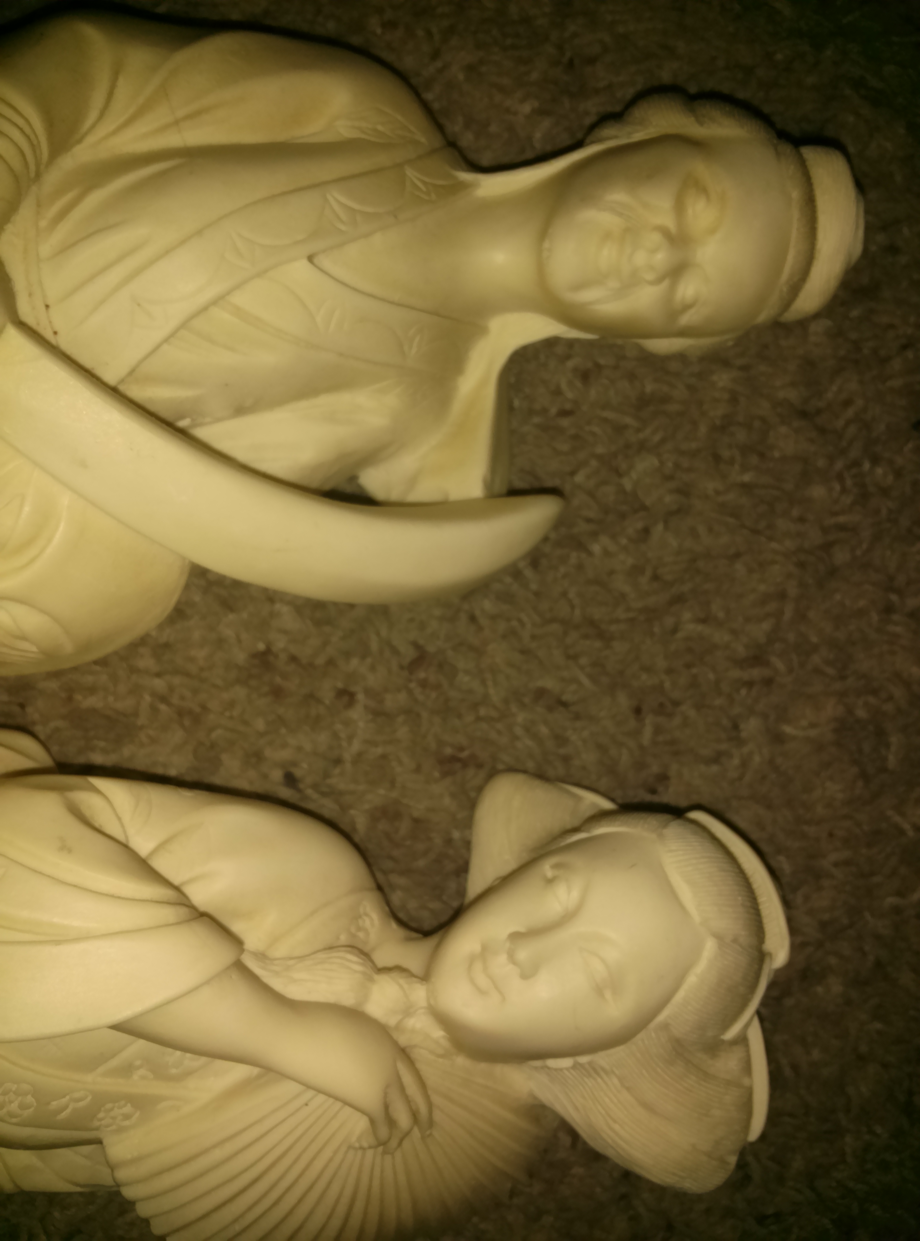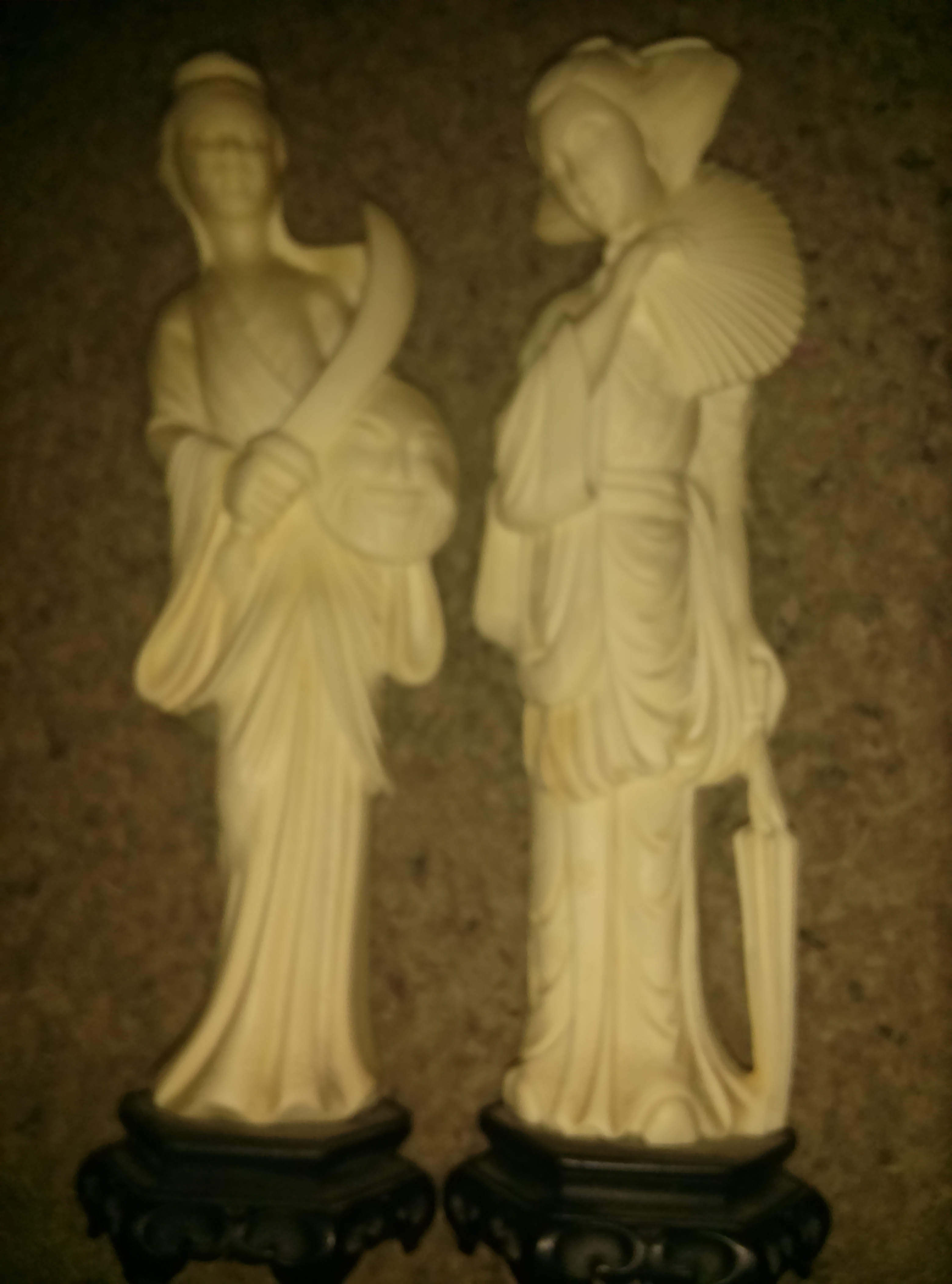 I was given these statues (a geisha and a samaurai) shortly before a very close mentor of mnd passed...he was and auctioneer and antique dealer for thirty years...and a collector for much longer...they are obviously hand carved...lots of detail...no seems so definitely not from a mold...ive seen similar statues that are bone or even ivory...but nvr identical...