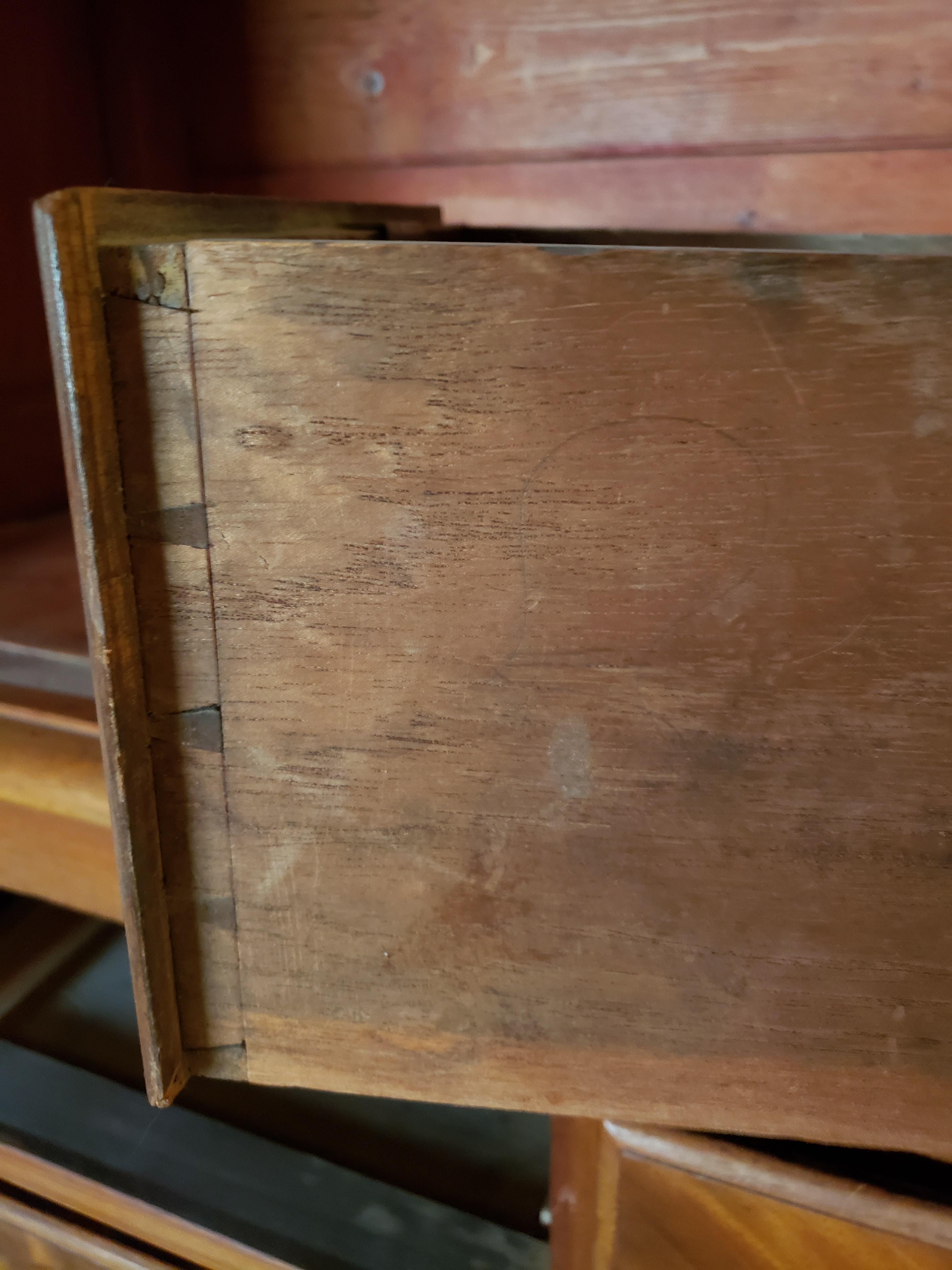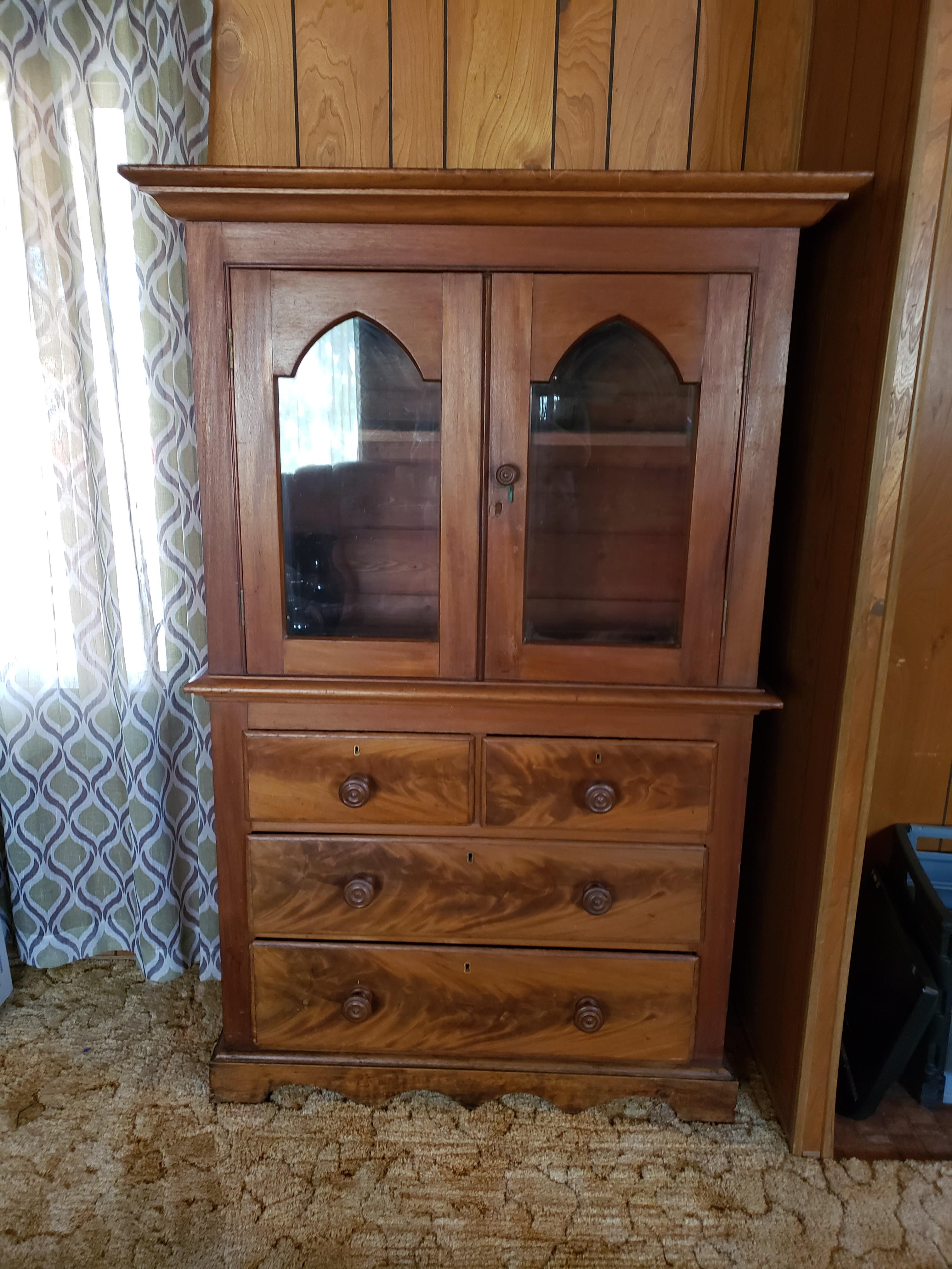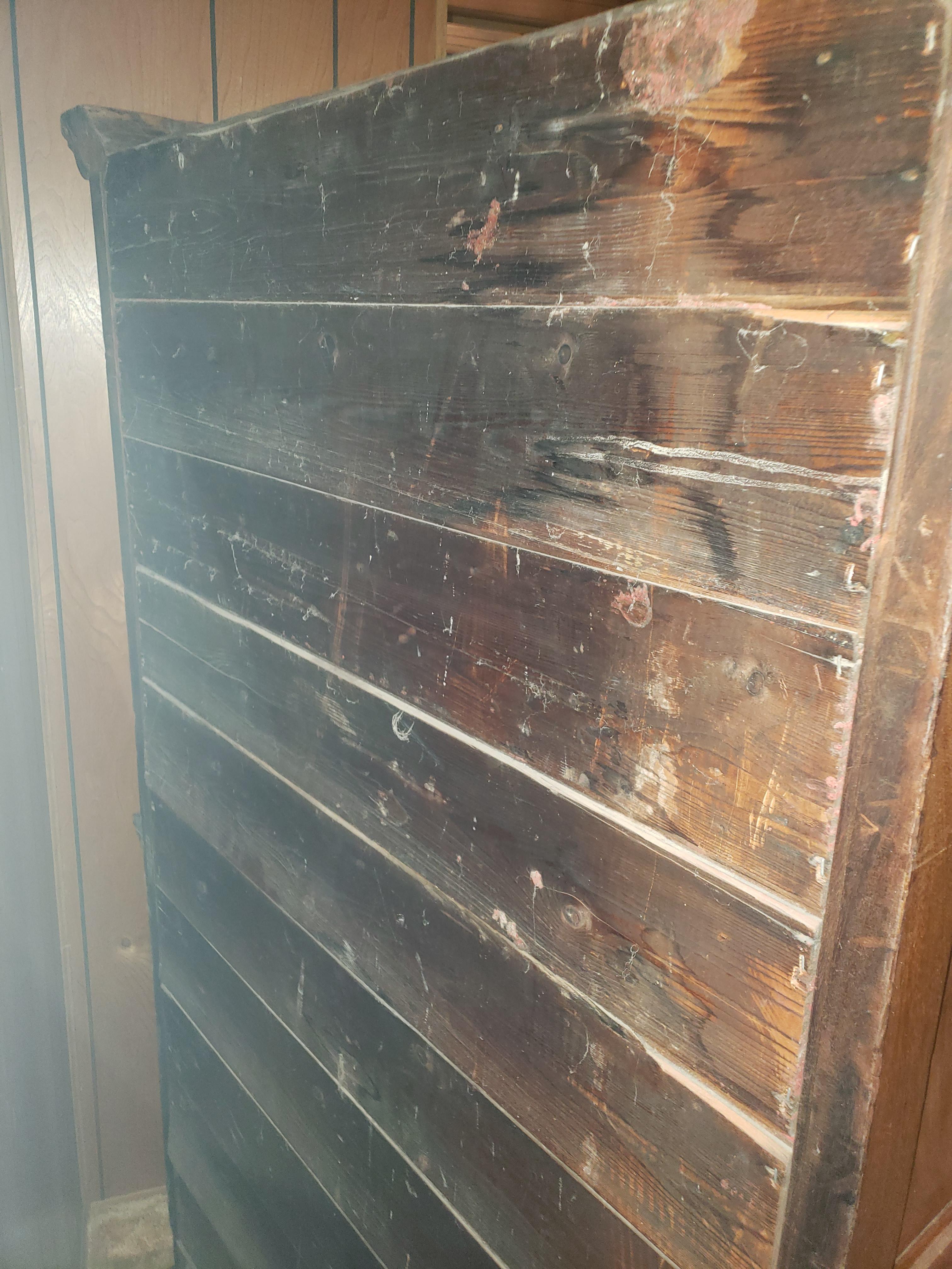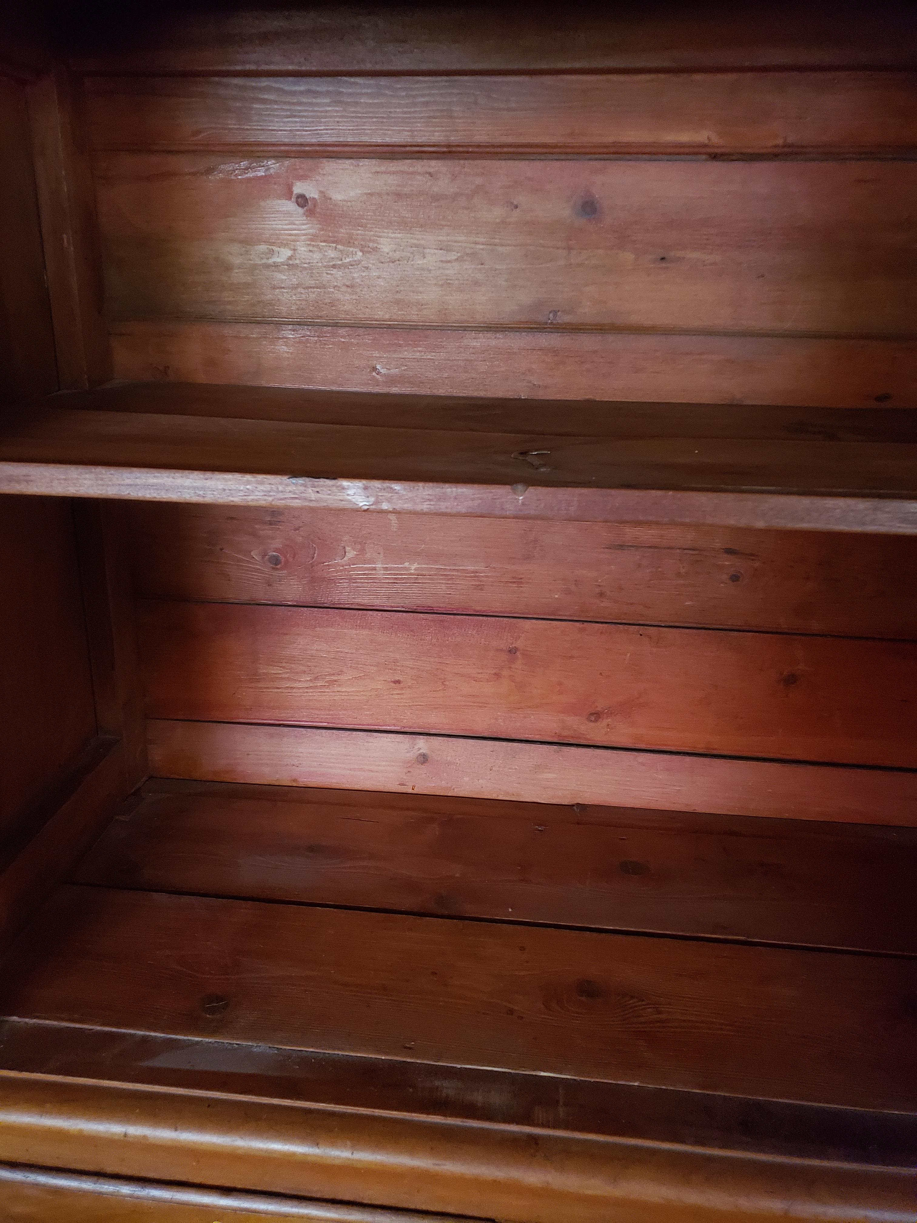 Antique solid wood hutch/Dresser. 2 shelves in top section, 4 drawers in bottom section. No mark or paperwork